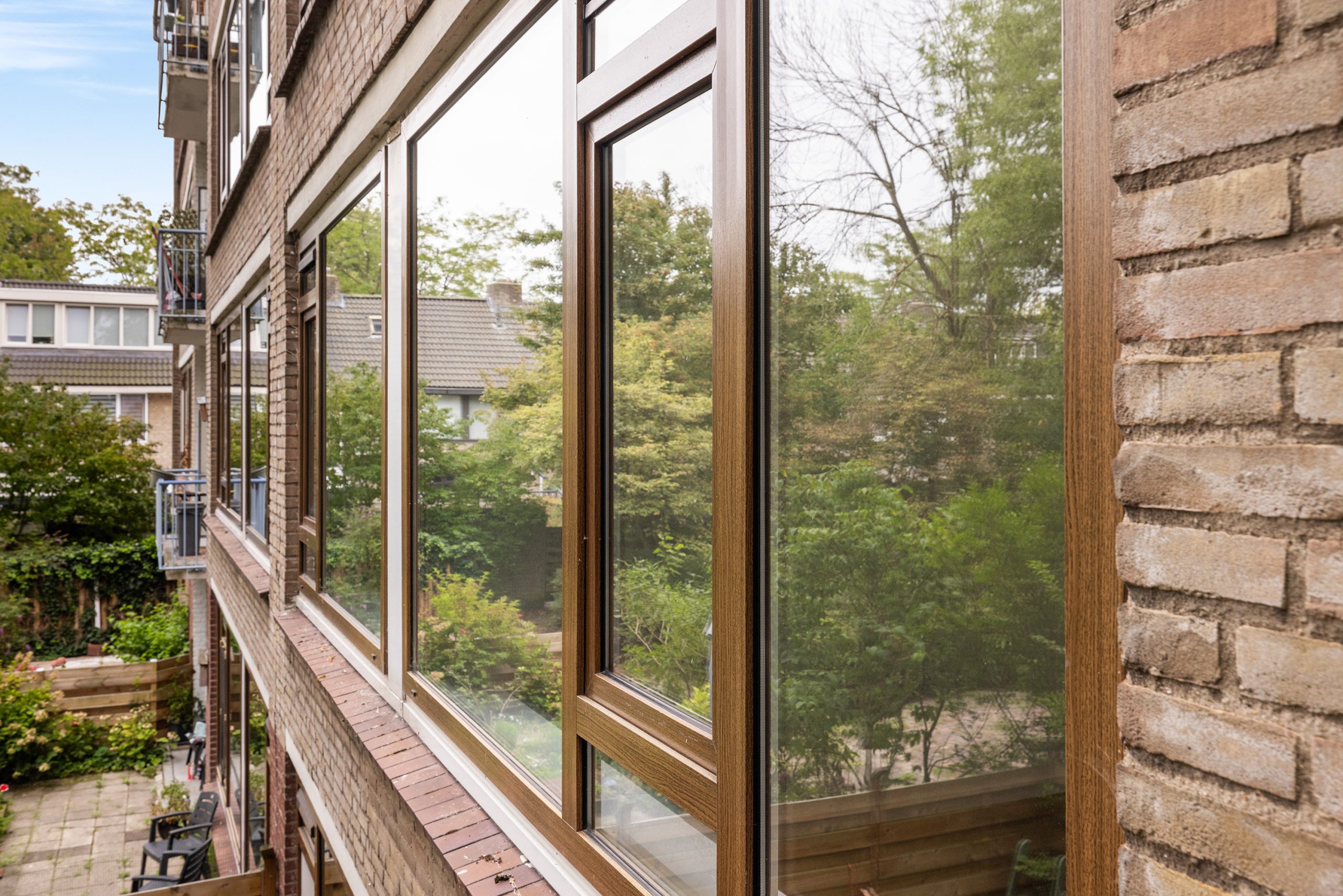 Volledig dubbel glas in deels houten en deels kunststof kozijnen.