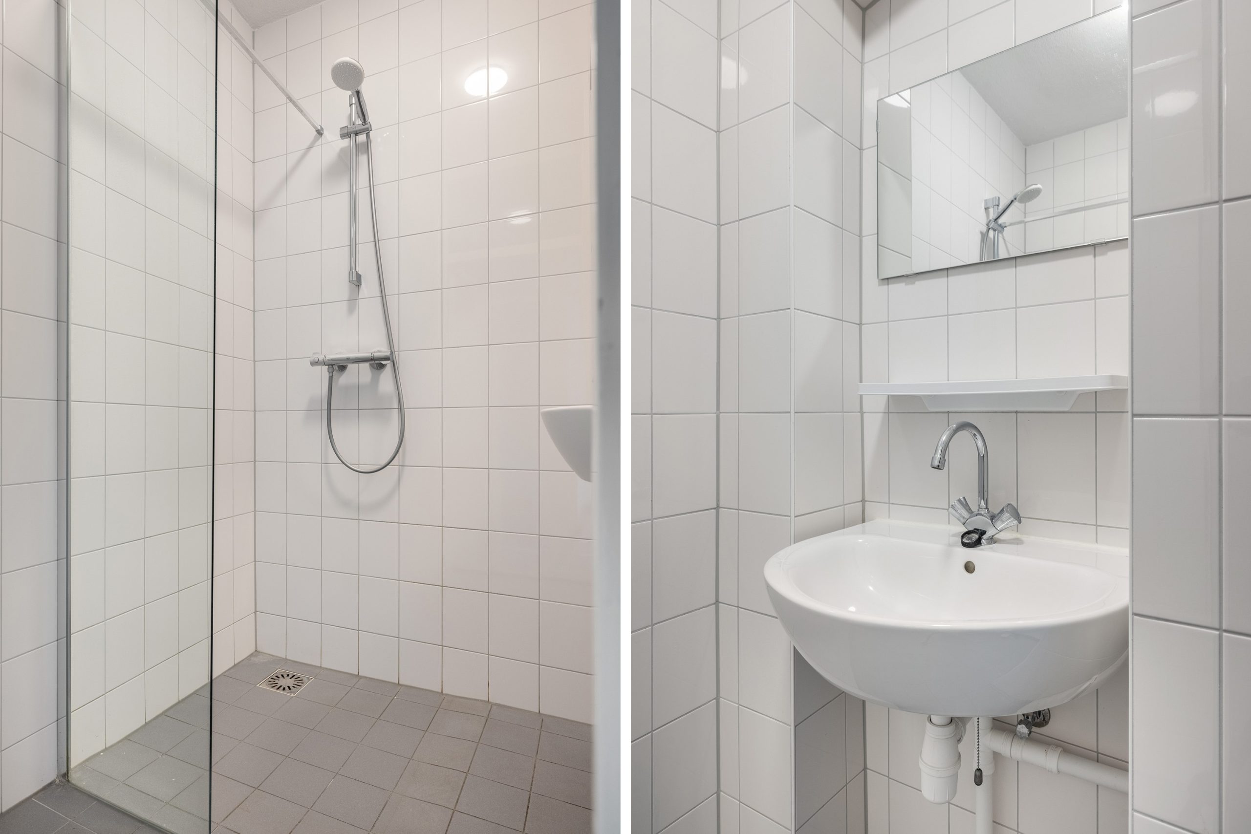 De badkamer is ook net nieuw geplaatst en voorzien van een inloopdouche, thermostaatkraan en wastafel, geheel wit betegelde wanden.