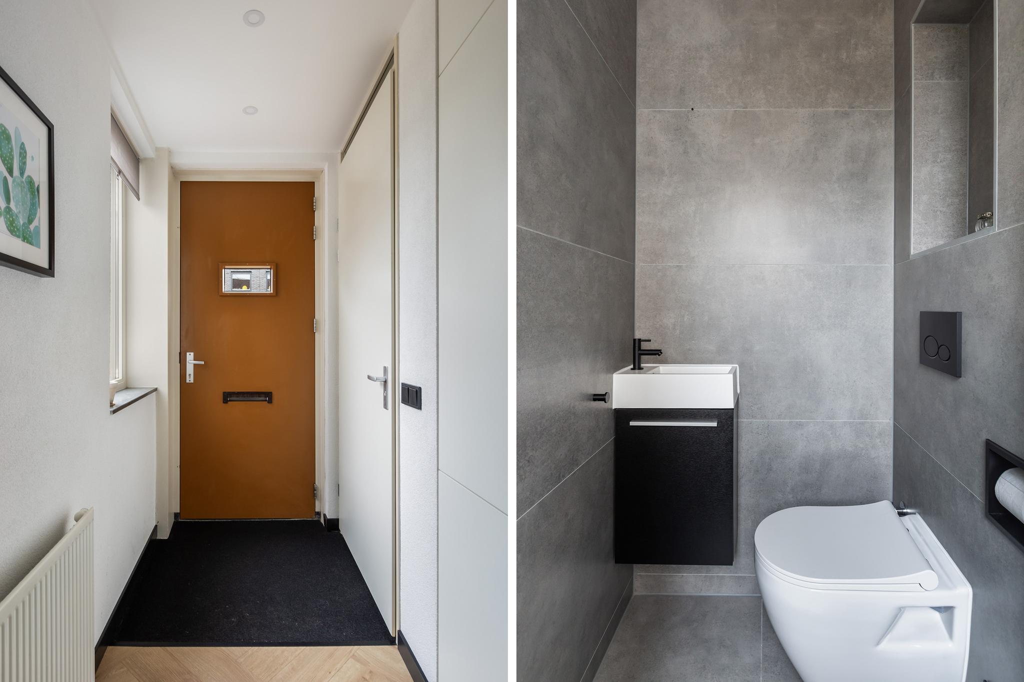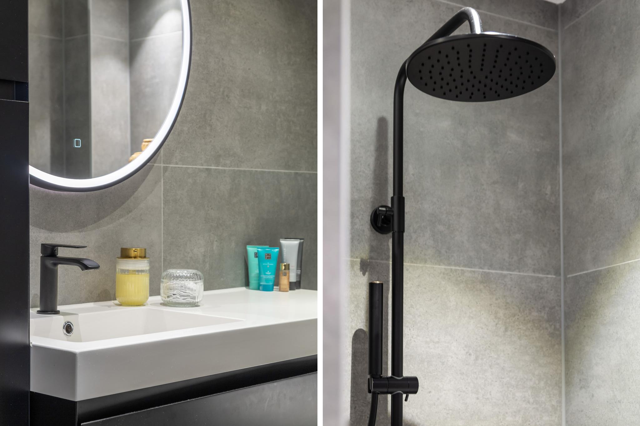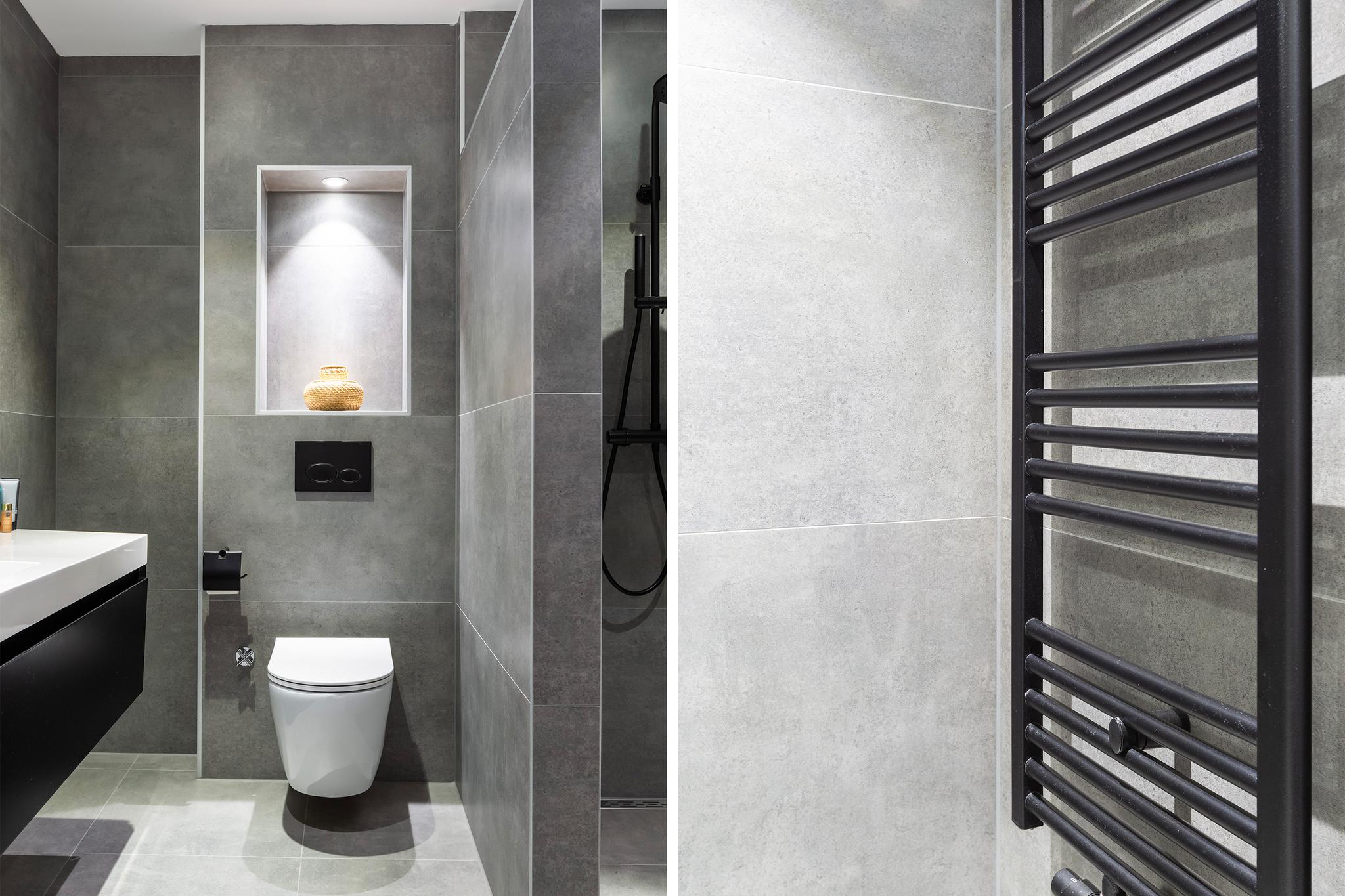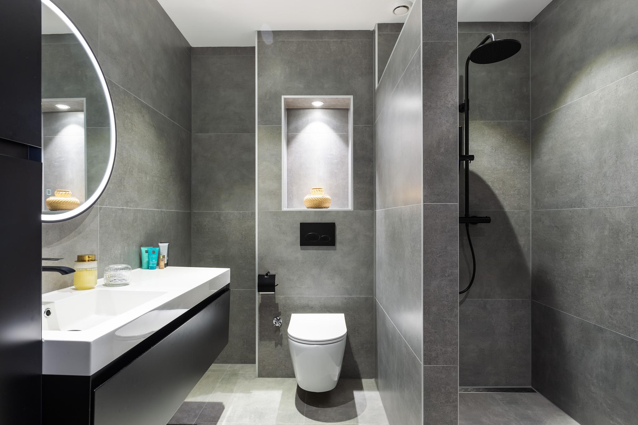 Ook de badkamer is modern en strak afgewerkt. Deze is in 2021 vernieuwd, volledig betegeld en voorzien van een ruime inloopdouche met thermostaatkraan, wastafel op meubel, grote ronde spiegel met verlichting en verwarming, toilet en designradiator.