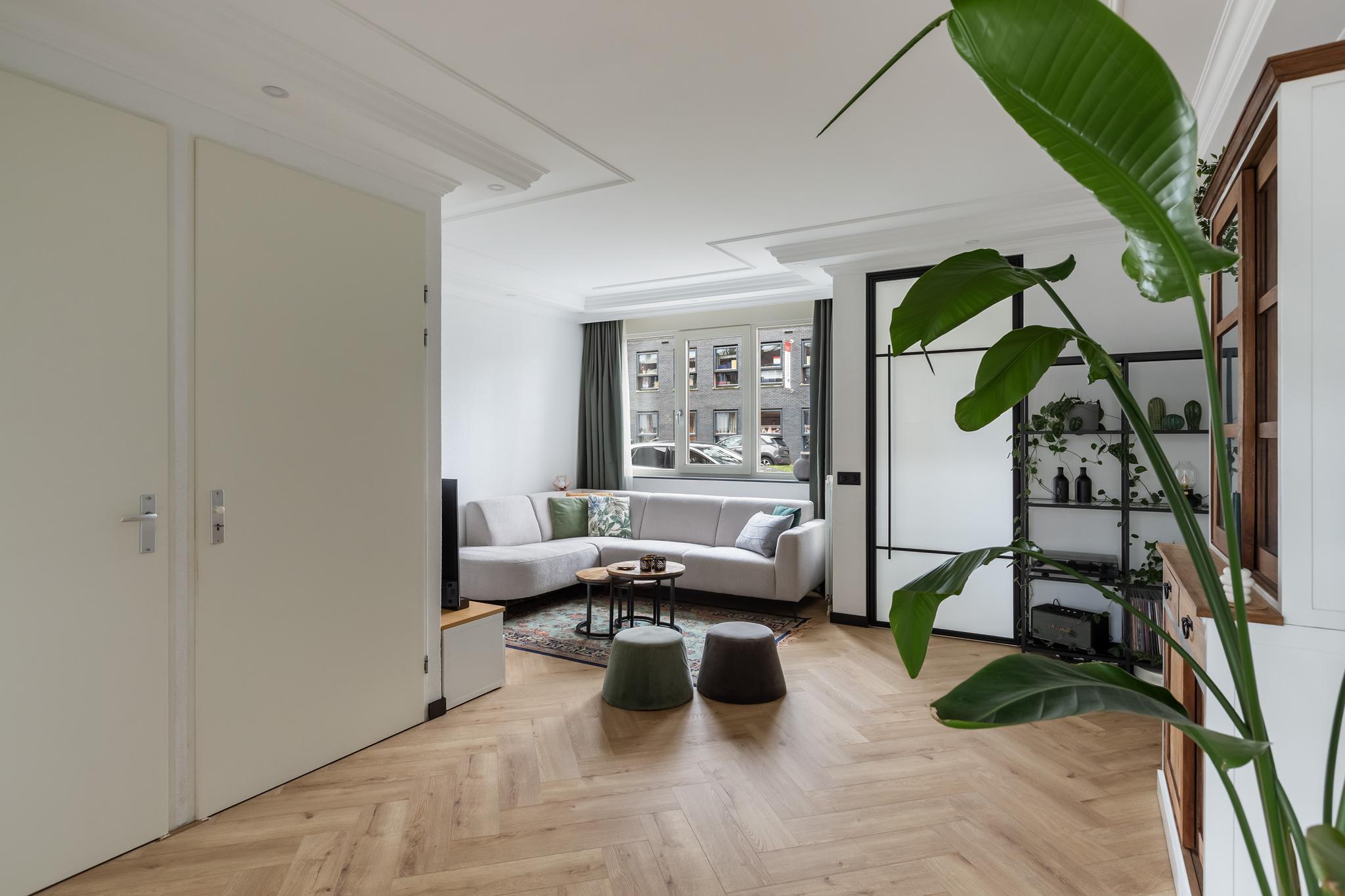 Via een prachtige stalen deur kom je in de ruime woonkamer aan de voorzijde van de woning. De woonkamer is voorzien van een mooie visgraat laminaat vloer, sierlijsten en inbouwspots. Daarnaast beschikt de woonkamer over een zeer ruime trapkast voor al je voorraden, de stofzuiger en alles wat je nog meer kwijt wilt. De trap naar de verdieping is middels een deur af te sluiten.
