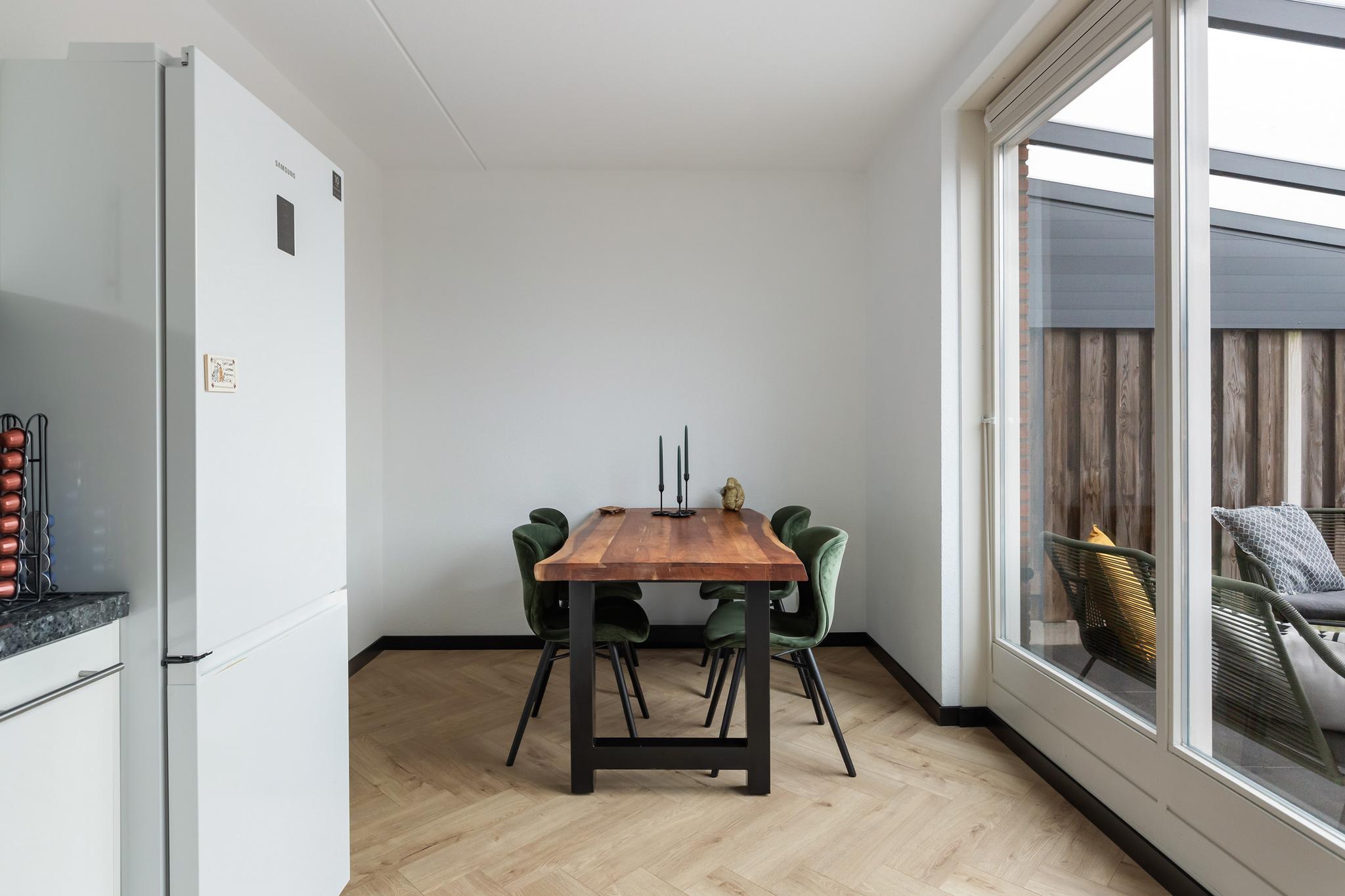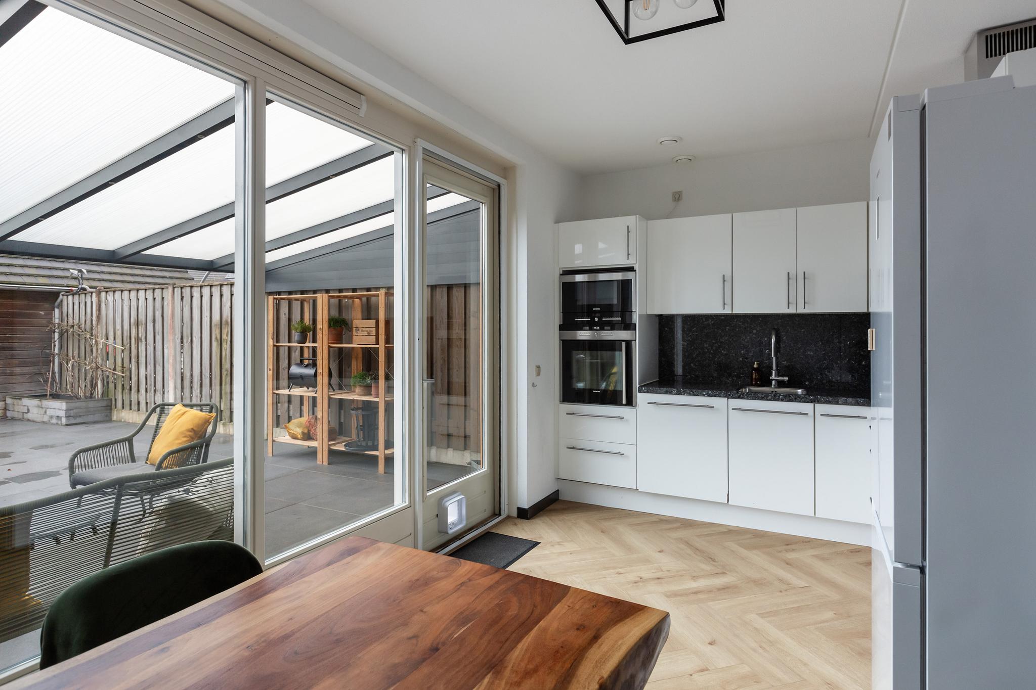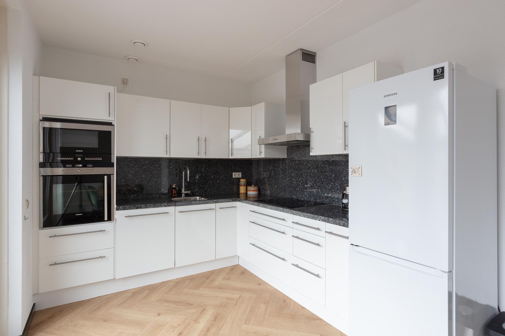 Vanuit de woonkamer is de aparte keukenruimte aan achterzijde bereikbaar, met grote keuken in hoekopstelling en de deur naar de achtertuin. De keuken beschikt over een keramische kookplaat, afzuigkap, oven, magnetron, vaatwasser en lekker veel bergruimte. Zie jij liever de woonkamer en keuken gecombineerd? De ruimtes kunnen worden samengevoegd, waarmee je een grote doorzon woonkamer met open keuken kan creëren!