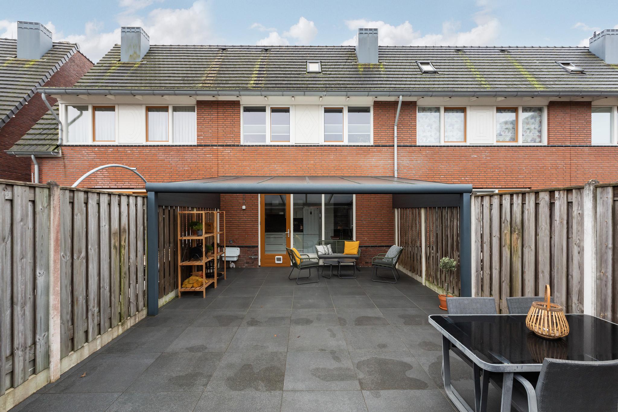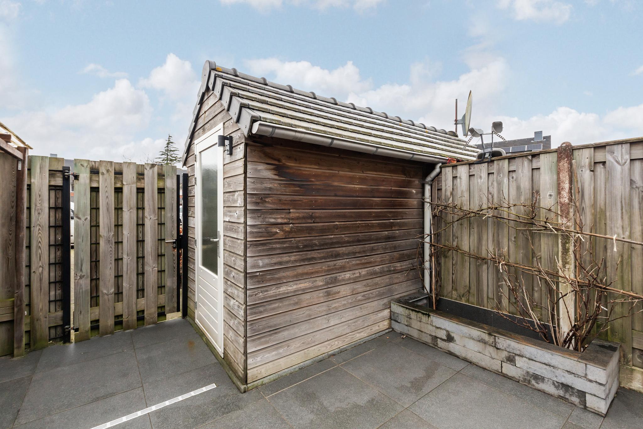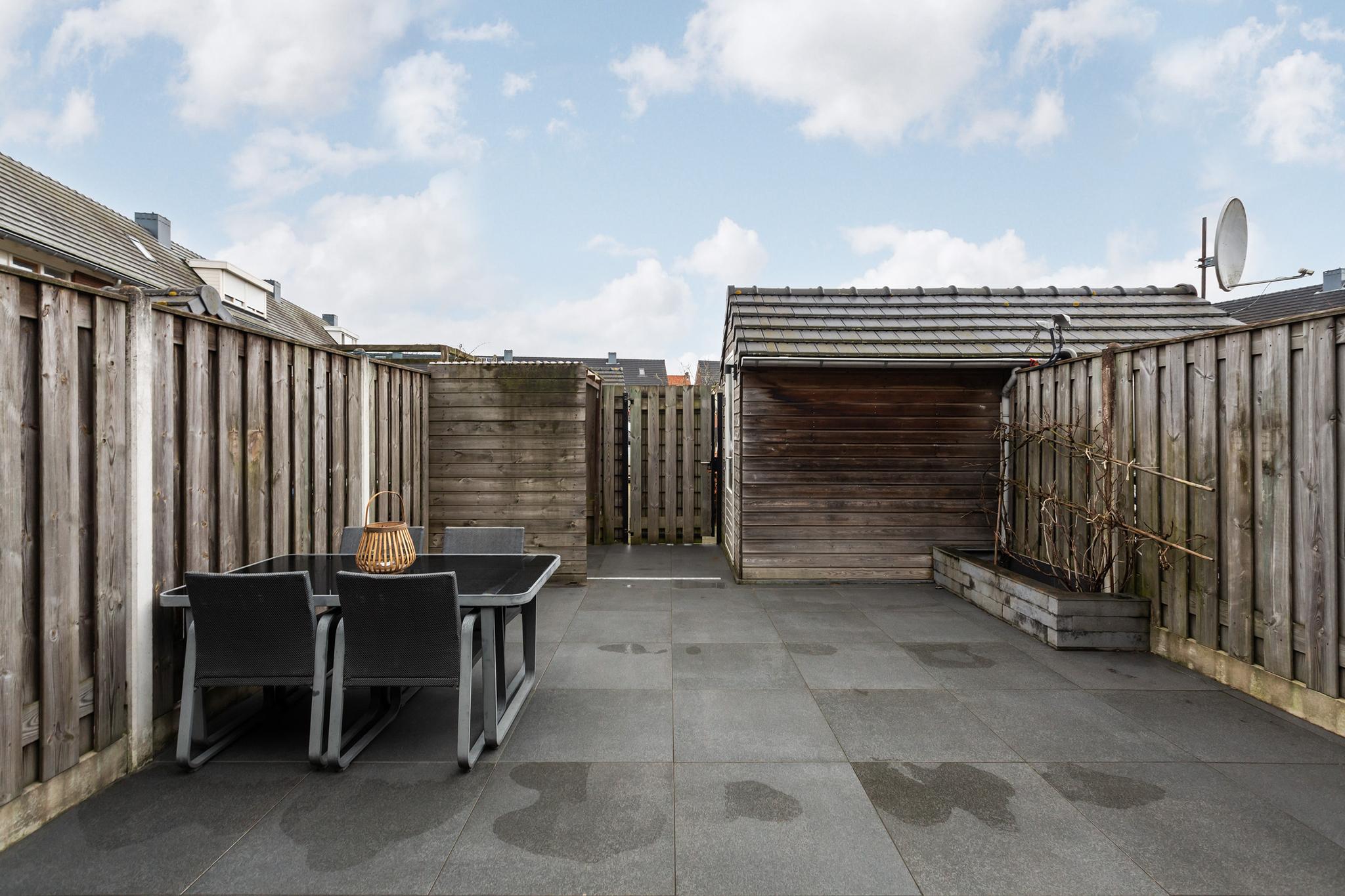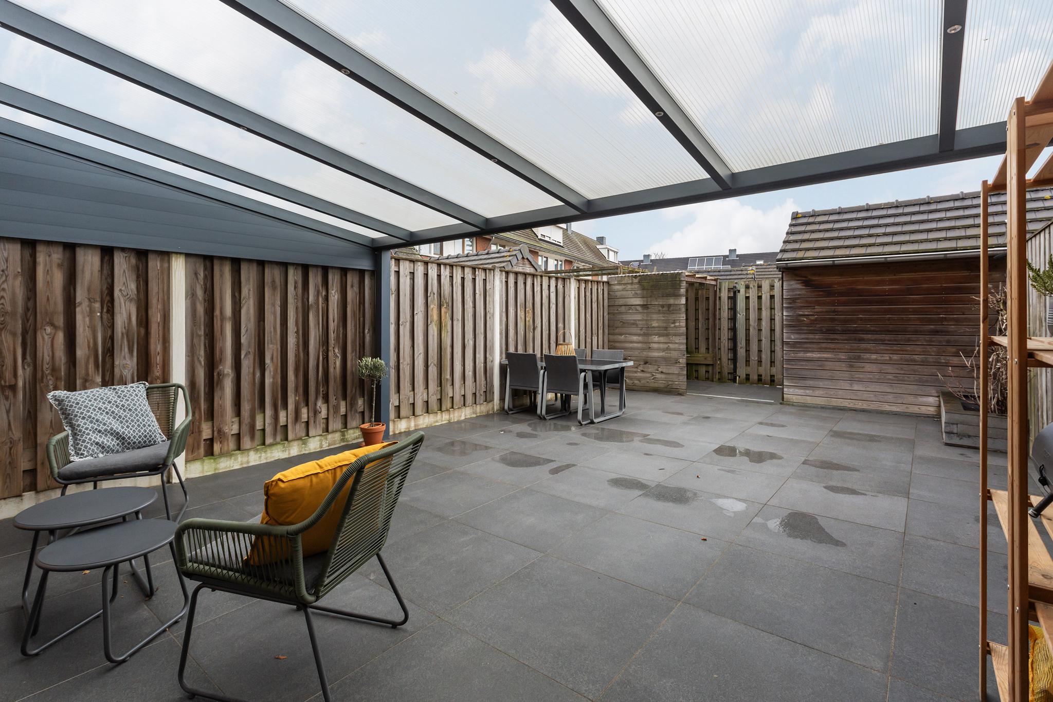 En dan de tuin in! Direct aan de woning vast bevindt zich een prachtige overkapping, voorzien van inbouwverlichting. Echt een uitbreiding van je woonruimte waar je heerlijk droog en warm (evt. met toevoeging van een heater) kunt vertoeven! De tuin is gelegen op het noorden en is voorzien van keramische tegels, een vast perk en een vrijstaande berging achterin de tuin. Via de achterom sta je direct bij je eigen parkeerplaats op het achterterrein, dat is toch ideaal?