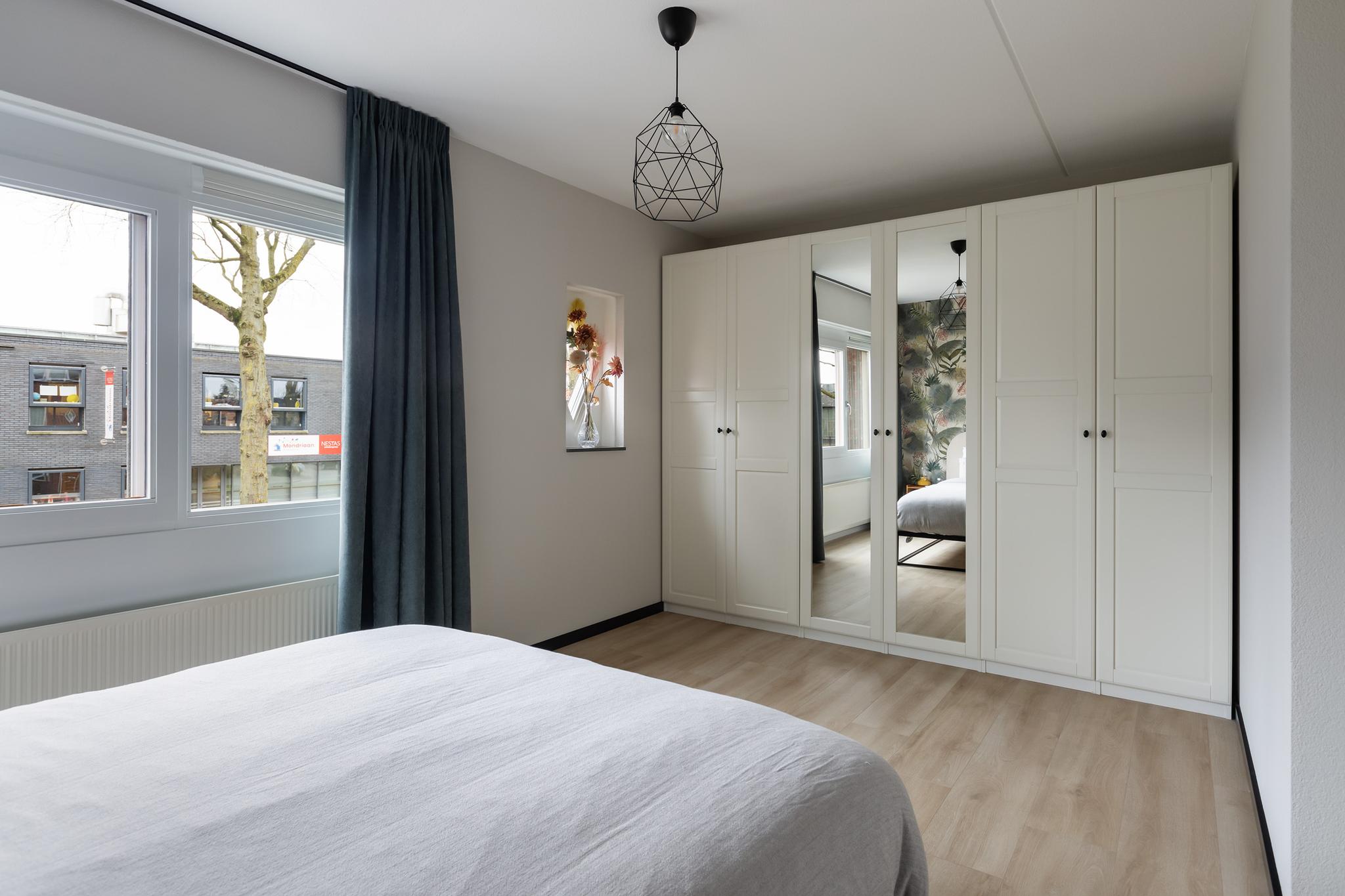 Slaapkamer aan voorzijde met nette laminaatvloer, spagtelputz wandafwerking en een grote kastenwand.