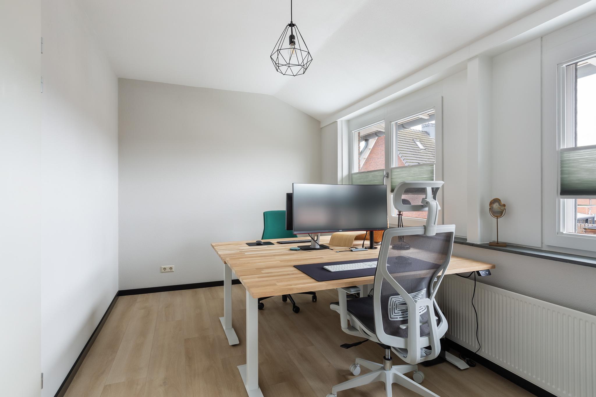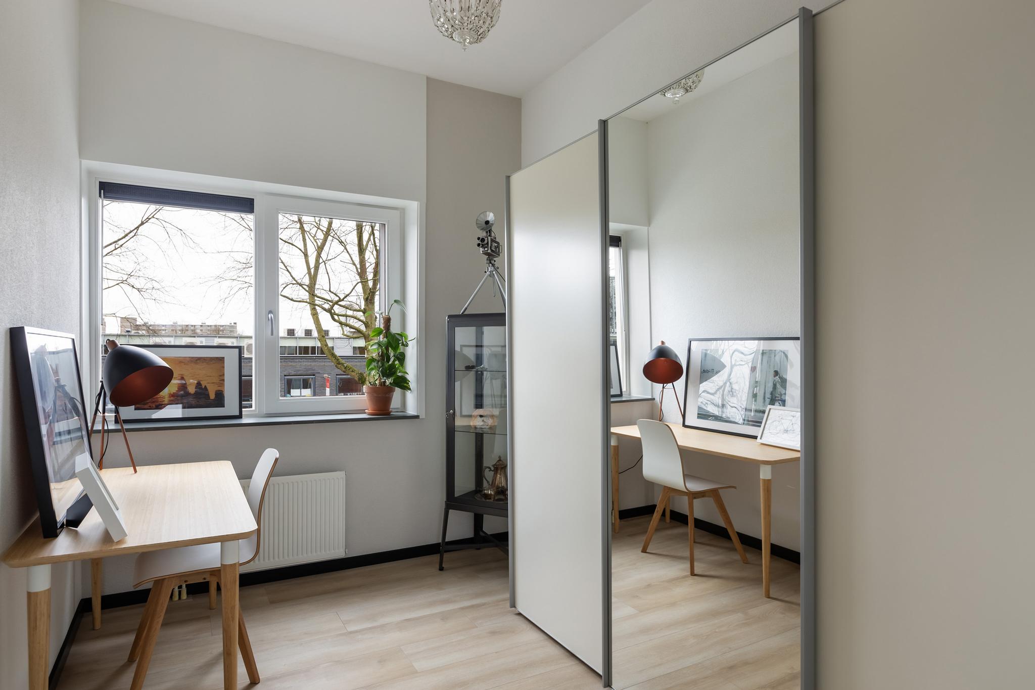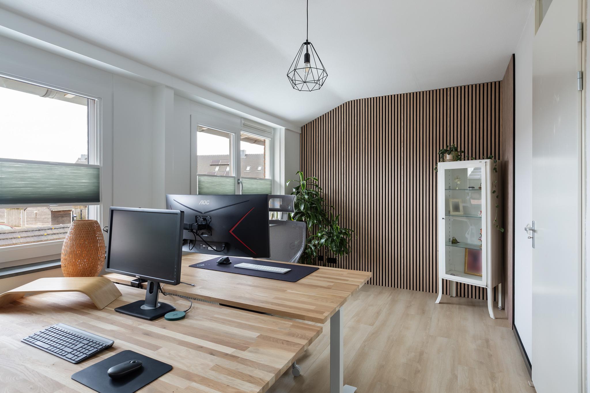 Aan achterzijde bevindt zich eveneens een grote slaapkamer, deze kamer wordt momenteel als duo-kantoorruimte gebruikt. Ook deze ruimte is flink onder handen genomen en voorzien van een mooie laminaatvloer, plissé raambekleding en een sfeervolle lattenwand aan zijkant.