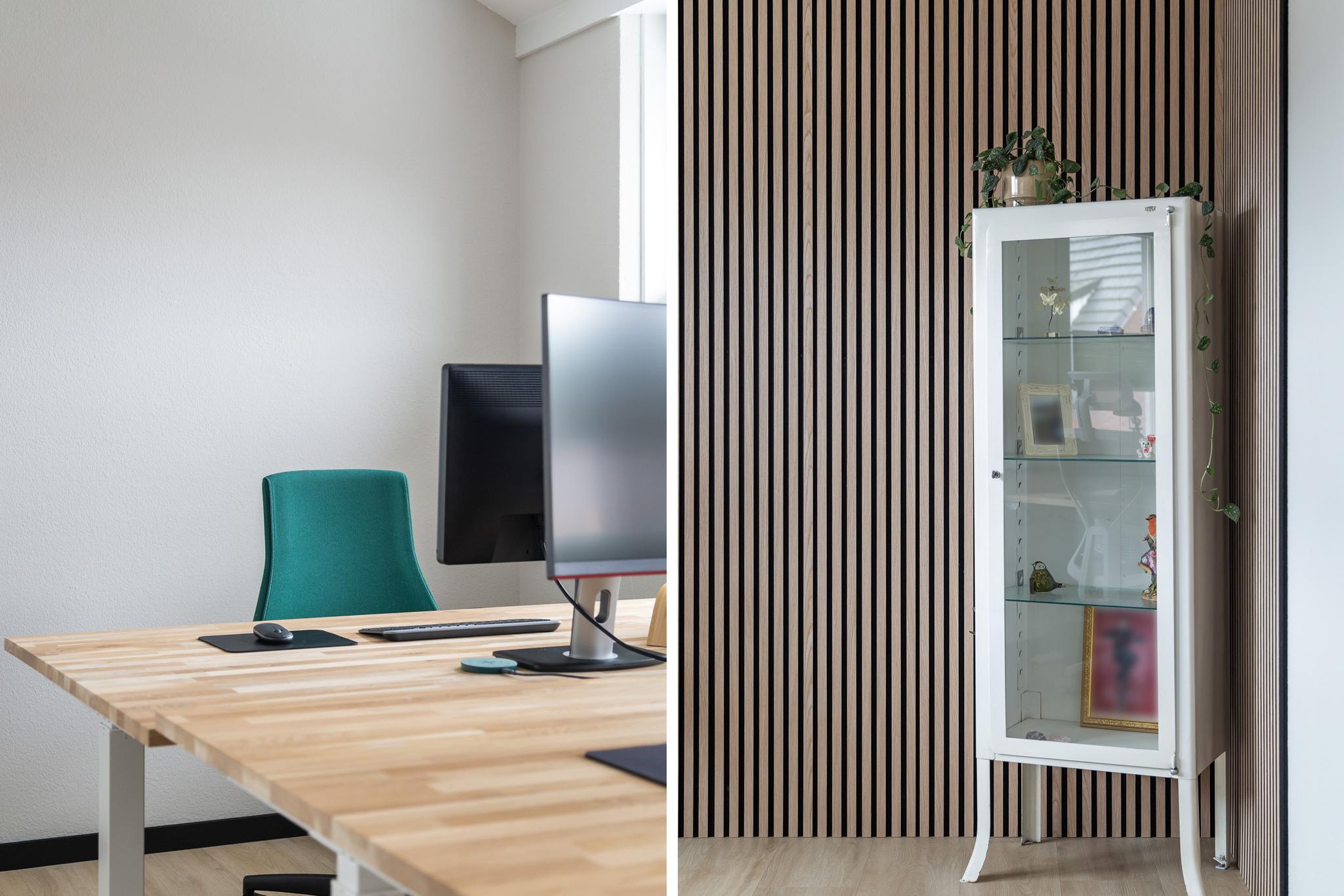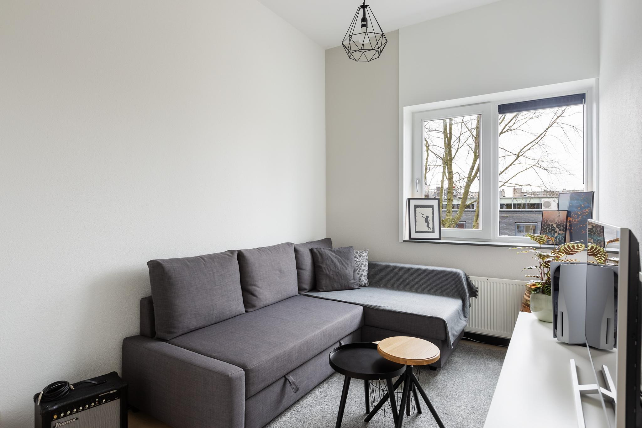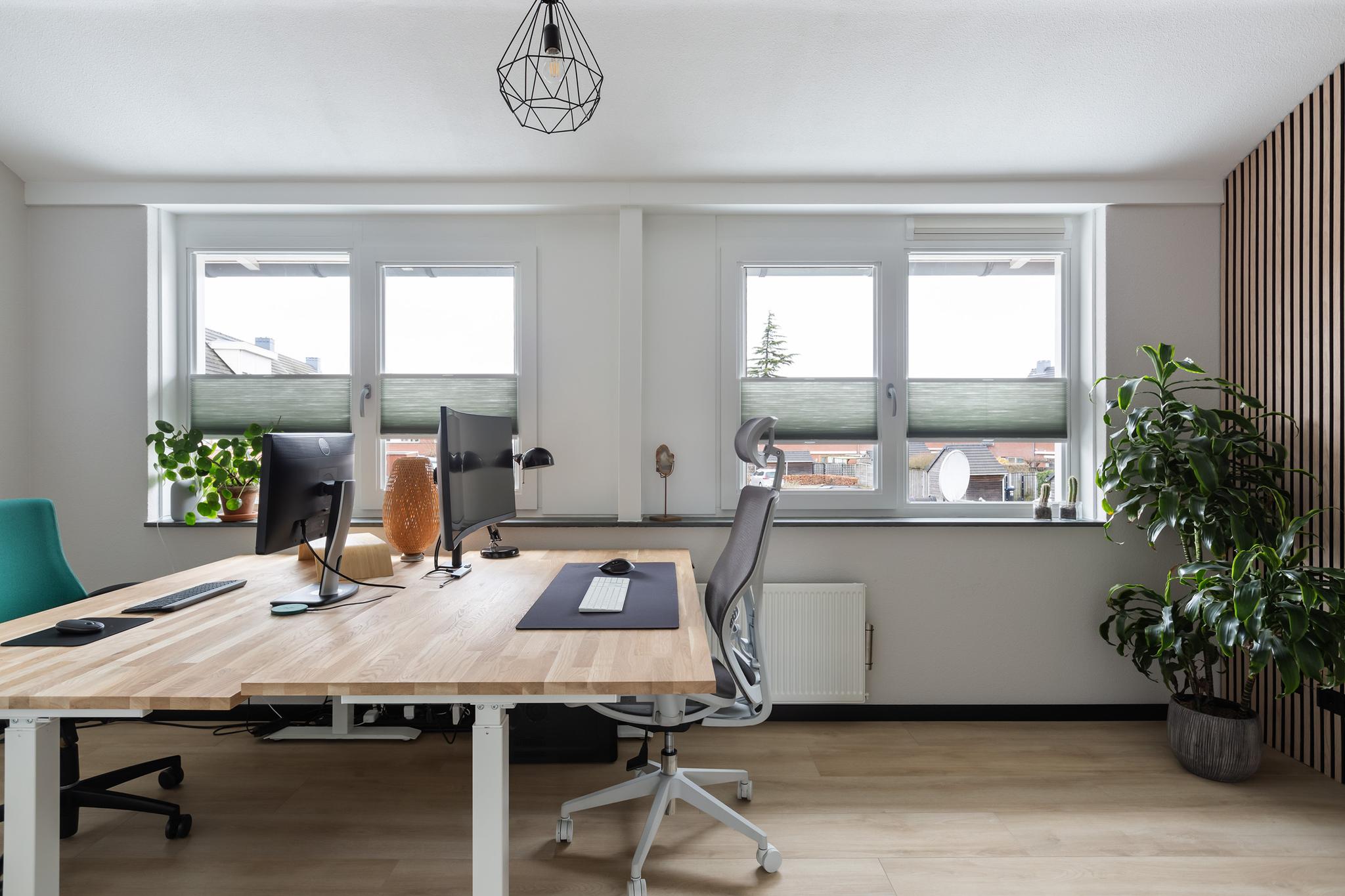Aan achterzijde bevindt zich eveneens een grote slaapkamer, deze kamer wordt momenteel als duo-kantoorruimte gebruikt. Ook deze ruimte is flink onder handen genomen en voorzien van een mooie laminaatvloer, plissé raambekleding en een sfeervolle lattenwand aan zijkant.