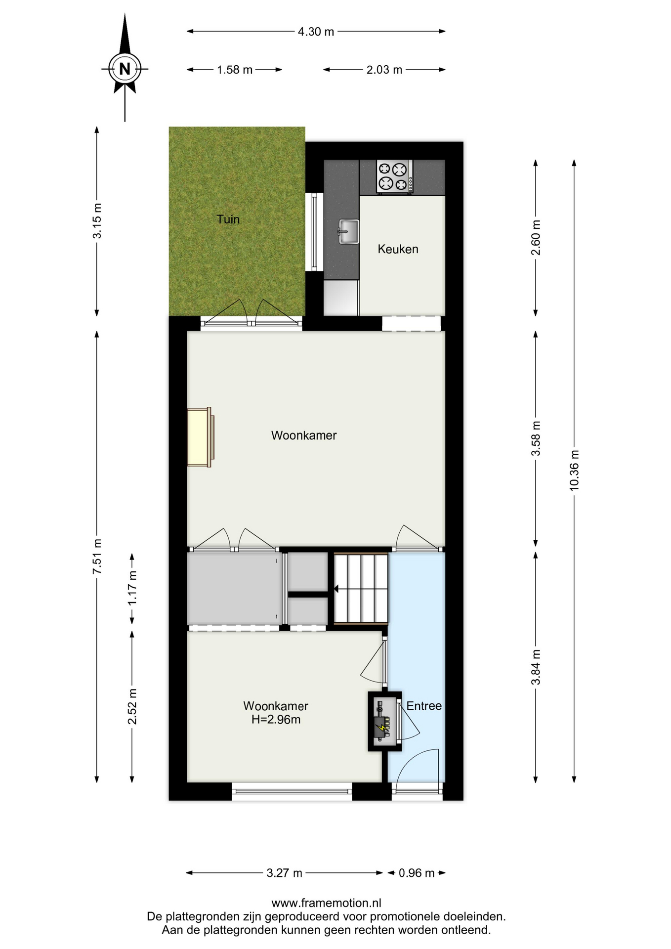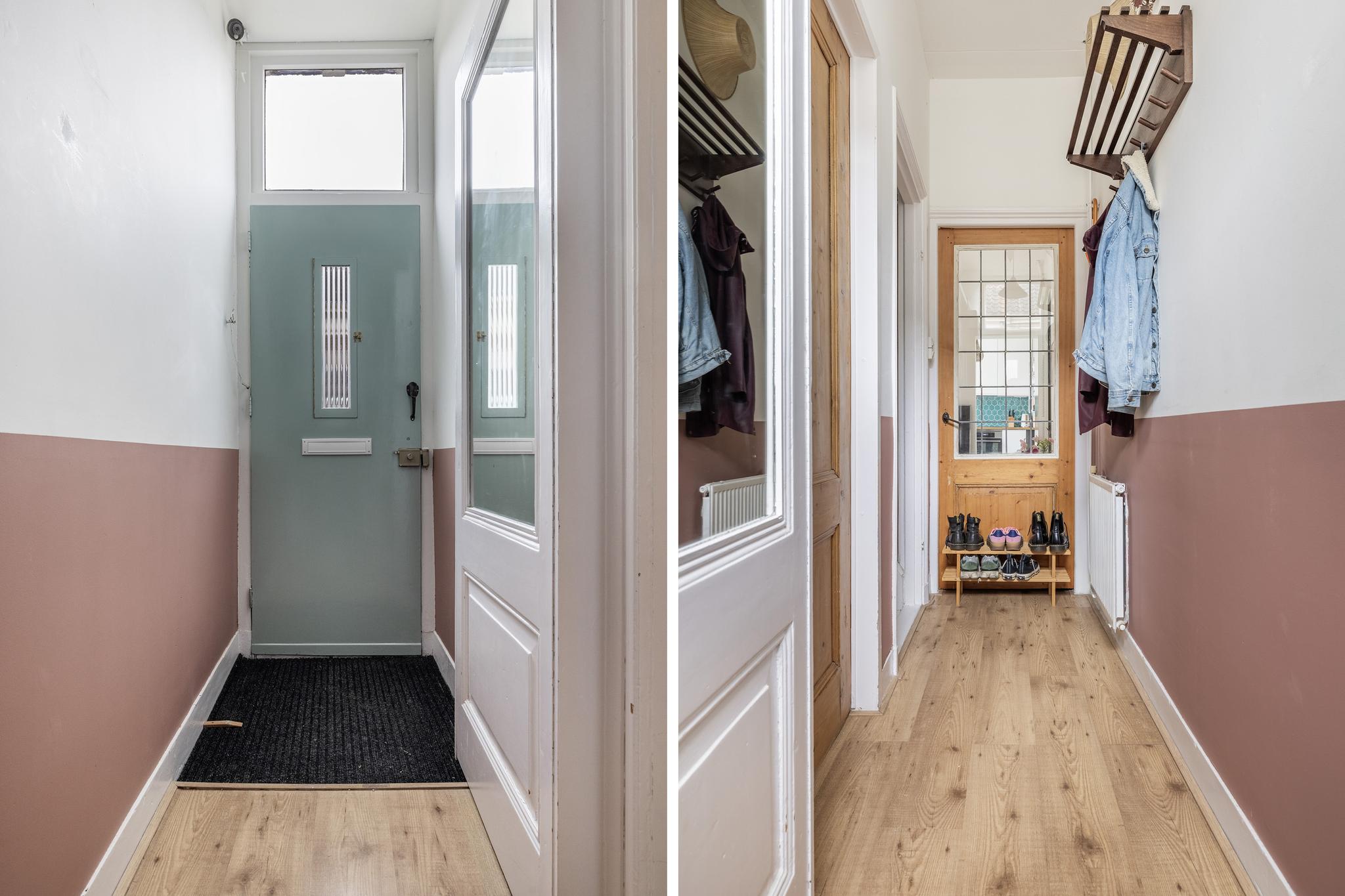 Entree in de hal met meterkast en toegang tot de woonkamer en trapopgang naar de eerste verdieping.