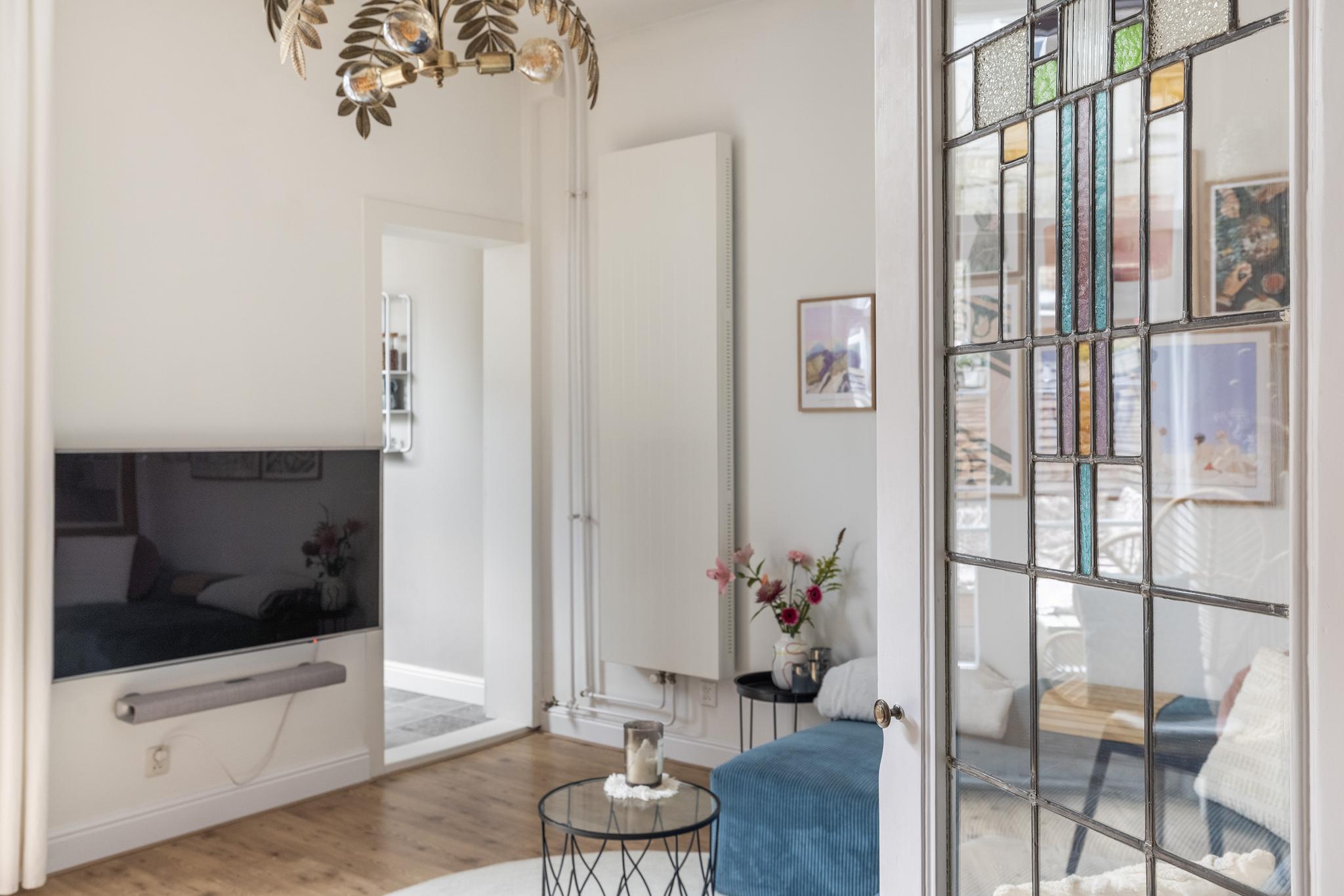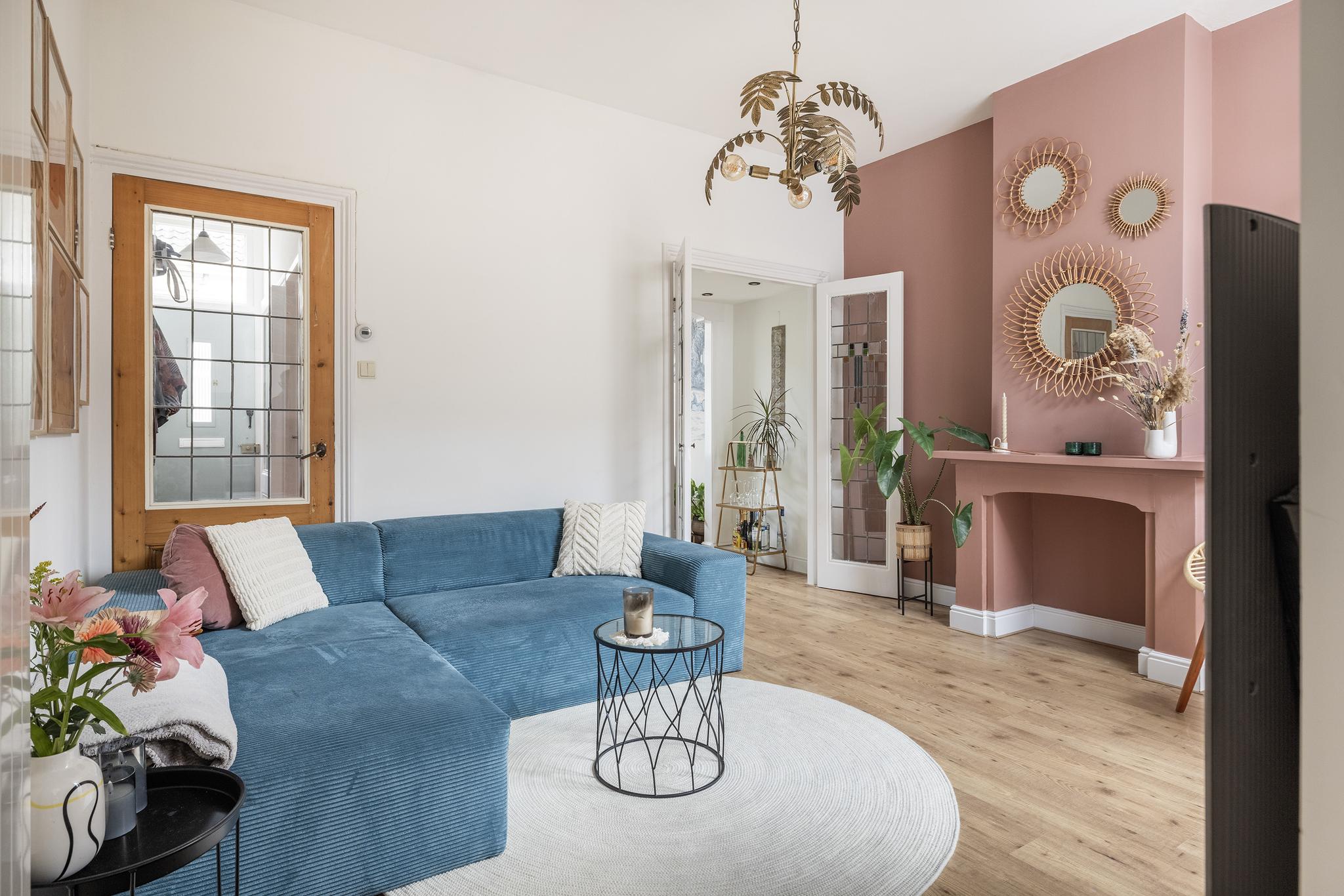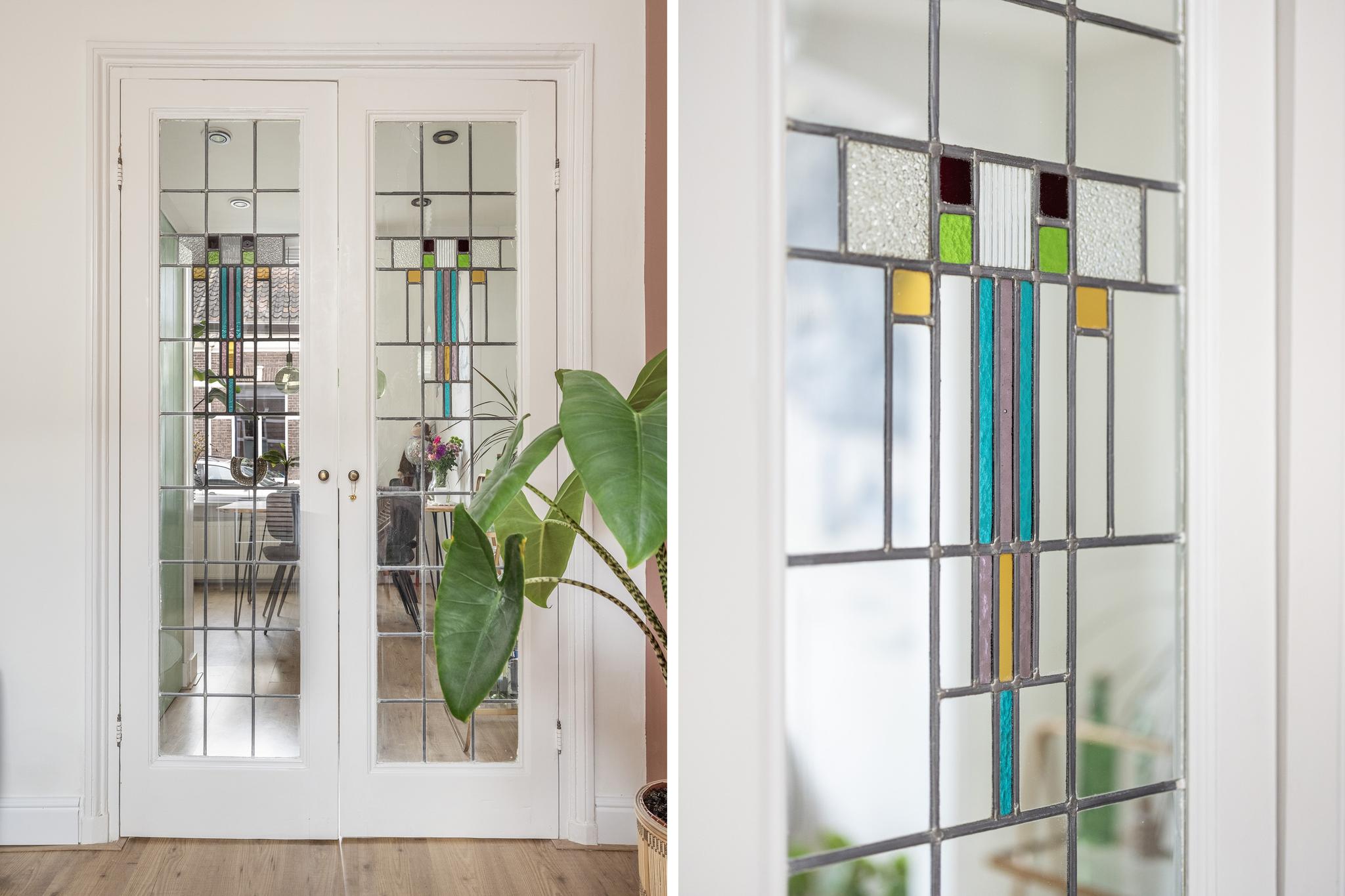 Via een toog met prachtige glas-in-lood deuren bereik je de achterkamer, waar de sfeervolle oude schouw en openslaande deuren naar de achtertuin direct opvallen. De extra deur naar de hal zorgt voor een fijne lichtinval. Ook deze kamer is voorzien van een nette laminaatvloer en stucwerk wandafwerking.