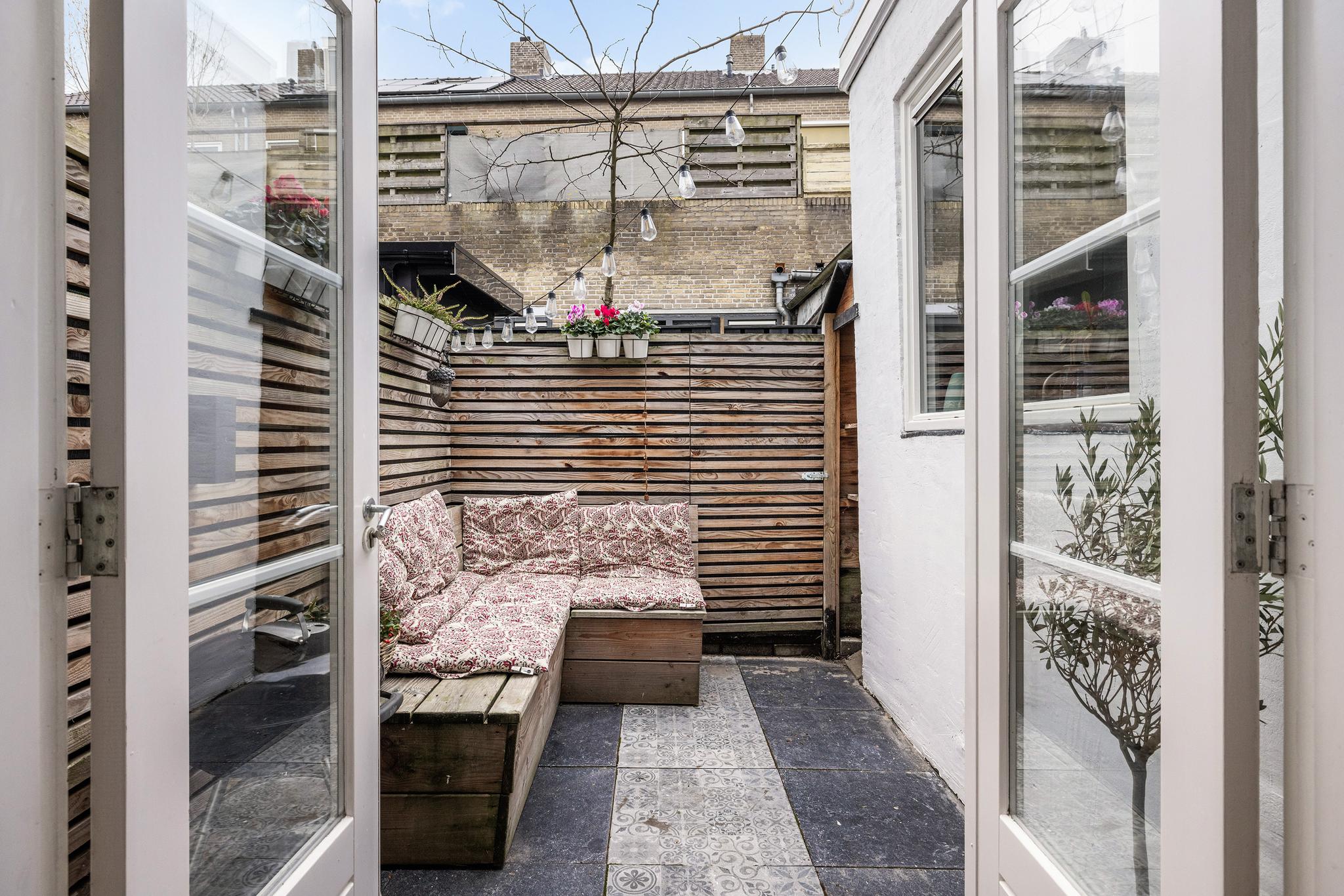 De knusse achtertuin is in 2022 aangelegd en is praktisch en gezellig ingericht met een op maat gemaakte hoekbank, een handige opbergkast, keramische tegels en een achterom.