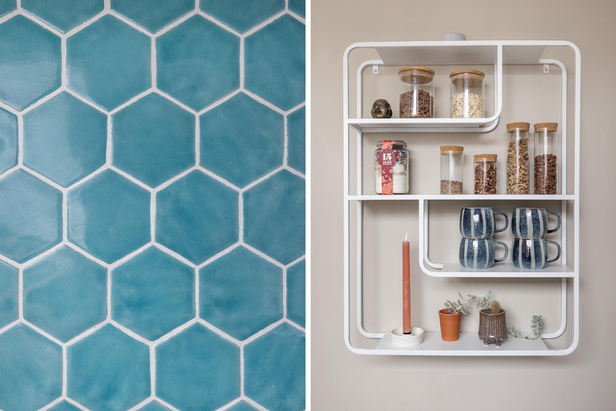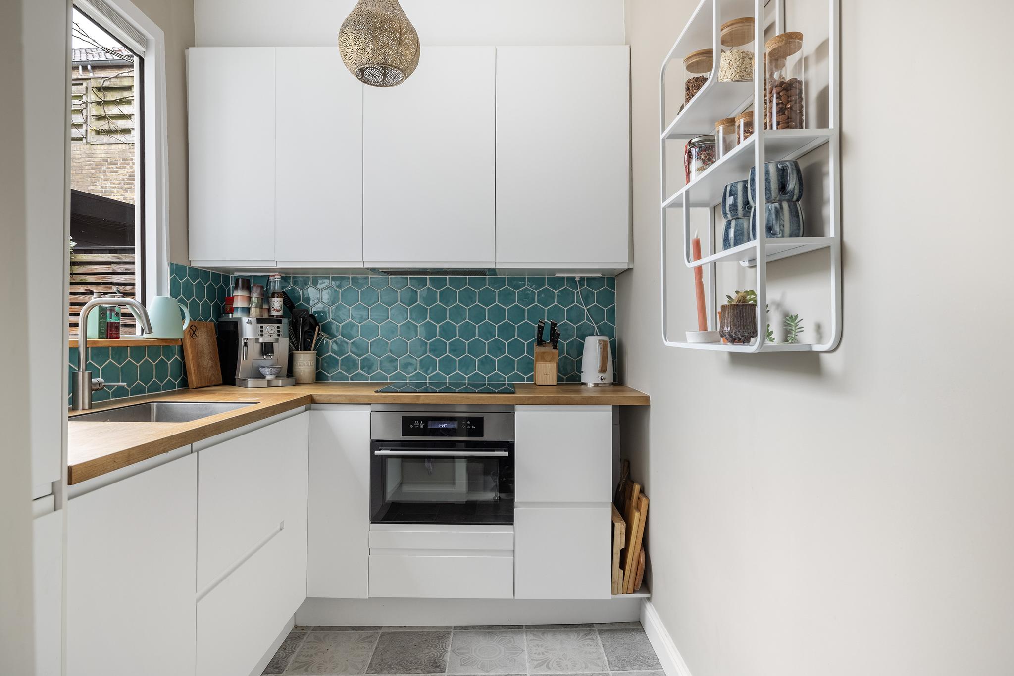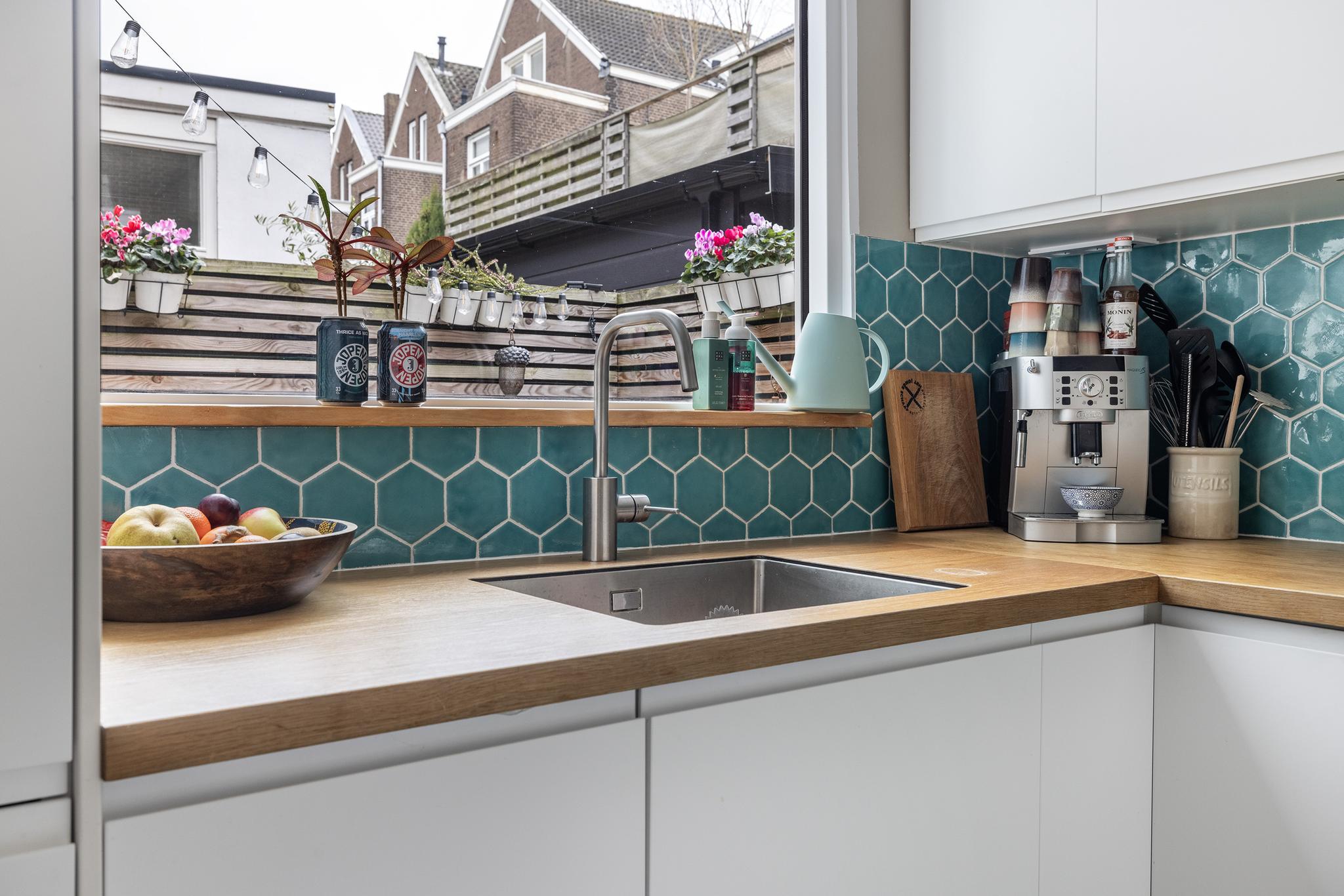 Vanuit de achterkamer is de keukenruimte bereikbaar. In 2022 is hier een moderne keuken in L-opstelling geplaatst, deze beschikt over een koel/vriescombinatie, een 4-pits inductiekookplaat, kleine vaatwasser en veel bergruimte. Het houten werkblad geeft de keuken een warme uitstraling. De vloer is afgewerkt met een nette PVC-vloer.