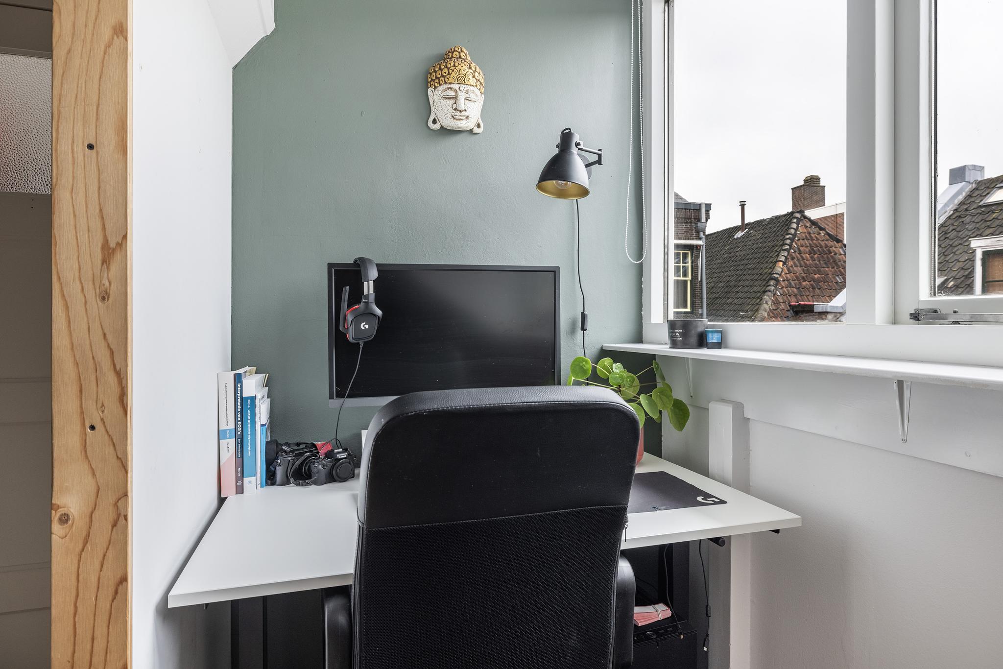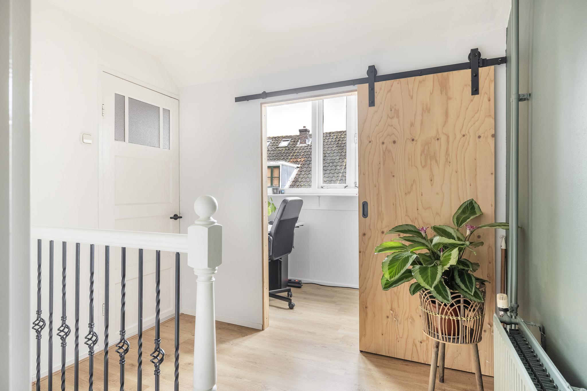 Kleine kamer aan voorzijde, deze wordt momenteel gebruikt als werkkamer en wordt middels een stijlvolle houten schuifdeur afgesloten.