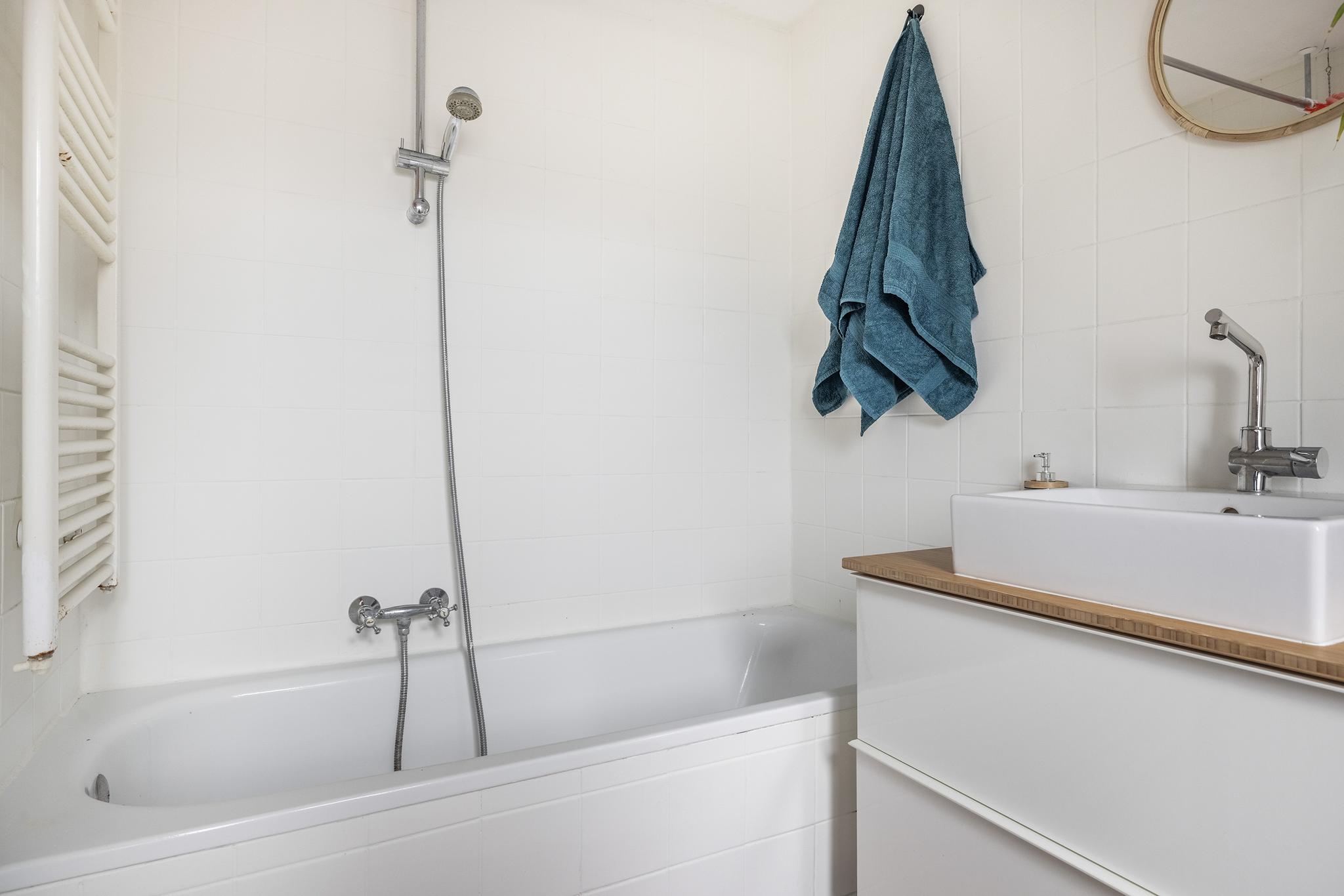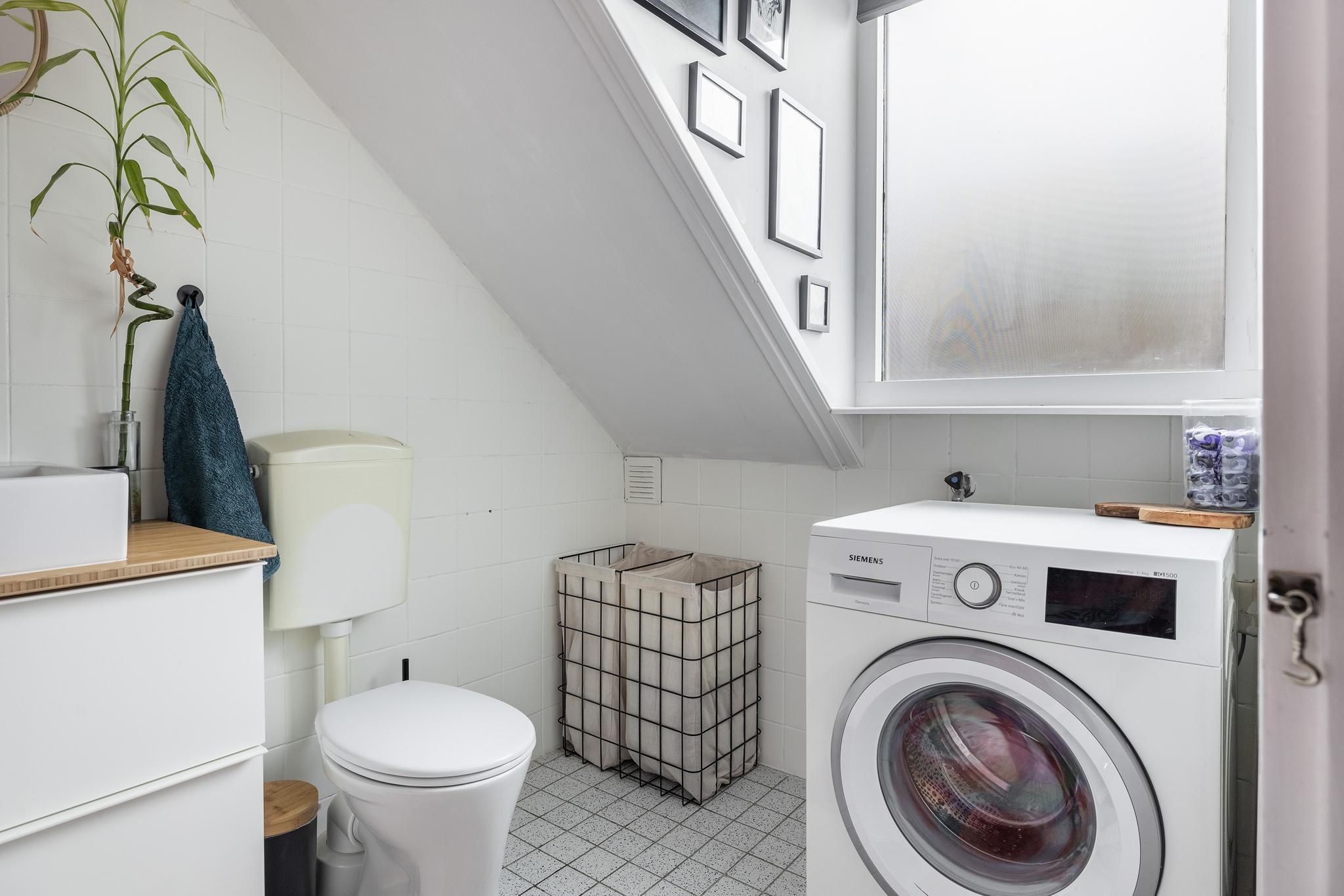 De badkamer is neutraal afgewerkt en voorzien van een ligbad met douche, een toilet, een wasmeubel met waskom, was aansluiting en mechanische ventilatie.