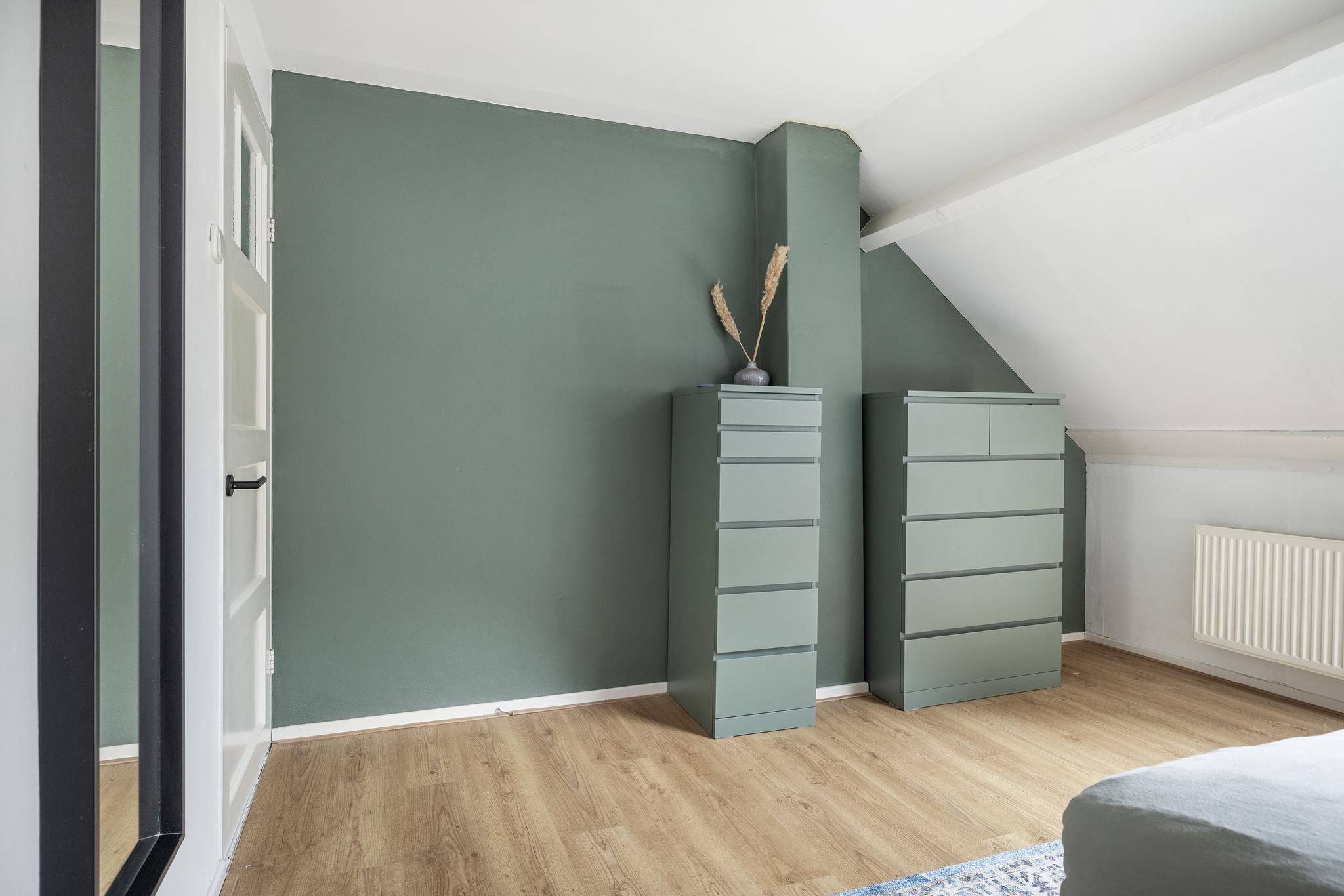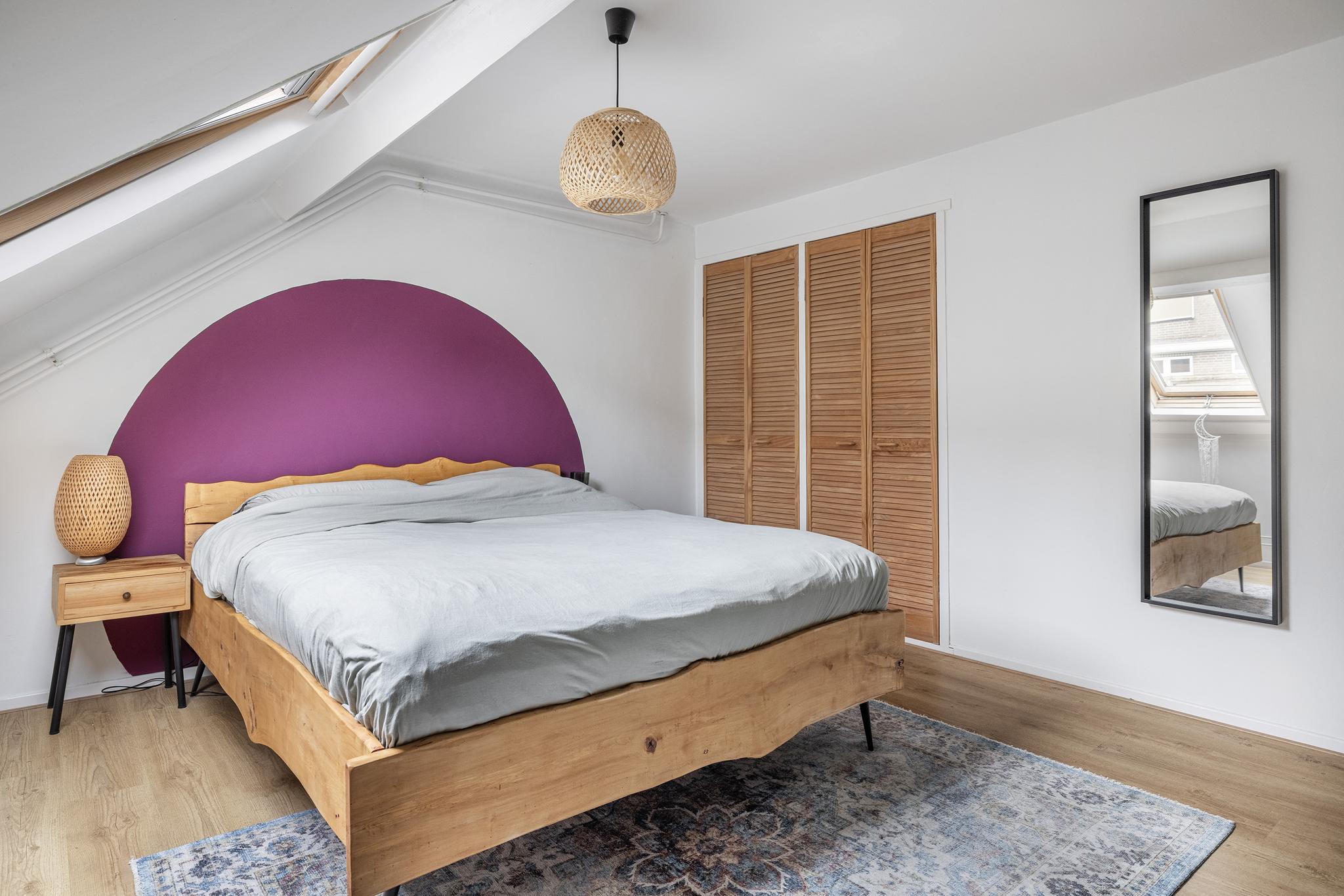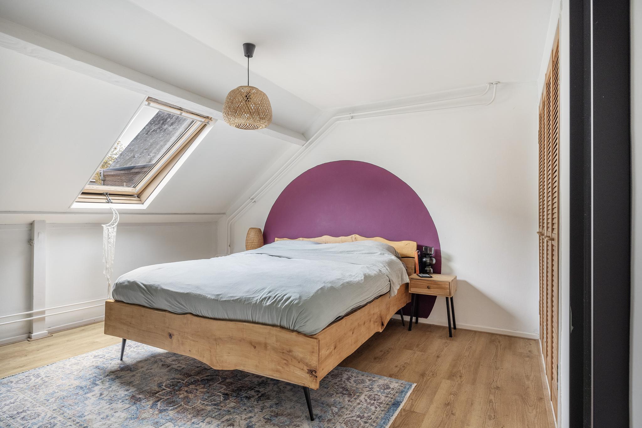 Royale slaapkamer aan achterzijde, voorzien van een laminaatvloer, dakraam en twee vaste inbouwkasten.