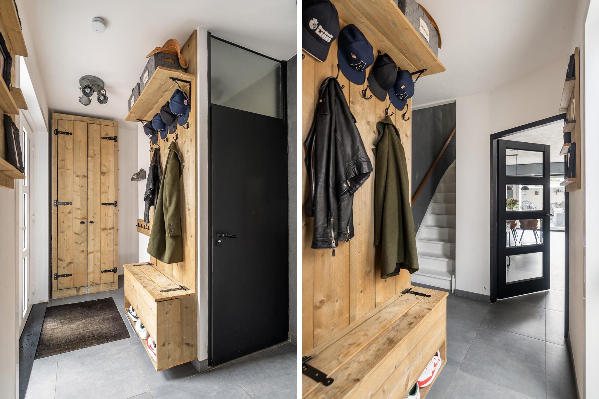 Entree in de hal met meterkast, vaste kast, toilet, ruimte voor de garderobe en deur naar de woonkamer.