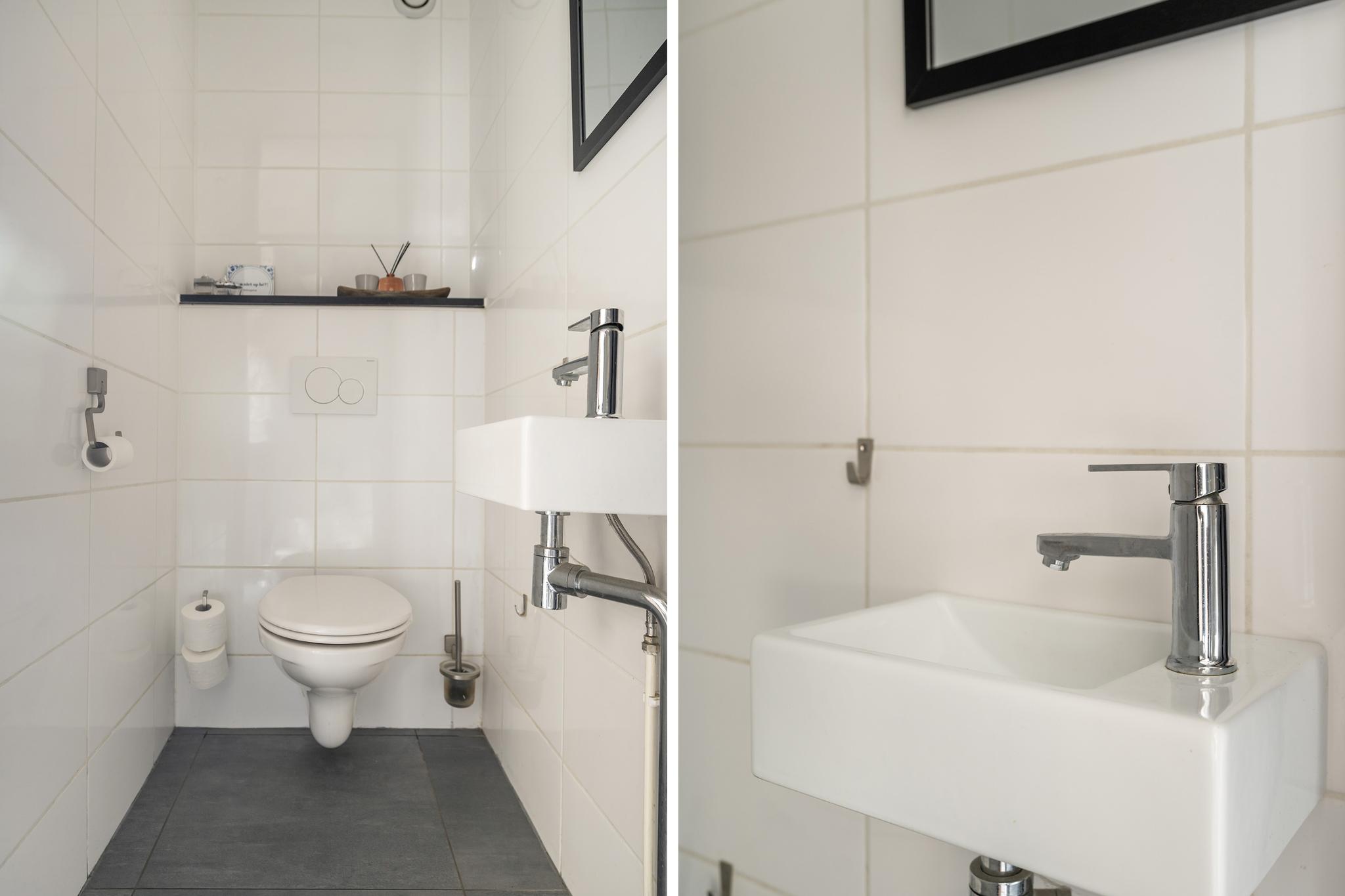 Toilet, vrijhangend met fonteintje en geheel betegelde wanden.