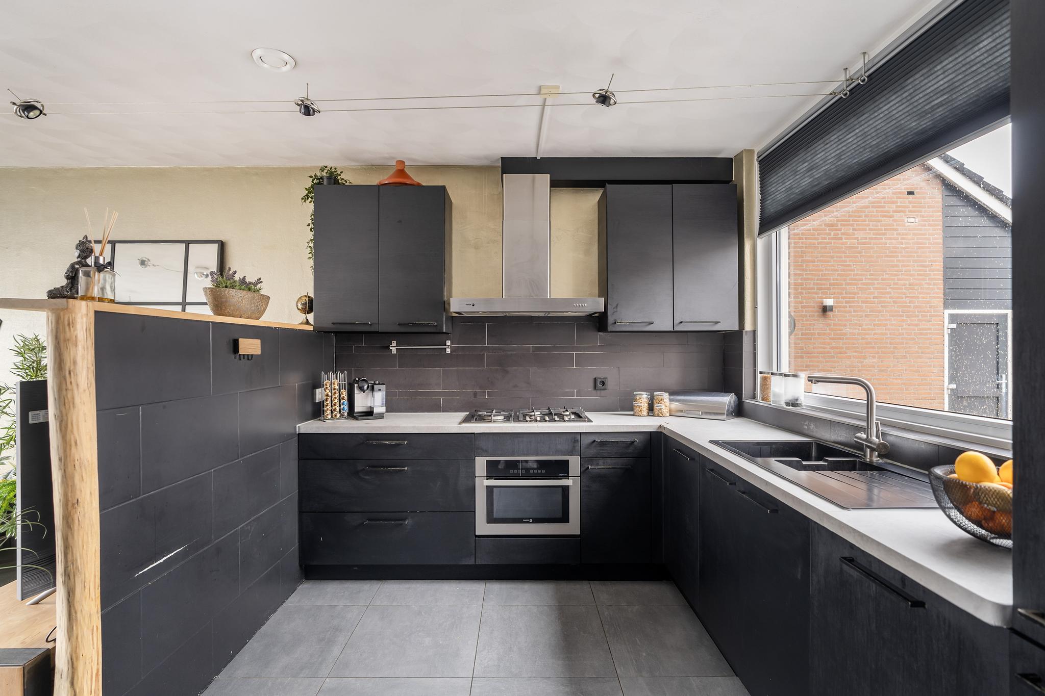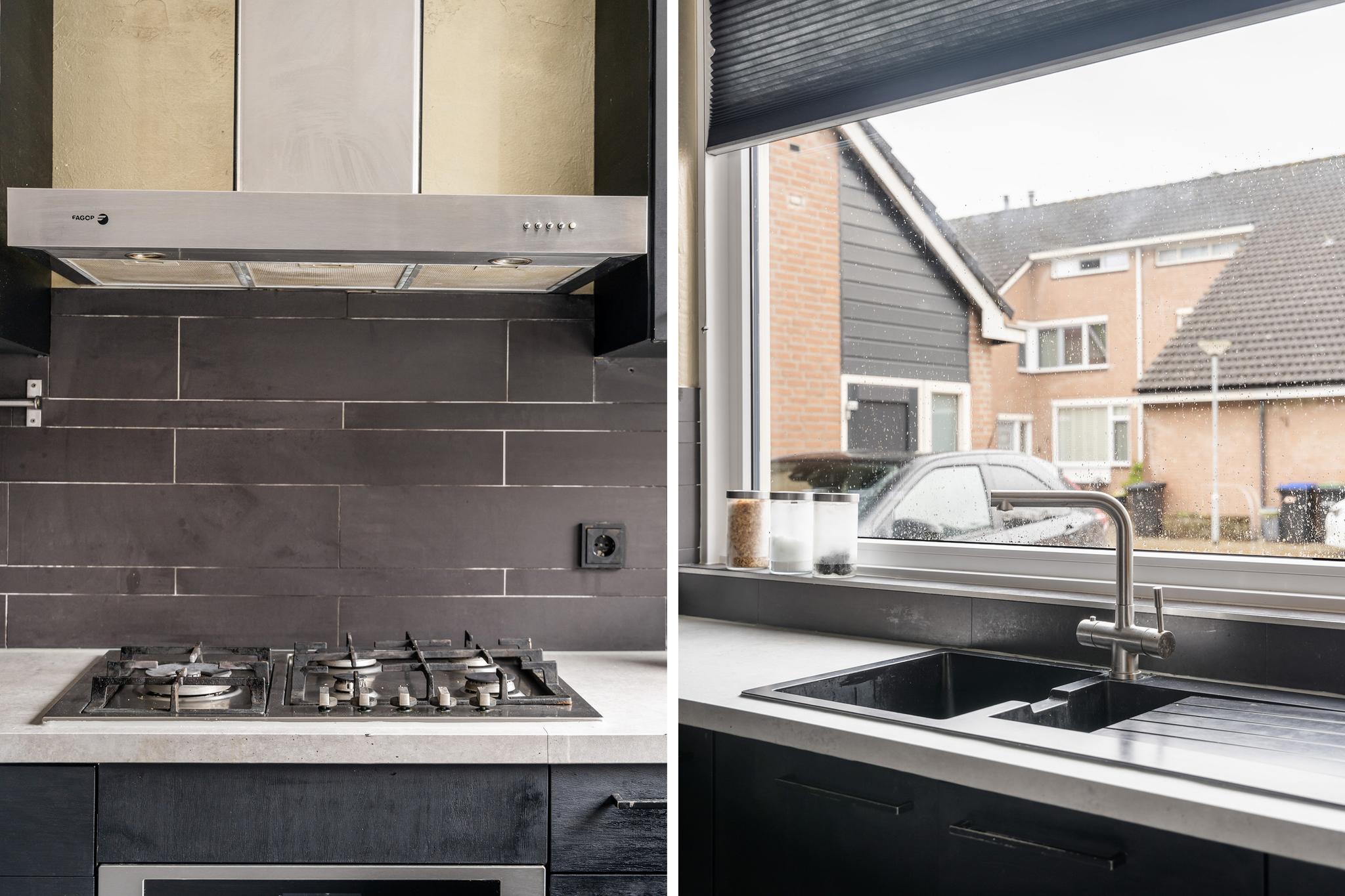 De keuken is geplaatst in hoekopstelling met 1,5 spoelbak, kraan, vaatwasser, 5 pits gaskookplaat, combi-oven, rvs schouw, koelkast met vriezer.