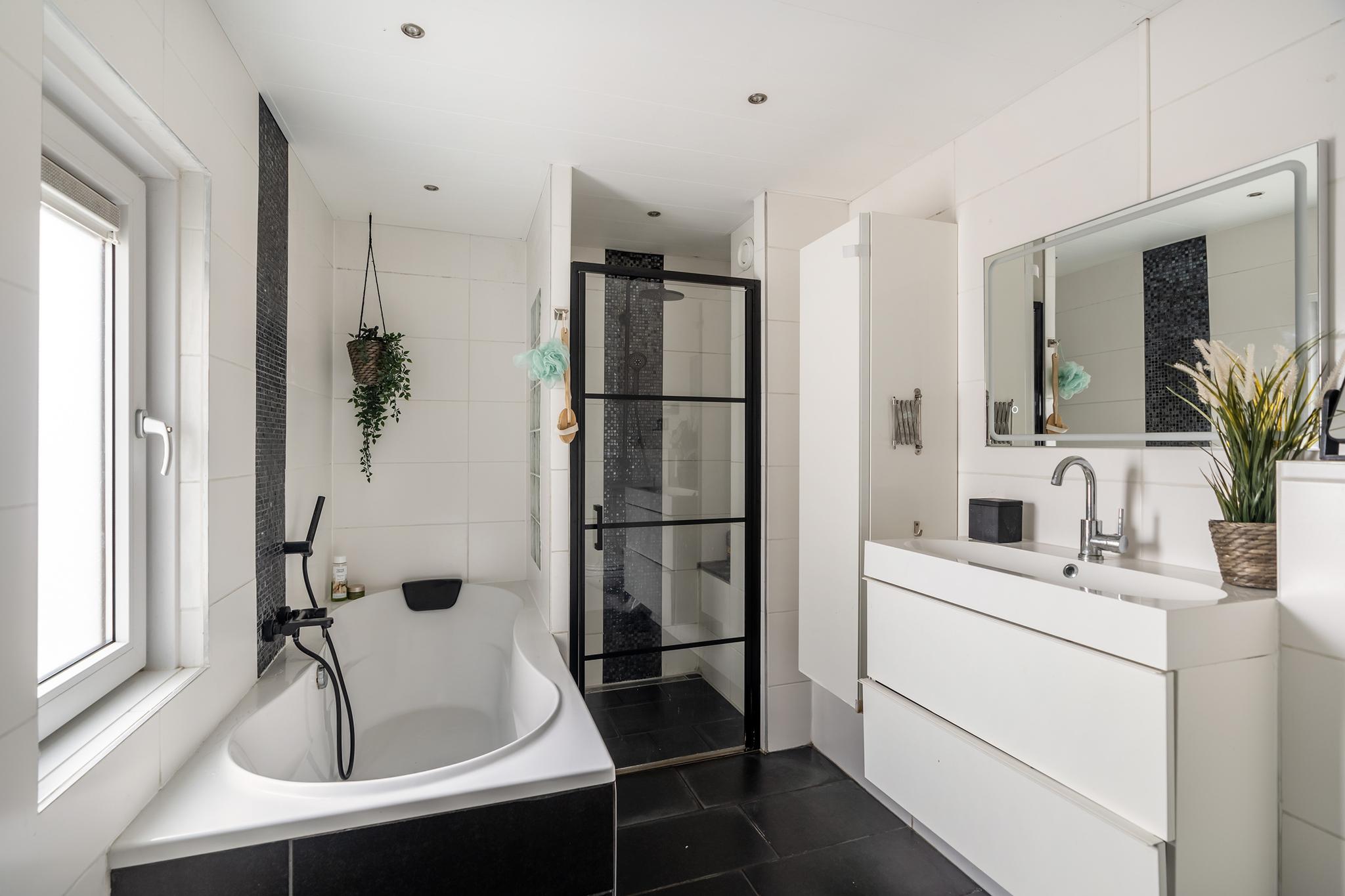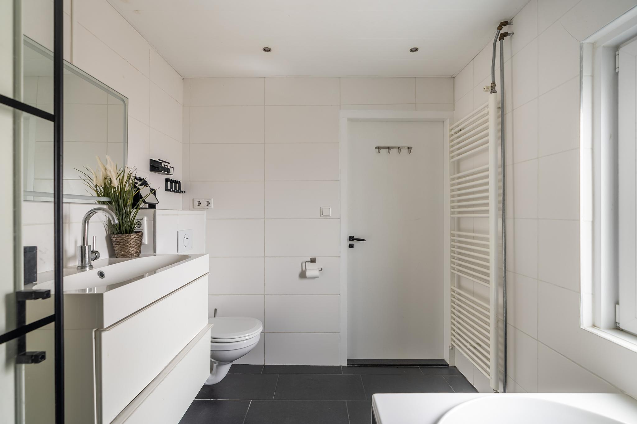 Badkamer met bad, douche en thermostaaktraan, wastafel en meubel, vrijhangend toilet en designradiator.