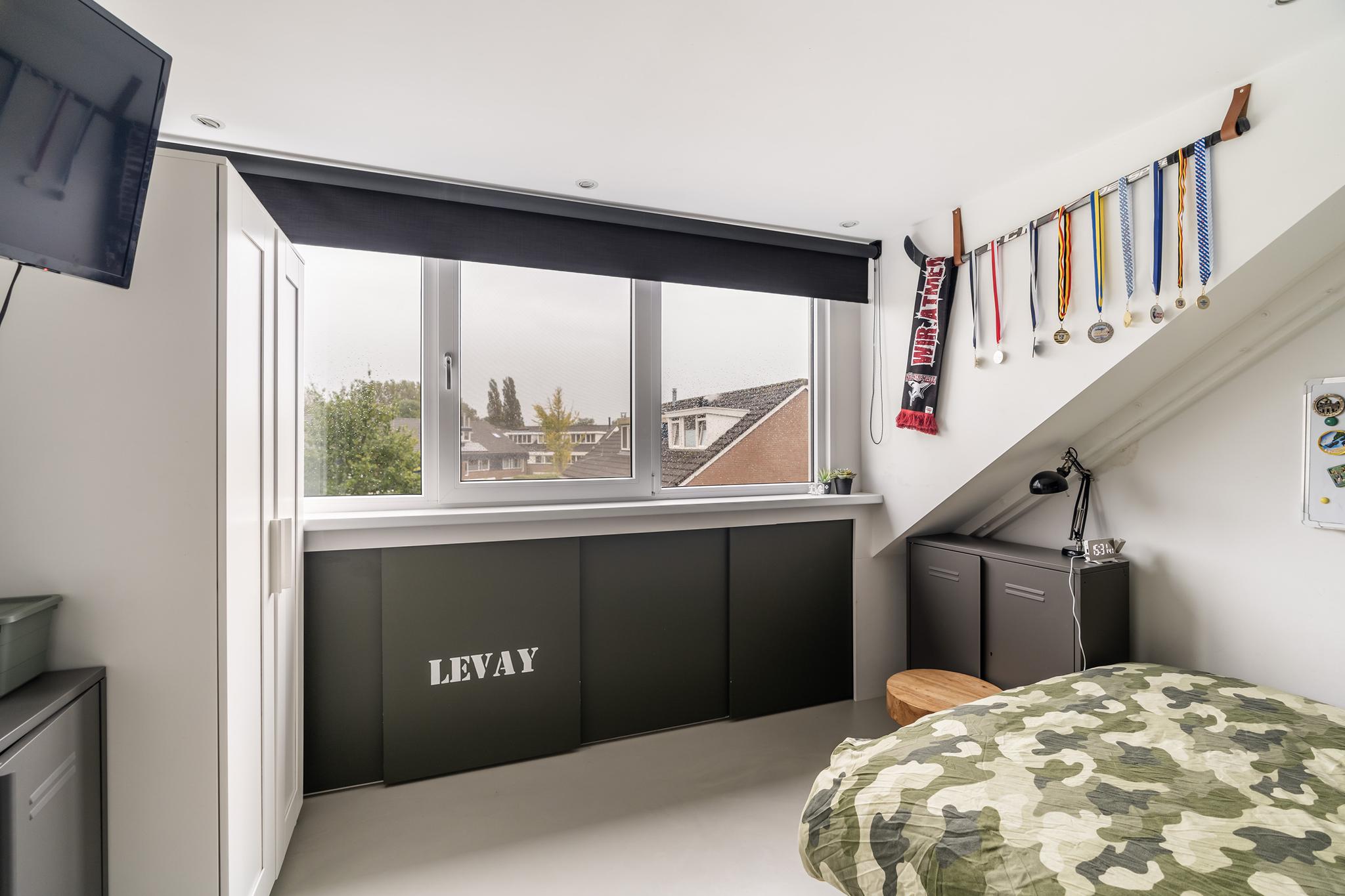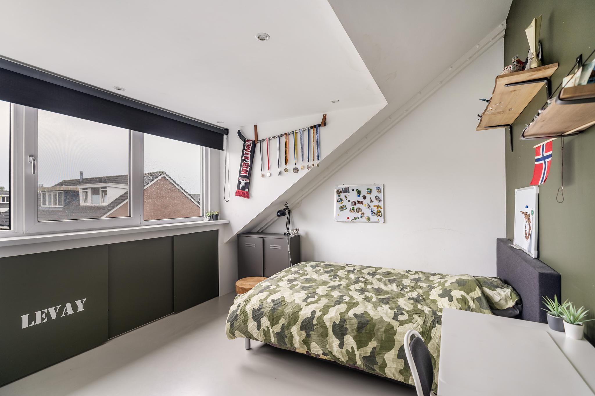 Slaapkamer 5 met dakkapel en bergruimte onder schuin dak.