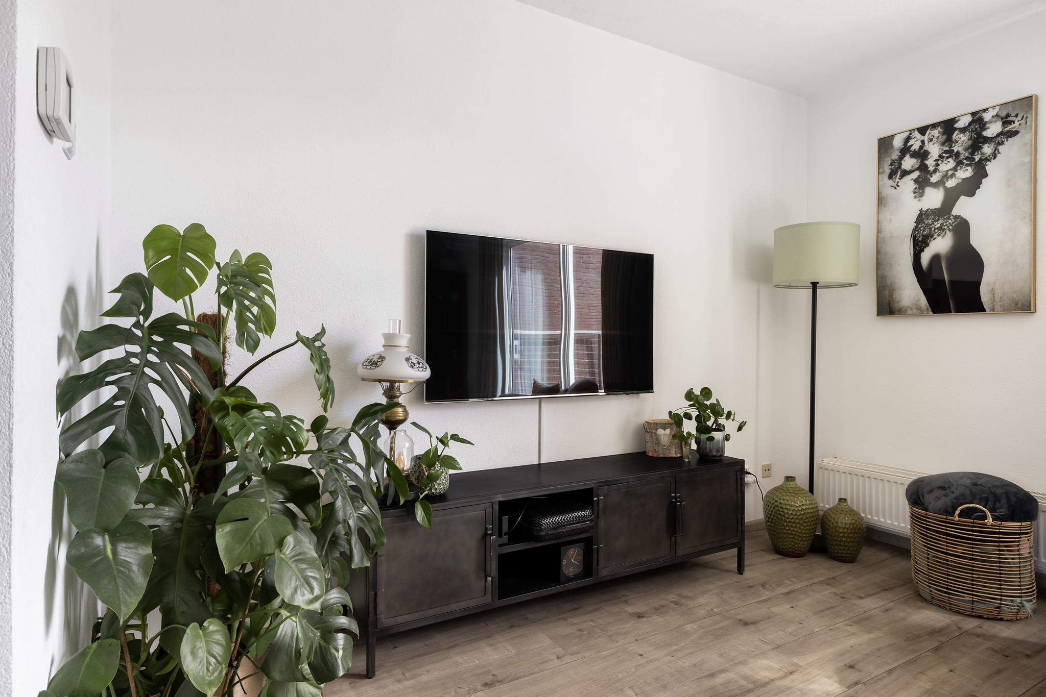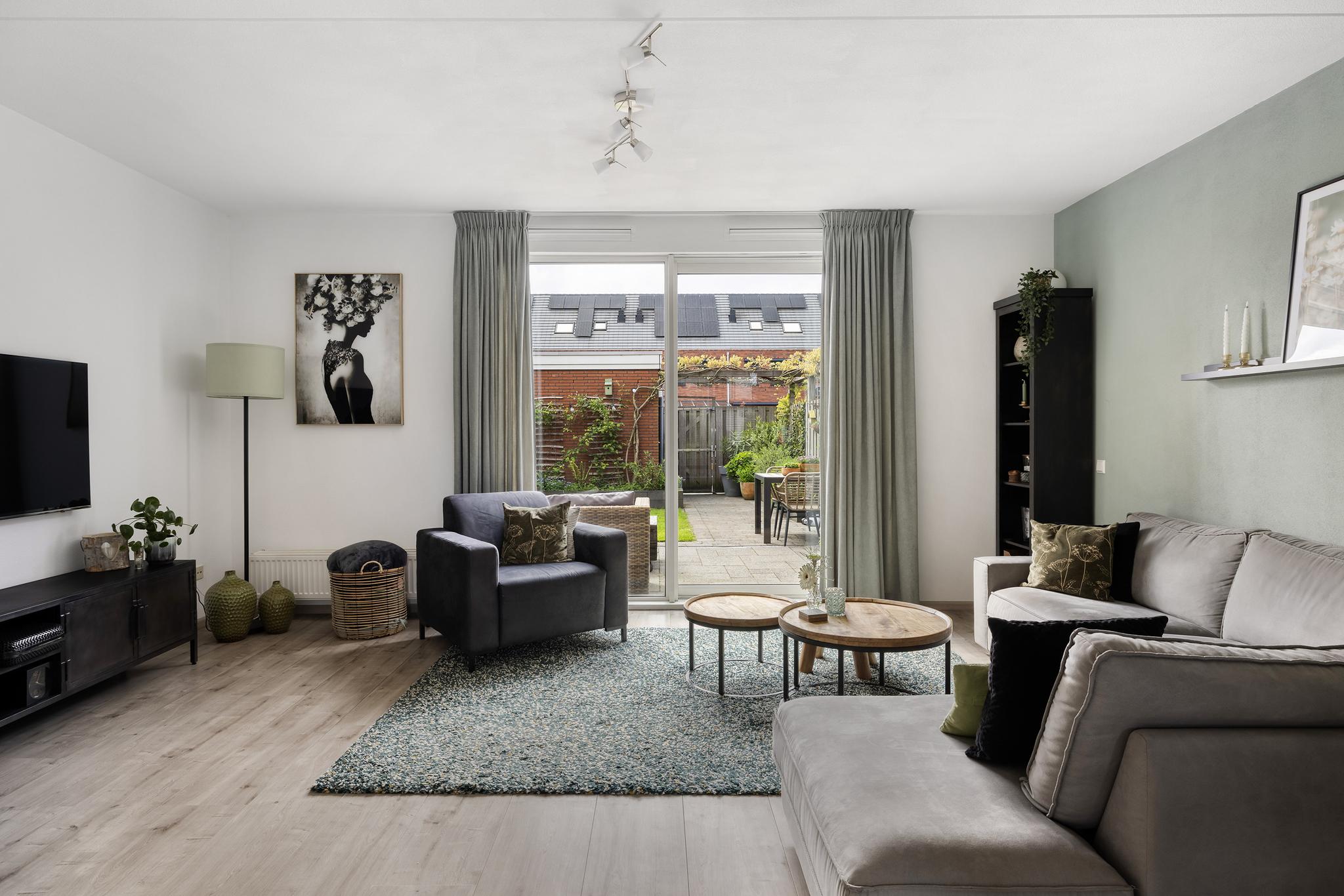 Mooie grote woonkamer, tuingericht met aan de voorzijde de open keuken. De woonkamer beschikt over een ruimte trapkast en een aluminium schuifpui naar de tuin.