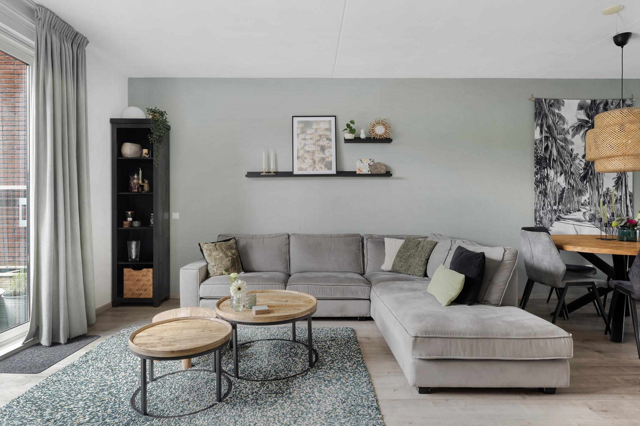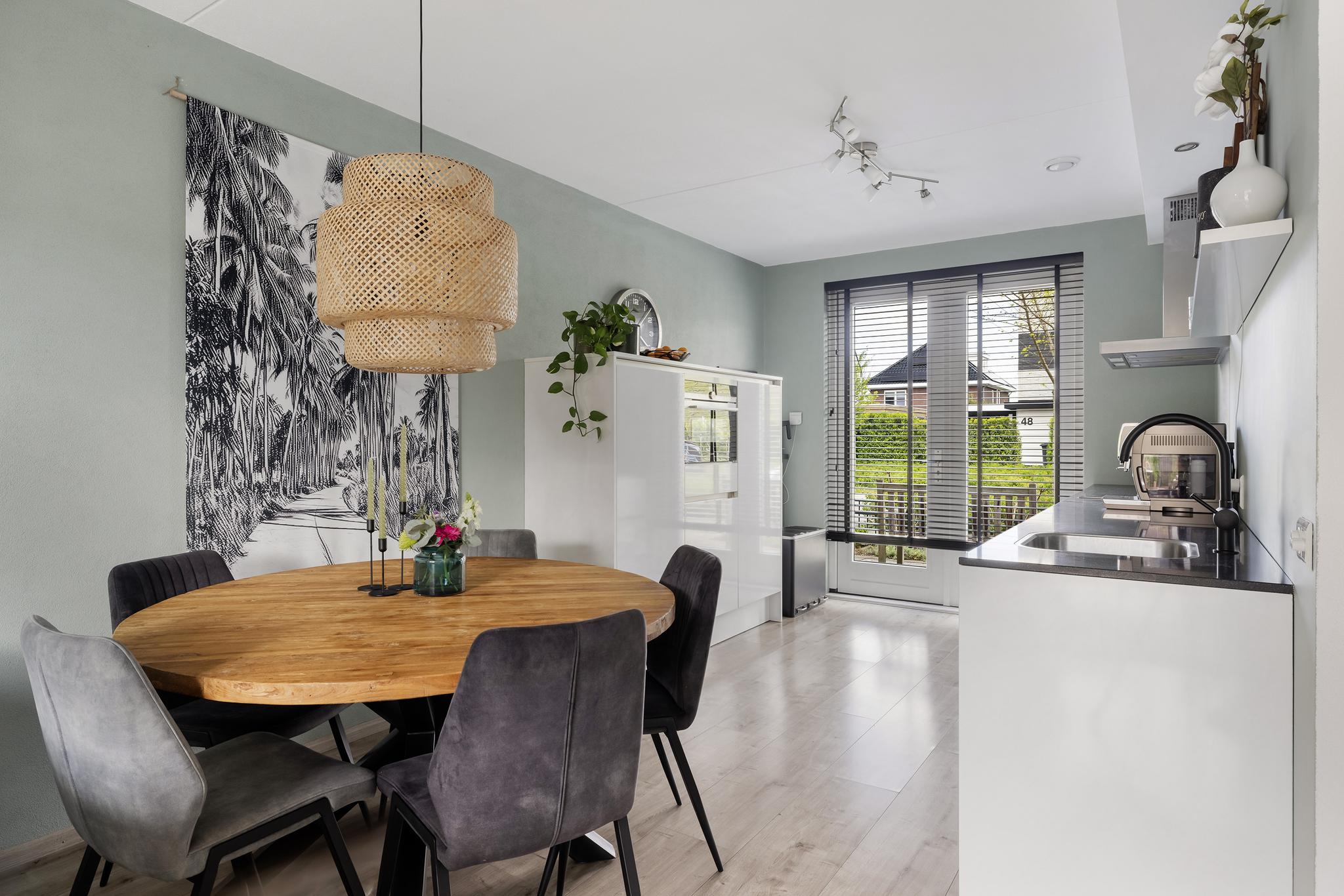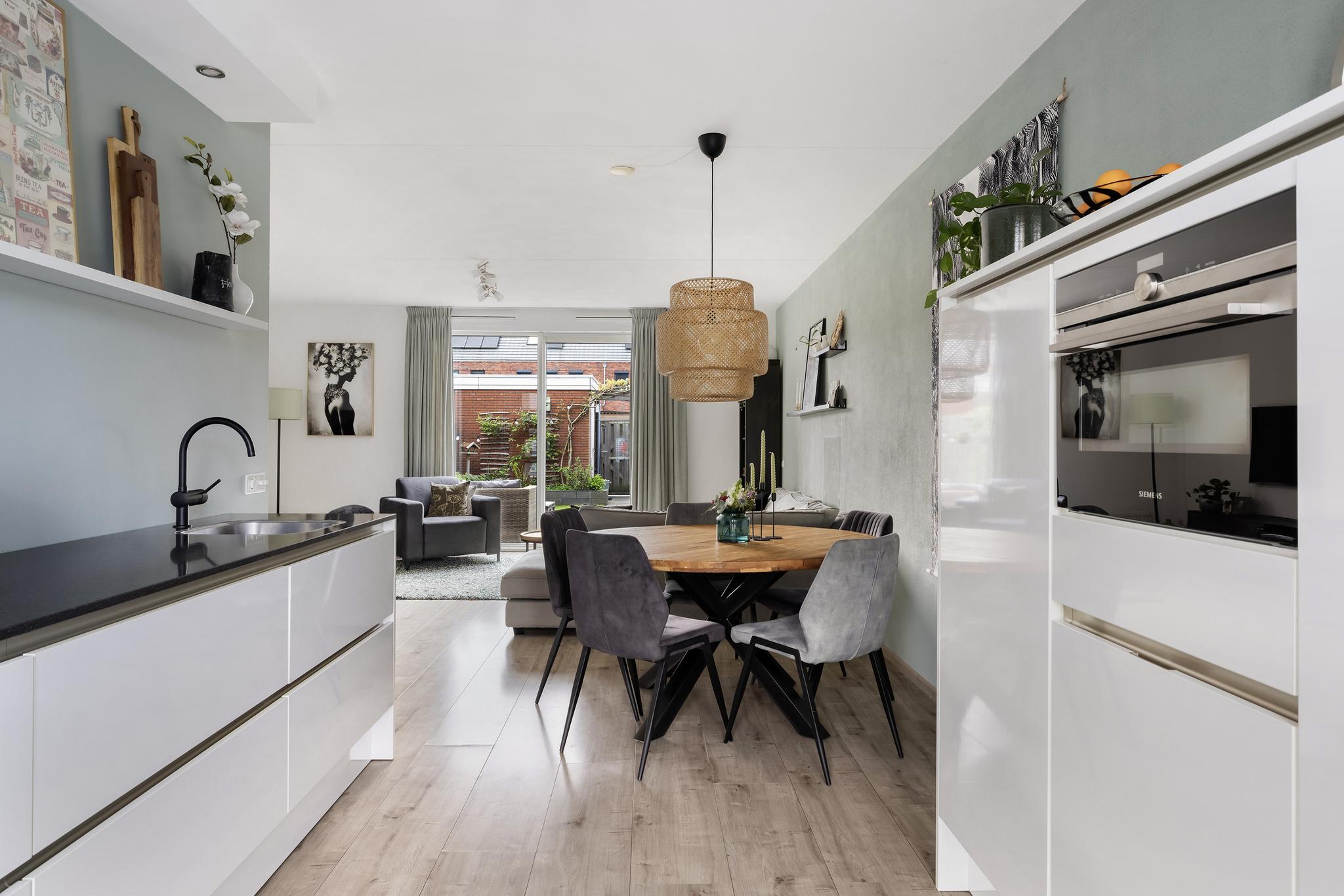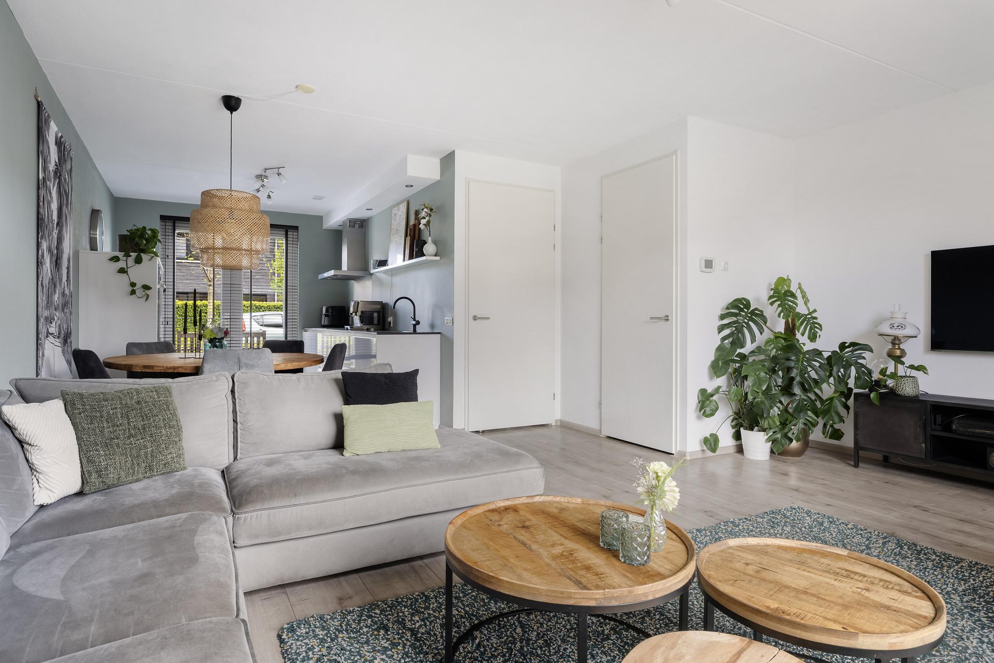 De woonkamer heeft een open verbinding met moderne keuken en vanuit hier kun je aan de voorkant de boel in de gaten houden.