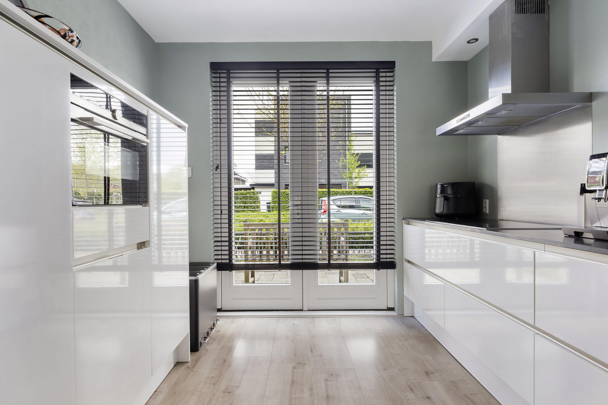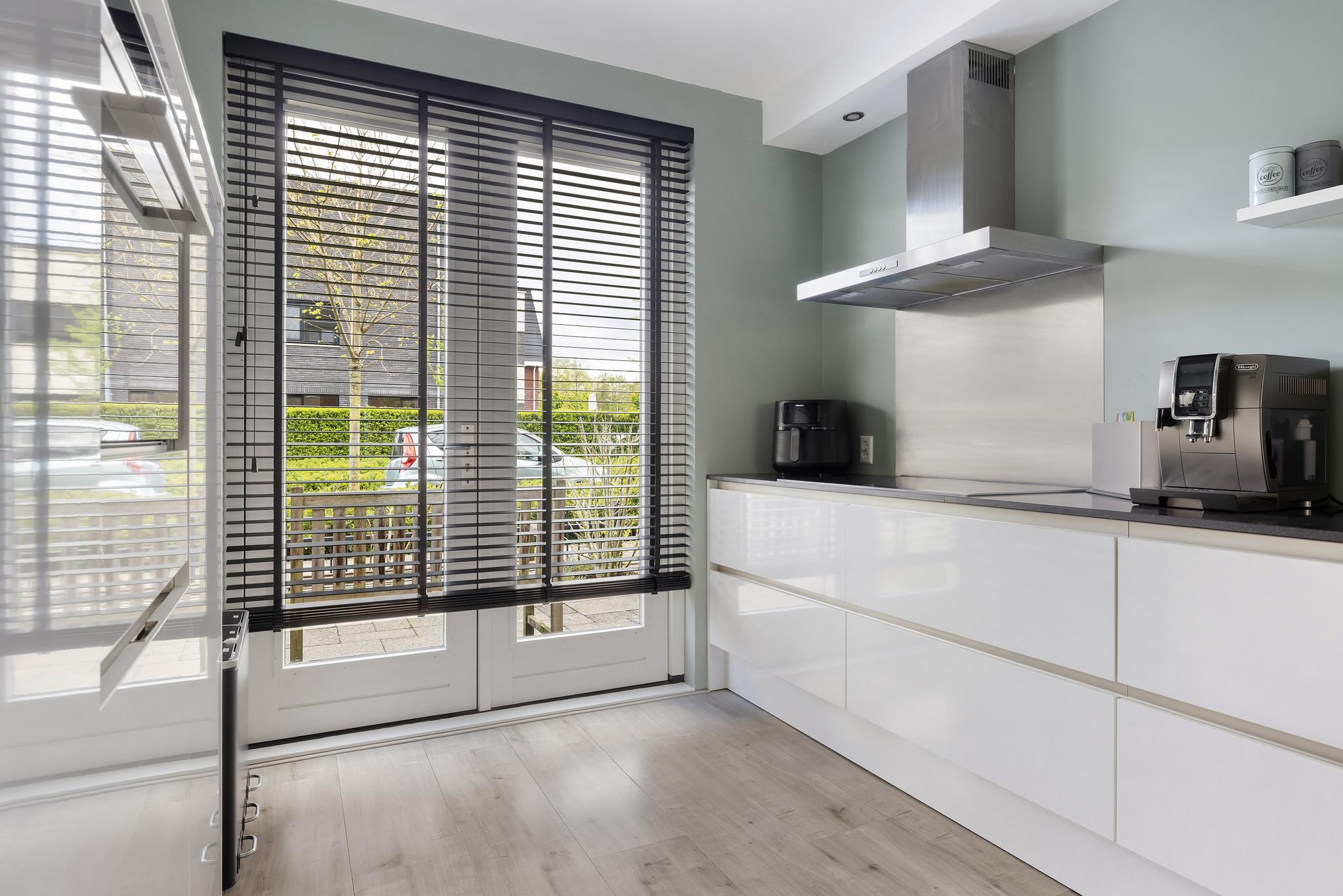 Heerlijke keuken in wandopstelling met combi-oven (2017), vaatwasser (2020), inductie kookplaat (vernieuwd in 2023), spoelbak, koelkast met vriesvak (2011), rvs afzuigschouw (2018) en openslaande deuren naar de voortuin.