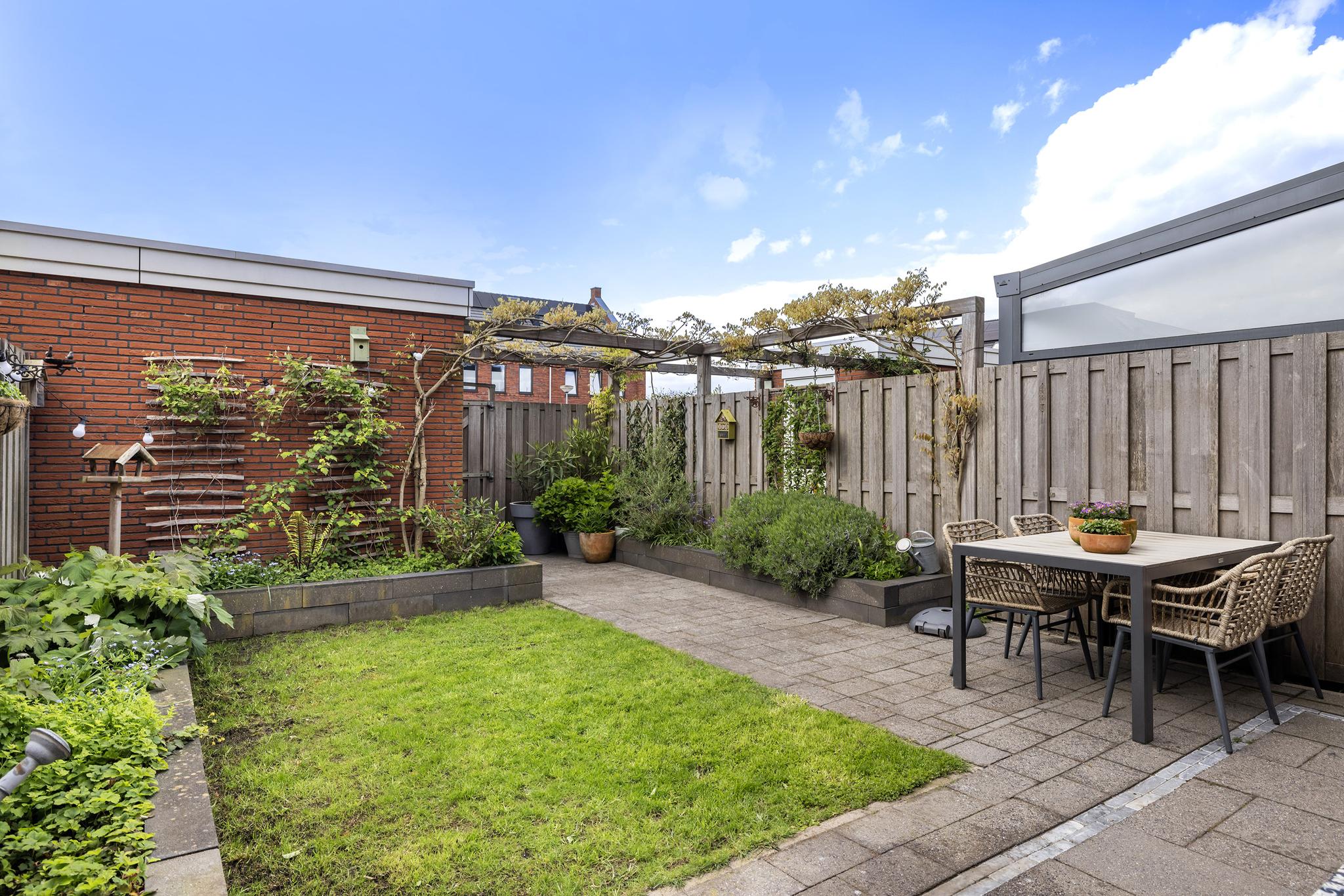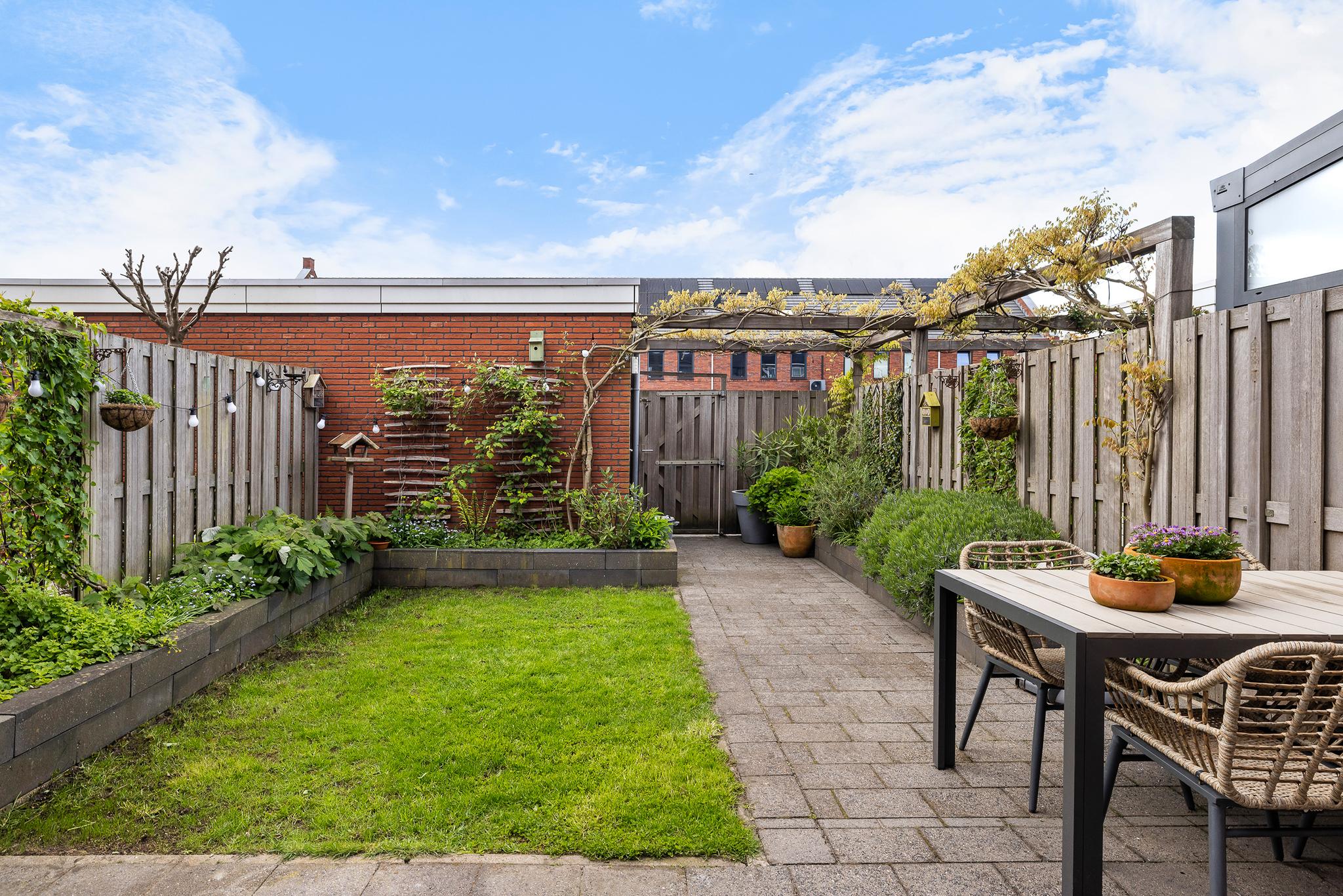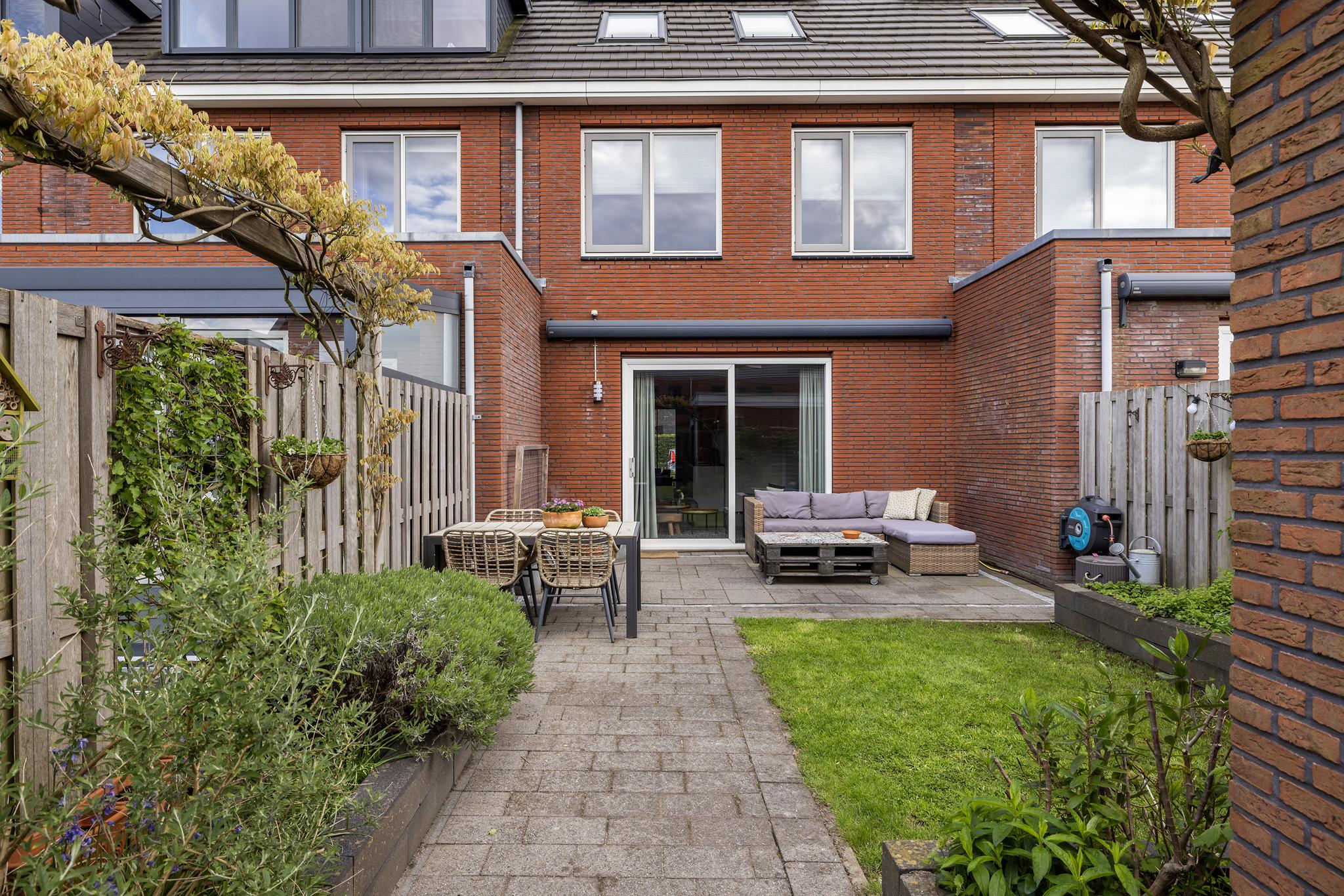De tuin aan de achterzijde beschikt over een stenen berging en een enorme extra luxe namelijk een eigen parkeerplaats (nummer 10) achter de tuin.