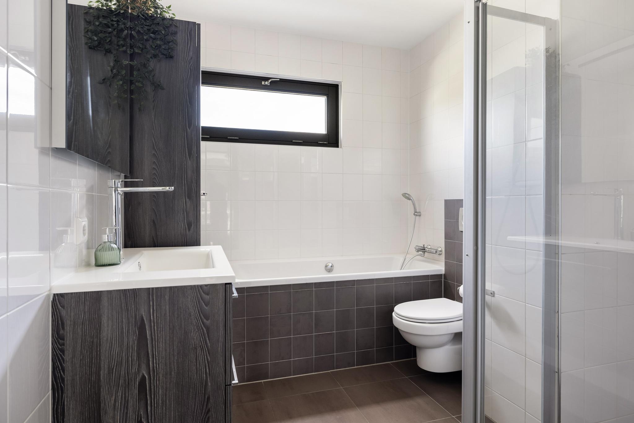 Badkamer met wastafel en meubel, bad en douche, beide met thermostaatkraan en daarnaast een vrijhangend toilet.