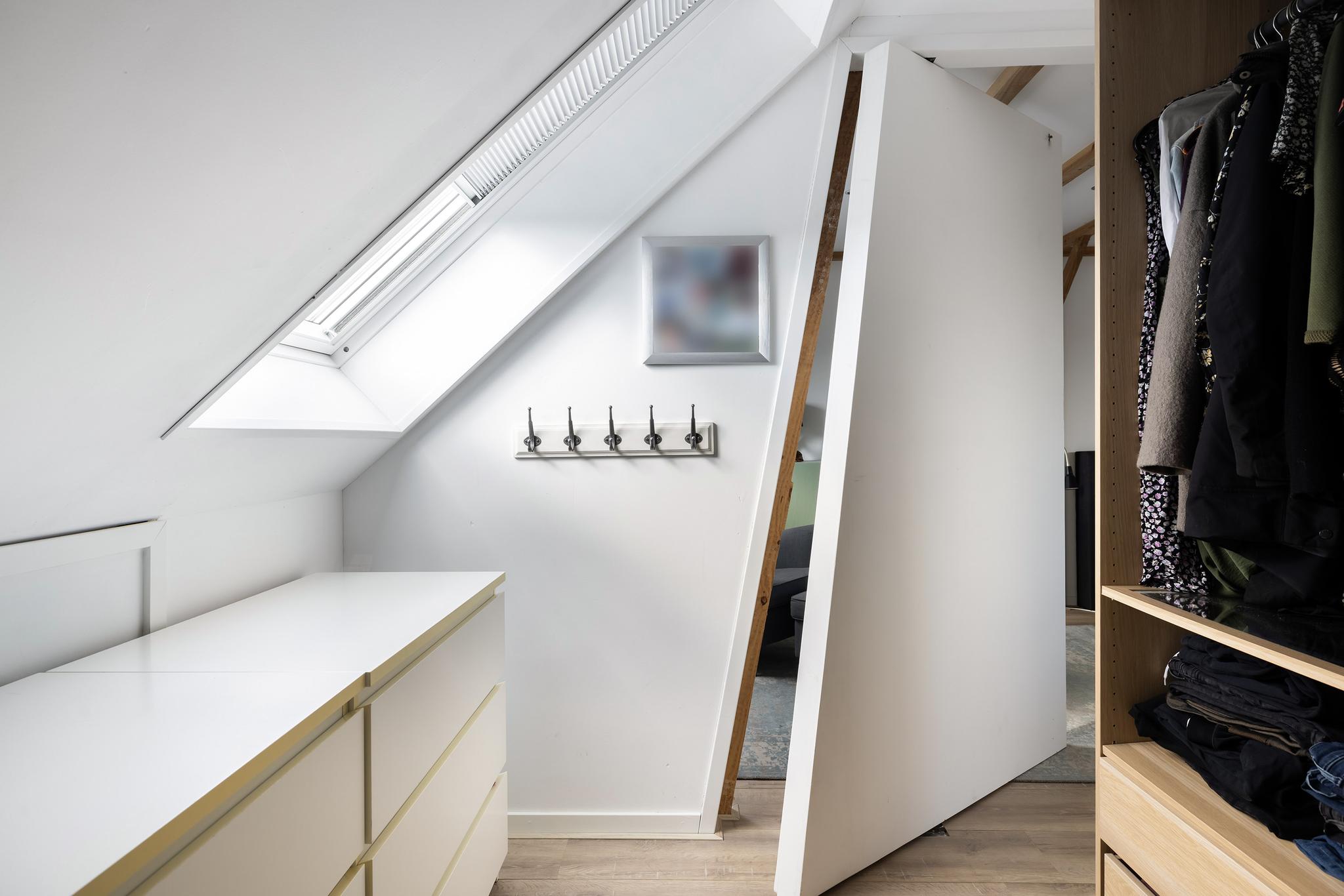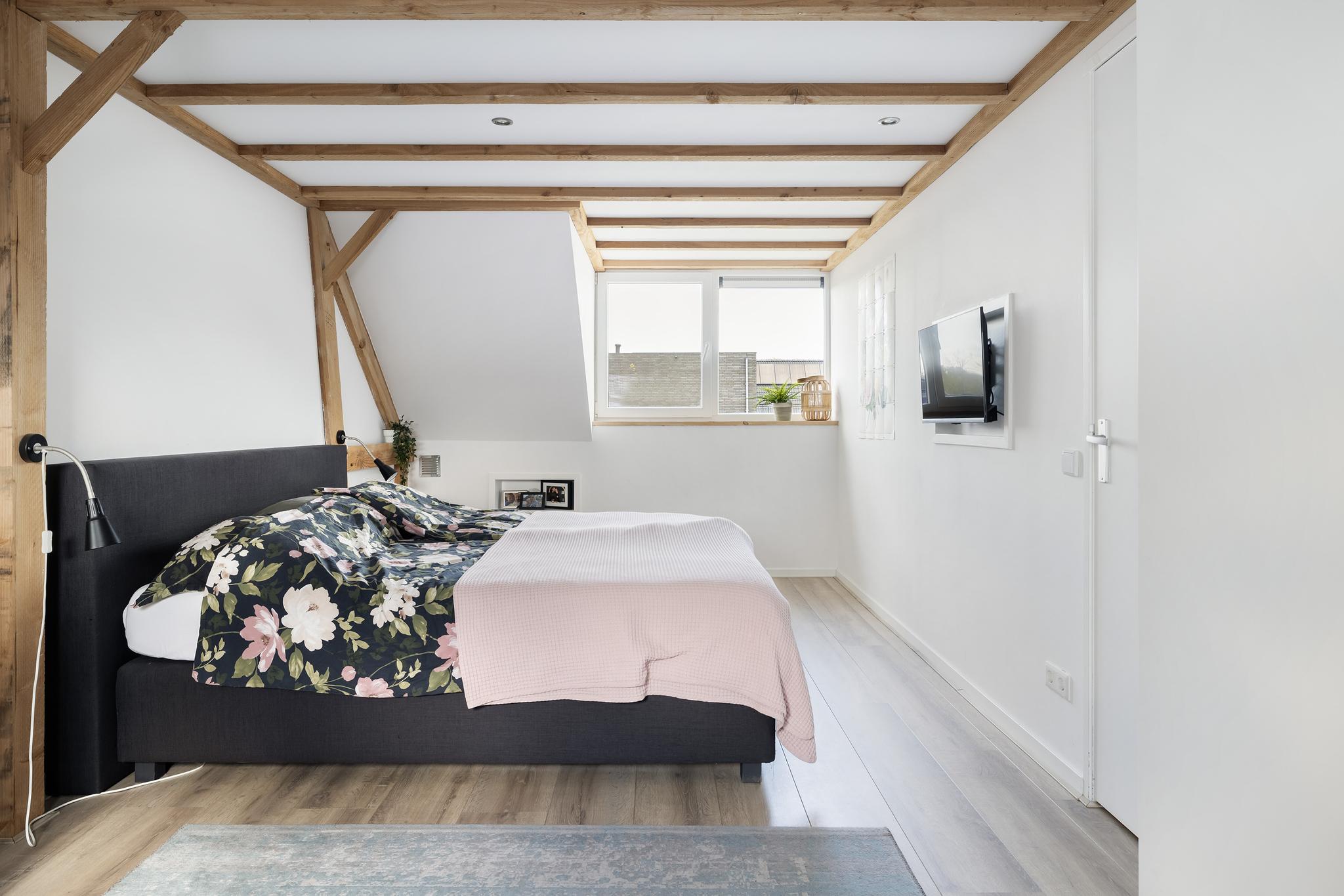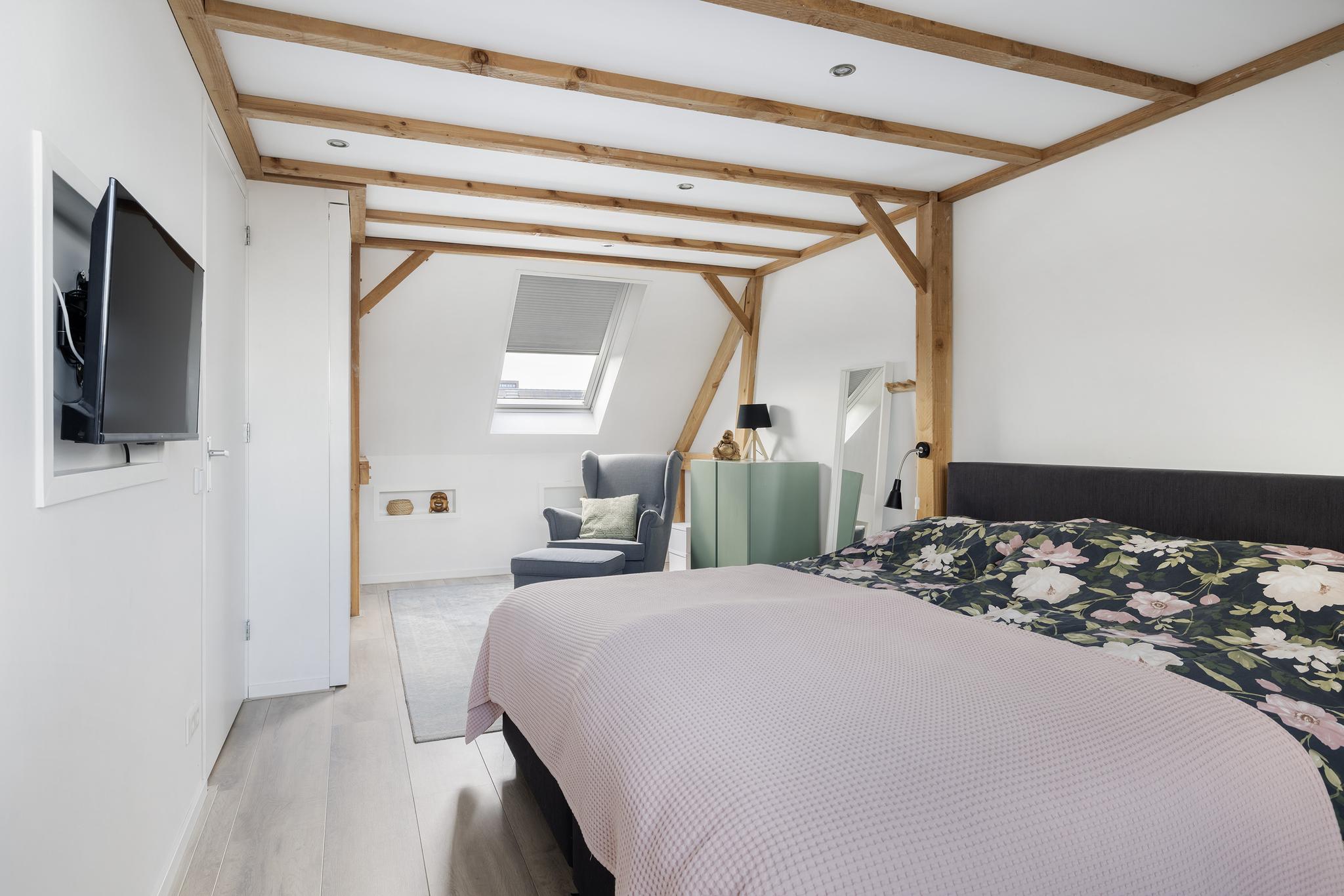 De zolder is voorzien van een dakkapel en een prachtige grote slaapkamer compleet met balken plafond en inbouwkasten EN een verstopte walk-in-closet!