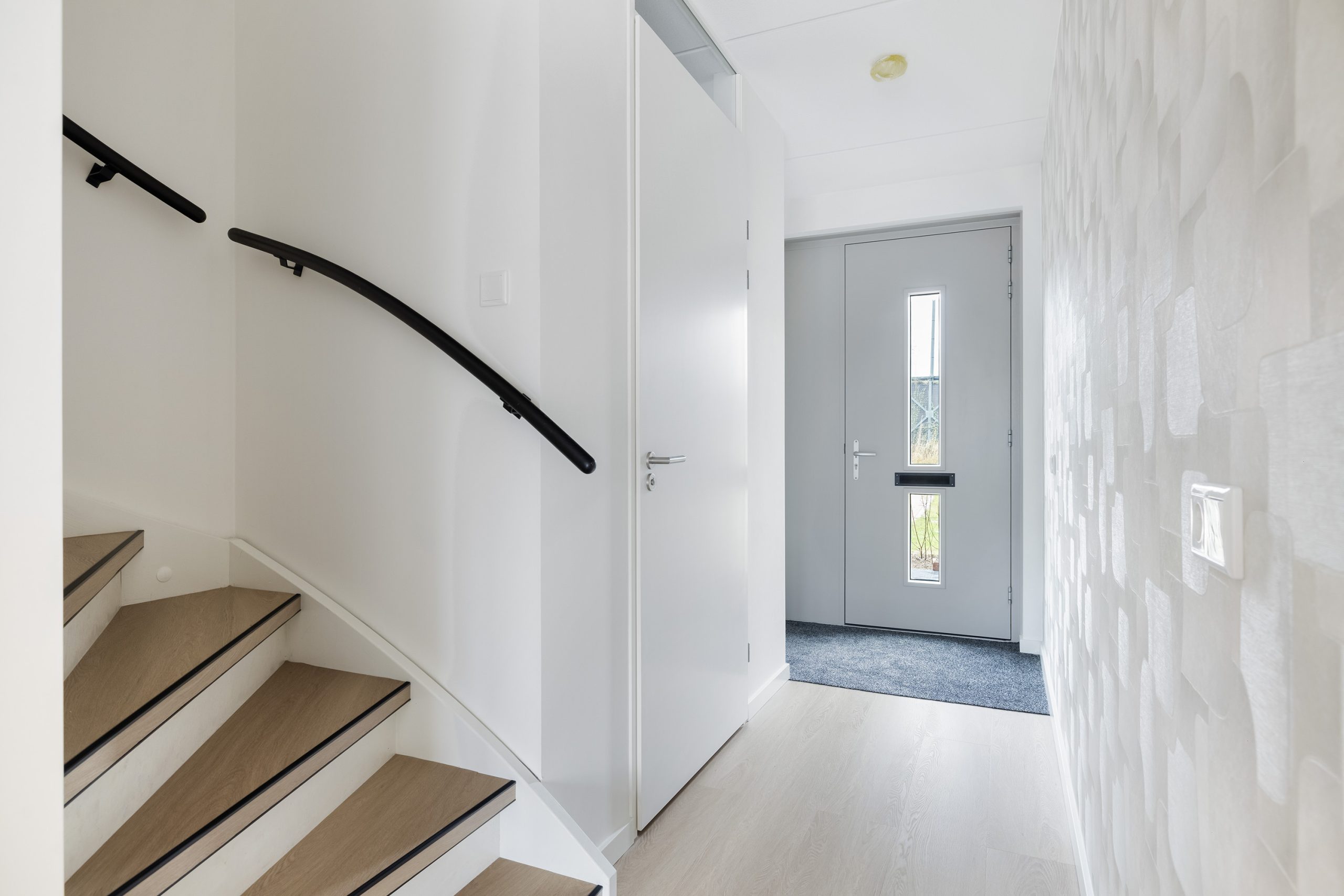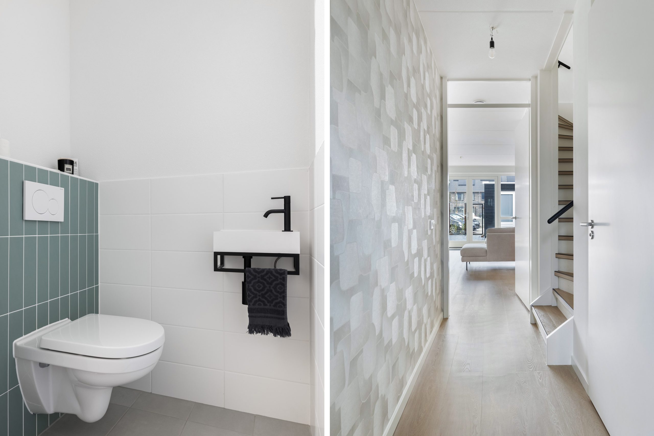 Entree in de hal met toilet, meterkast, trapopgang en toegang tot de woonkamer.