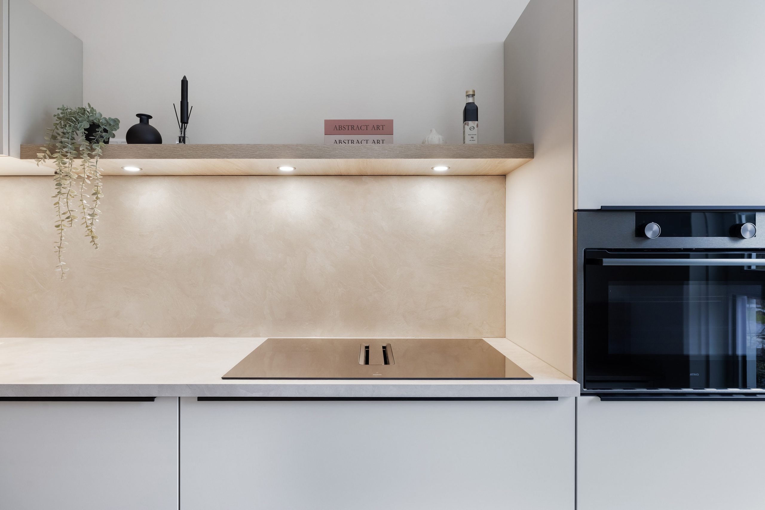 Glasvliesbehang als wandafwerking (lijkt net stuc).
