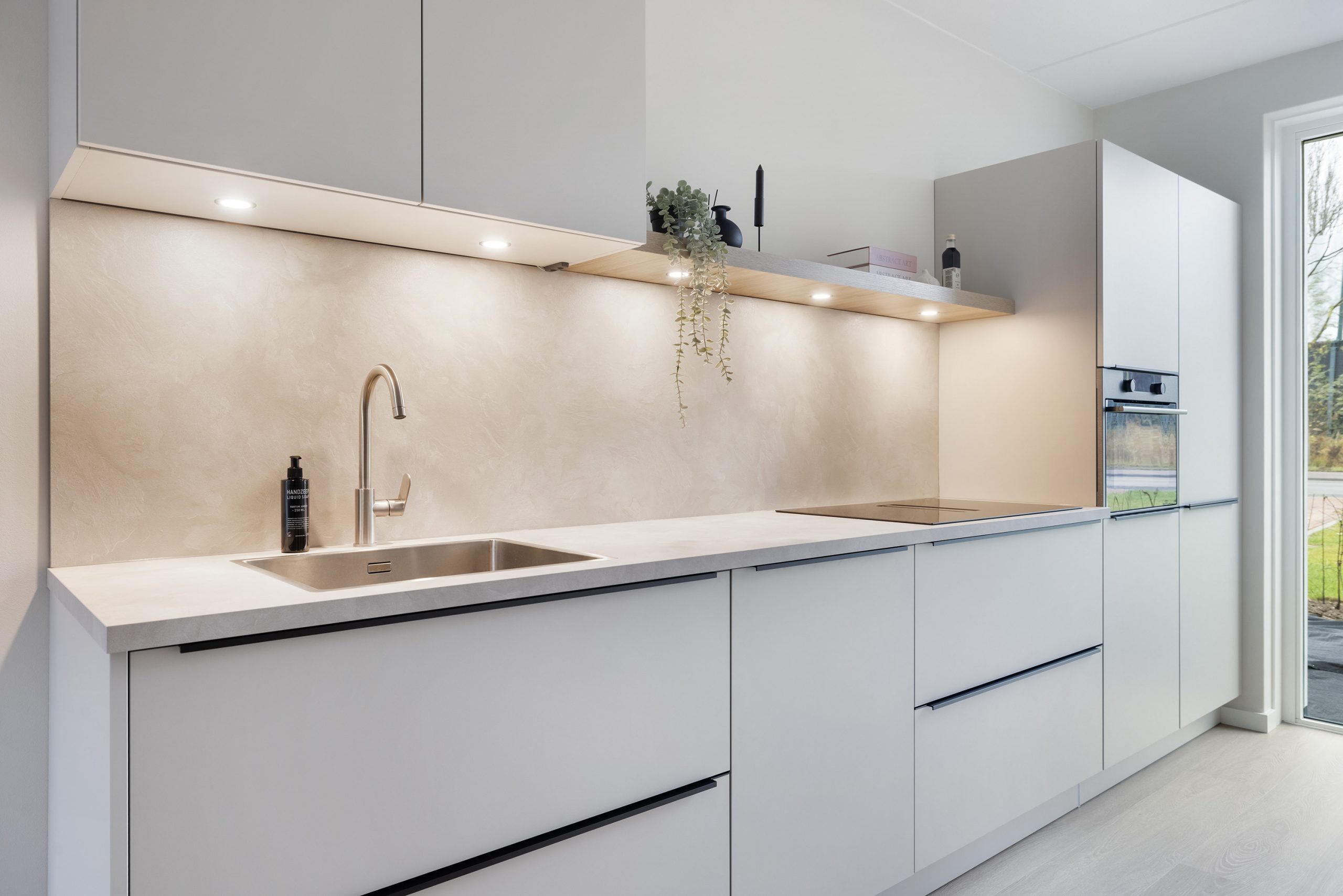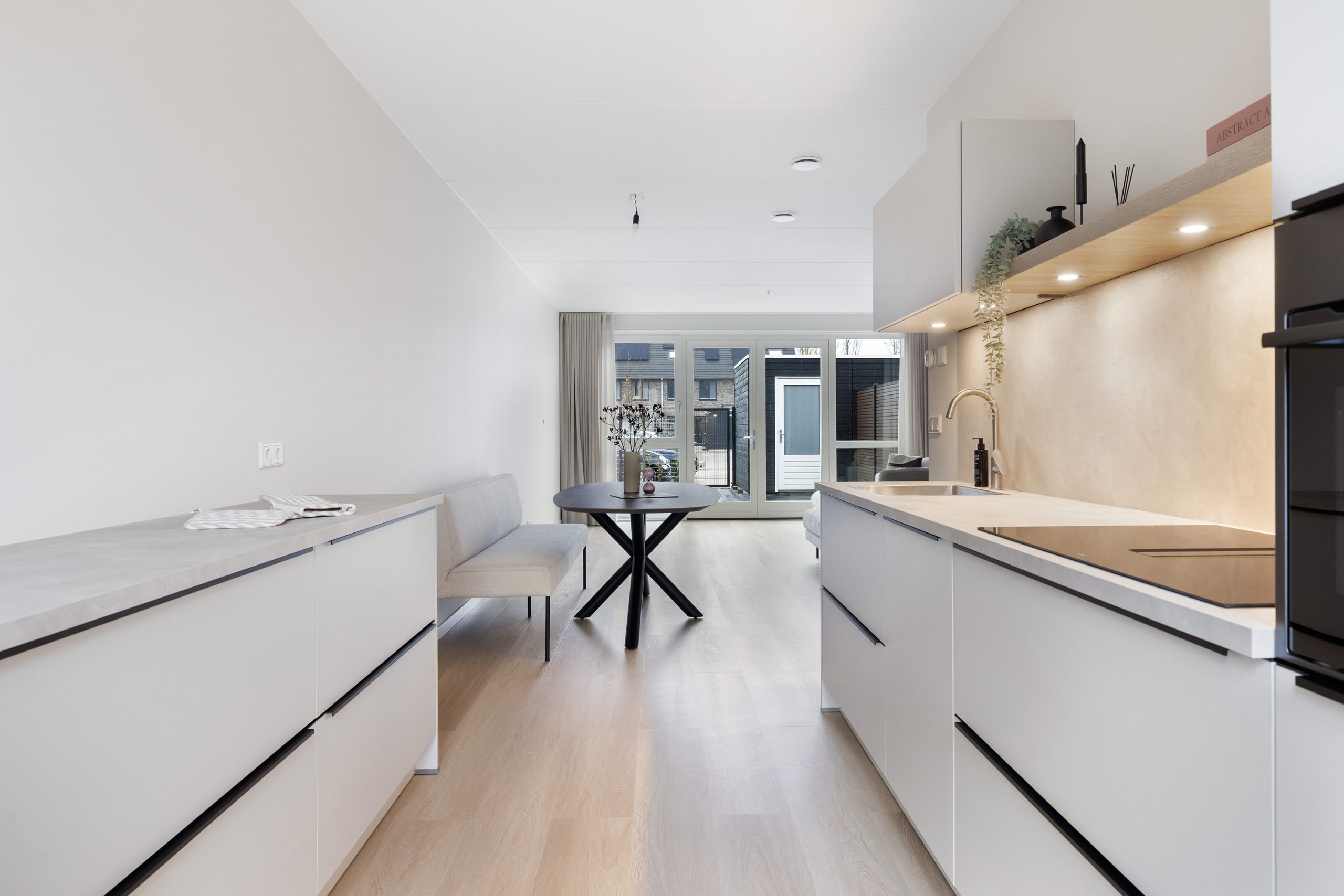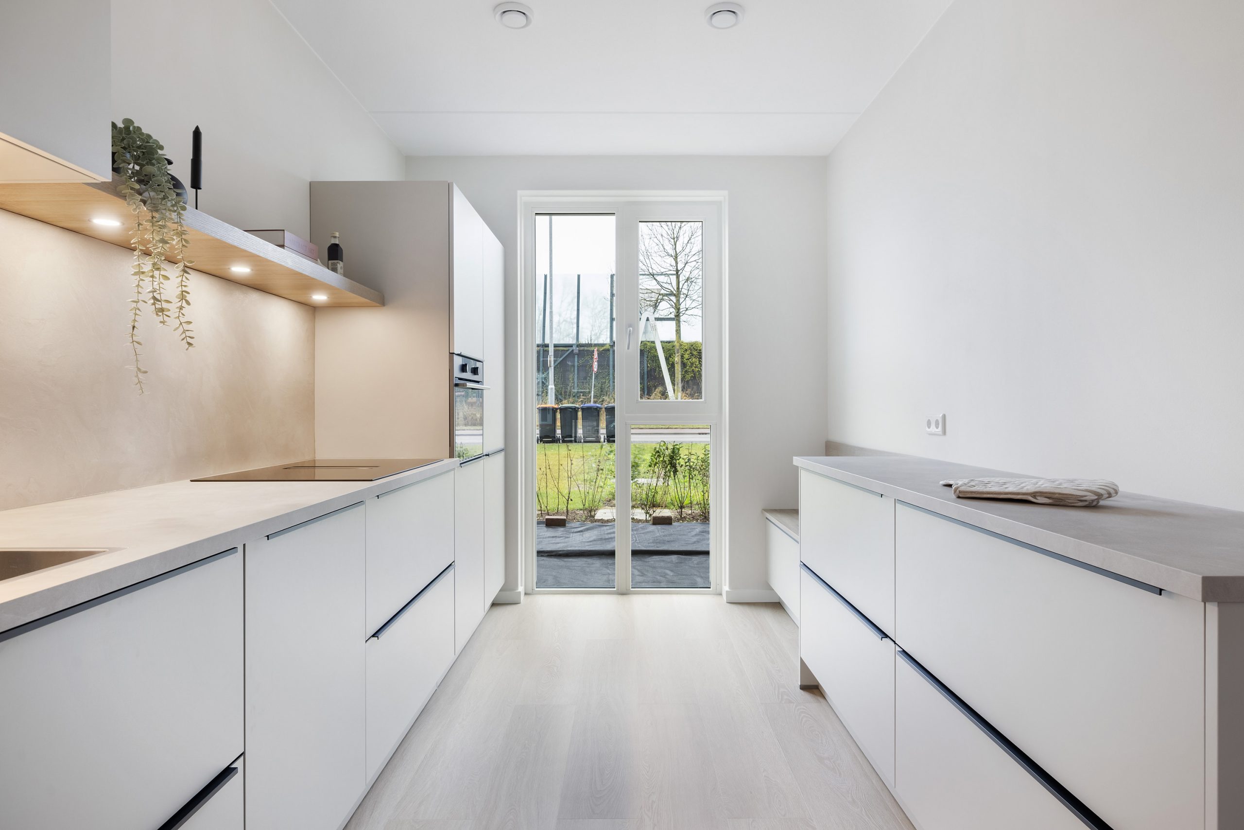 Aan de voorzijde is de open keuken gesitueerd met spoelbak, vaatwasser, inductie kookplaat met afzuiging, koelkast en vriezer, combi oven en sfeer verlichting. De keuken is speels ingedeeld met een zitje in de keuken en veel lichtinval.