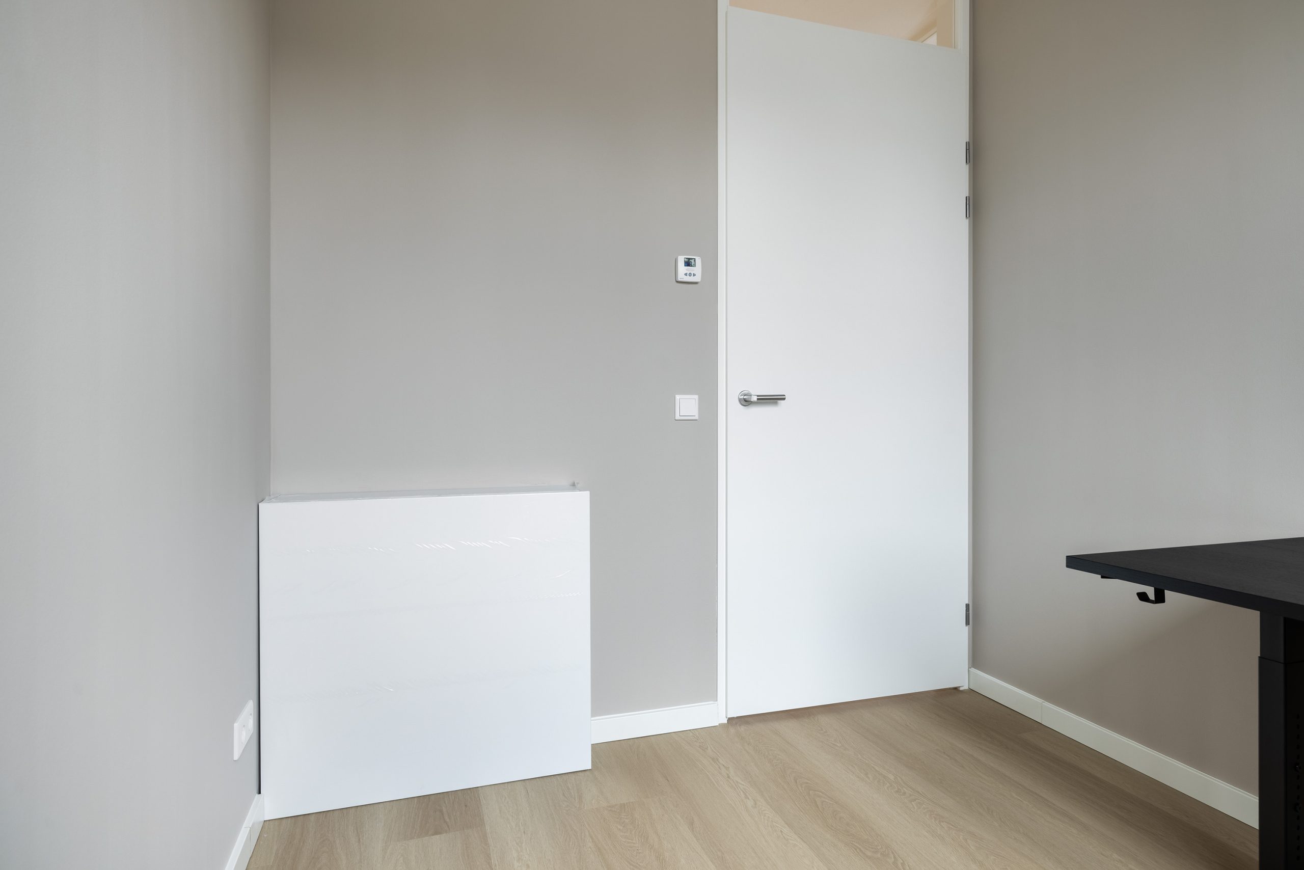 Slaapkamer 3, ook aan de achterzijde gelegen met verdeler van de vloerverwarming, het bureau is ter overname.