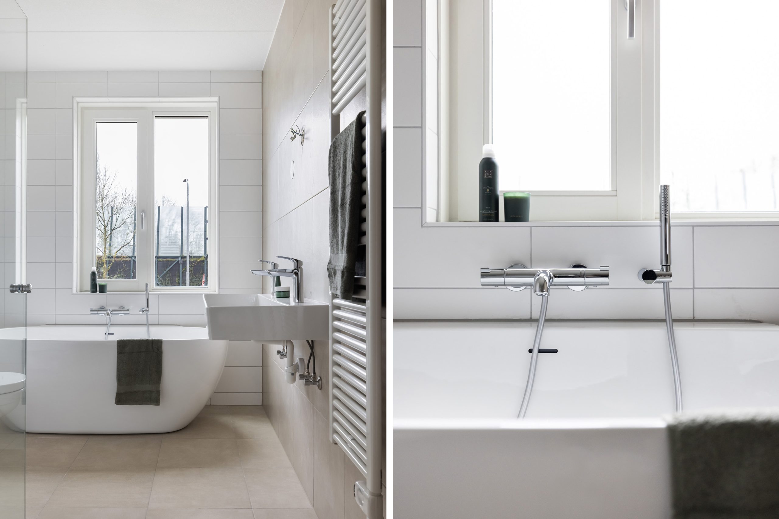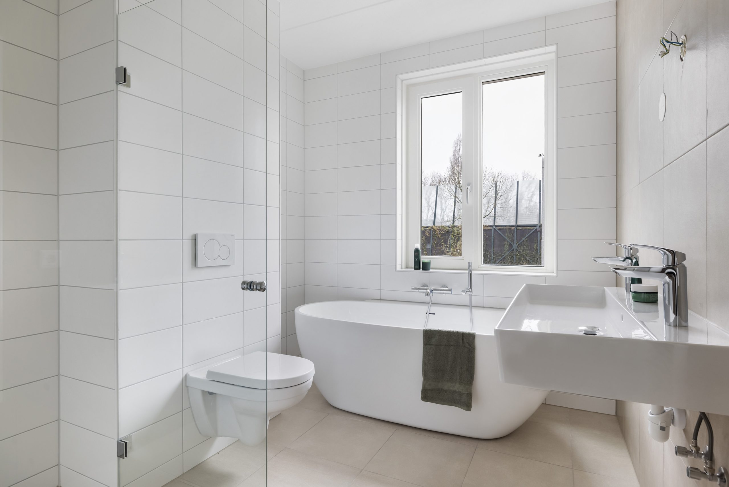 Badkamer met inloop douche en regendouche, half vrijstaand bad met thermostaatkraan, vrijhangend toilet, wastafel met 2 kranen en een design radiator. Er is een aansluiting aanwezig voor een spiegel met licht en verwarming, in de vloer is vloerverwarming aanwezig.
