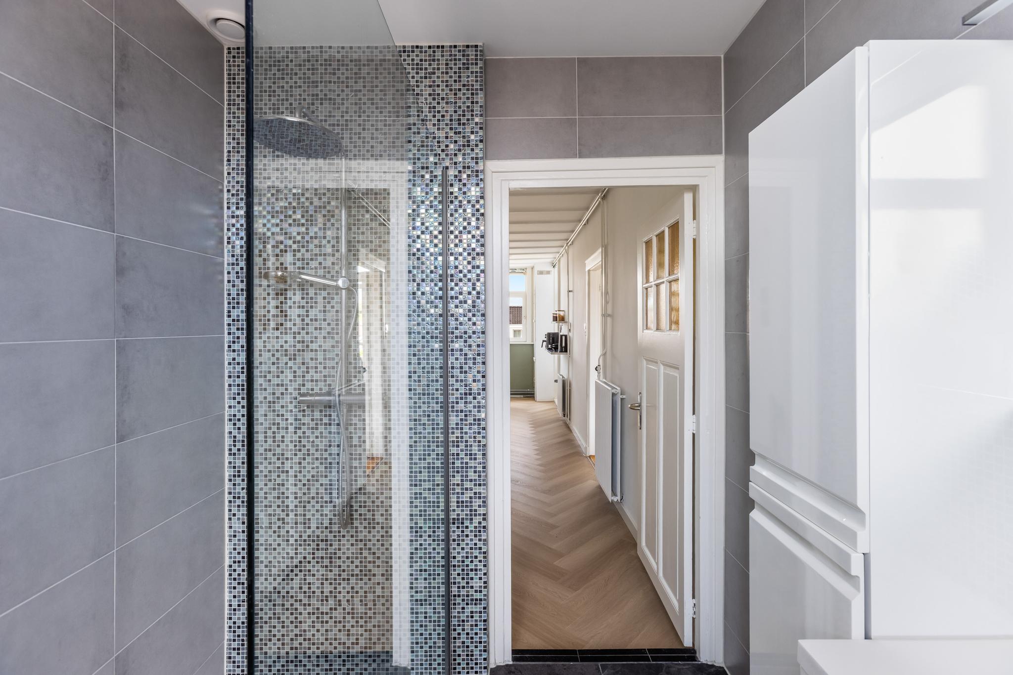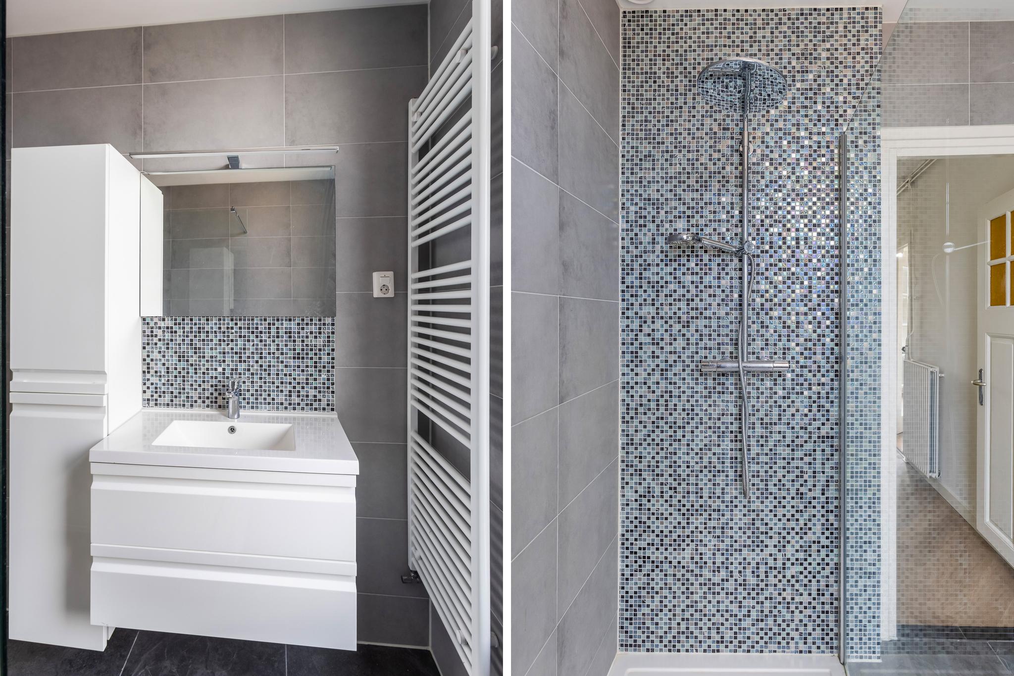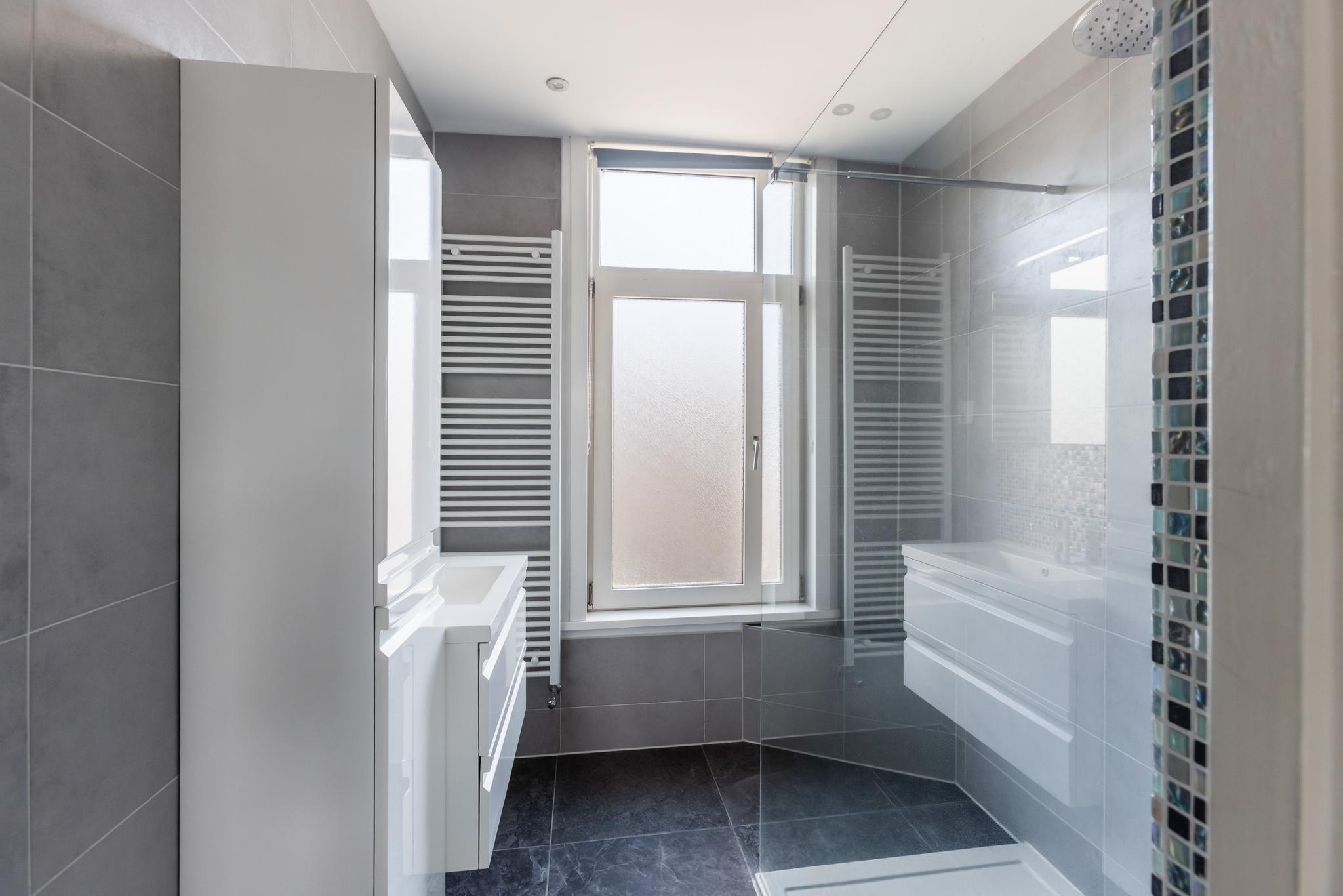 Moderne badkamer met ruime inloopdouche met thermostaatkraan, wastafel in meubel, kolomkast, designradiator en inbouwspots.