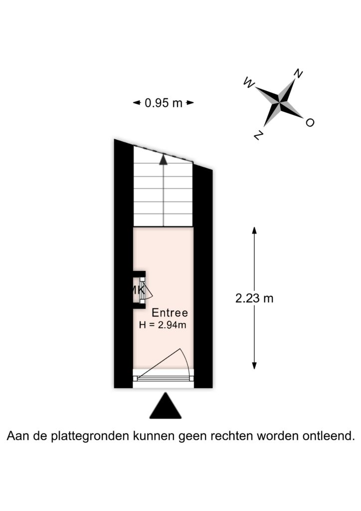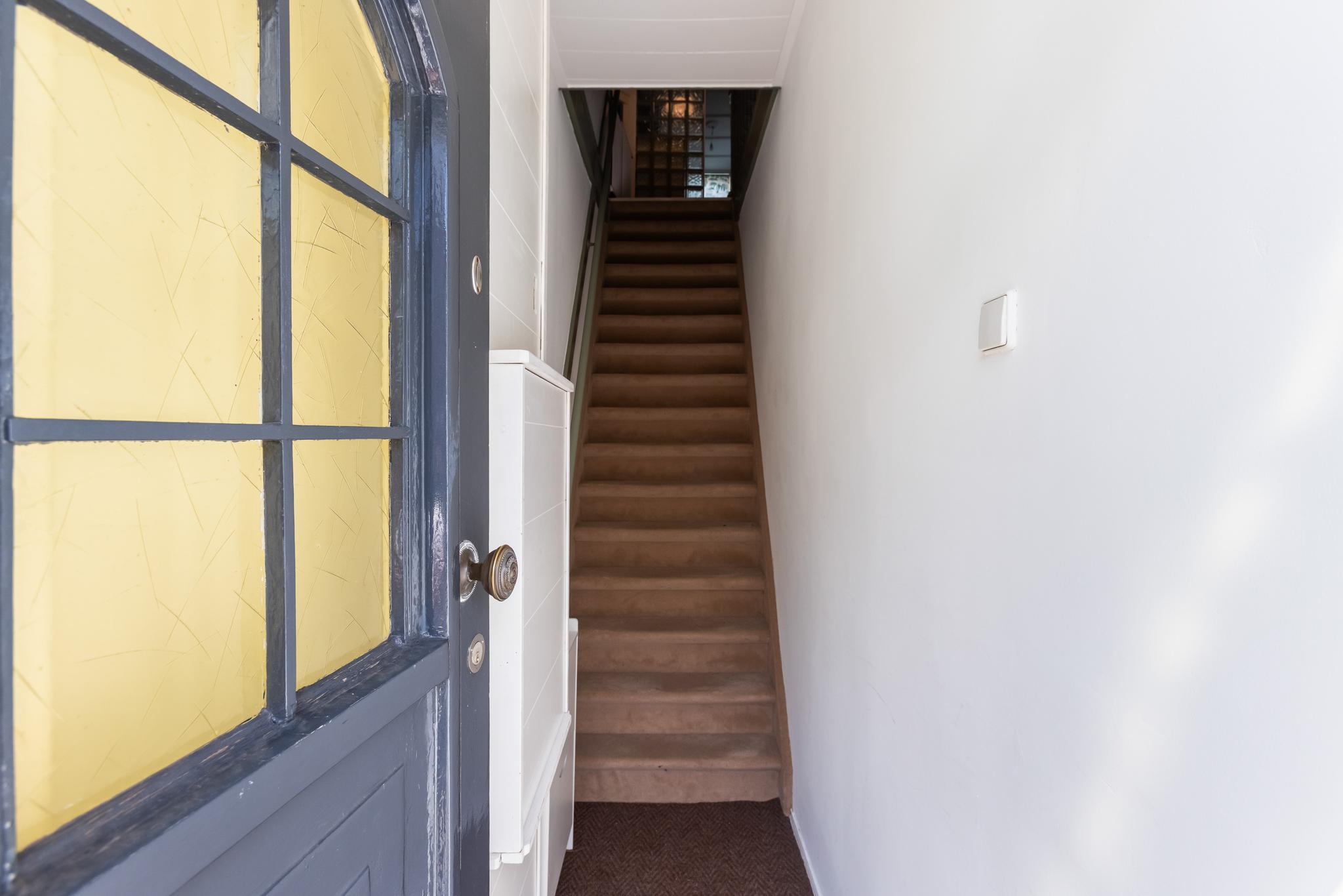 Entree in de hal op de begane grond met meterkast en trapopgang naar de woonverdieping.