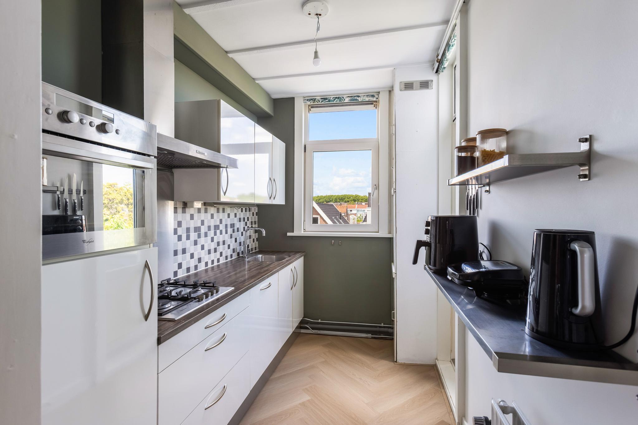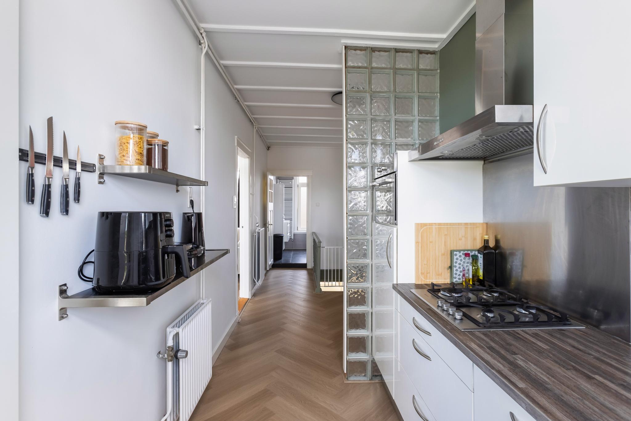 De keuken is vanaf de overloop begaanbaar en wordt deels gescheiden door een wandje met glasblokken. De keuken is ingedeeld in een wandopstelling voorzien van een 4-pits gaskookplaat, afzuigkap, koelkast met vriesvak, vaatwasser en een combi-oven (motor 1,5 jaar geleden vervangen). Tevens bevindt zich in de keuken de opstelplaats CV-ketel (Intergas, 2018), voorzien van een nette ombouw.
