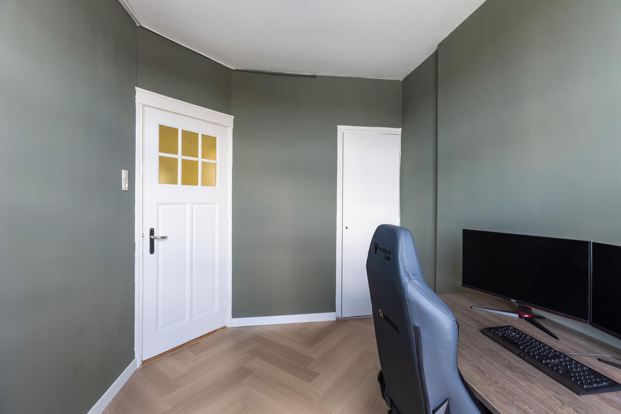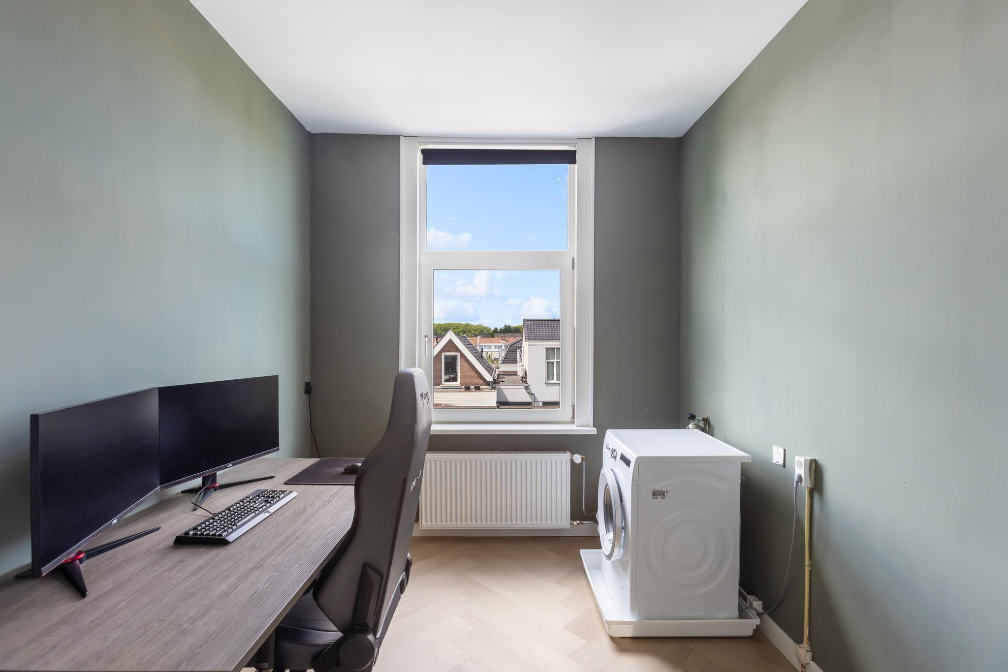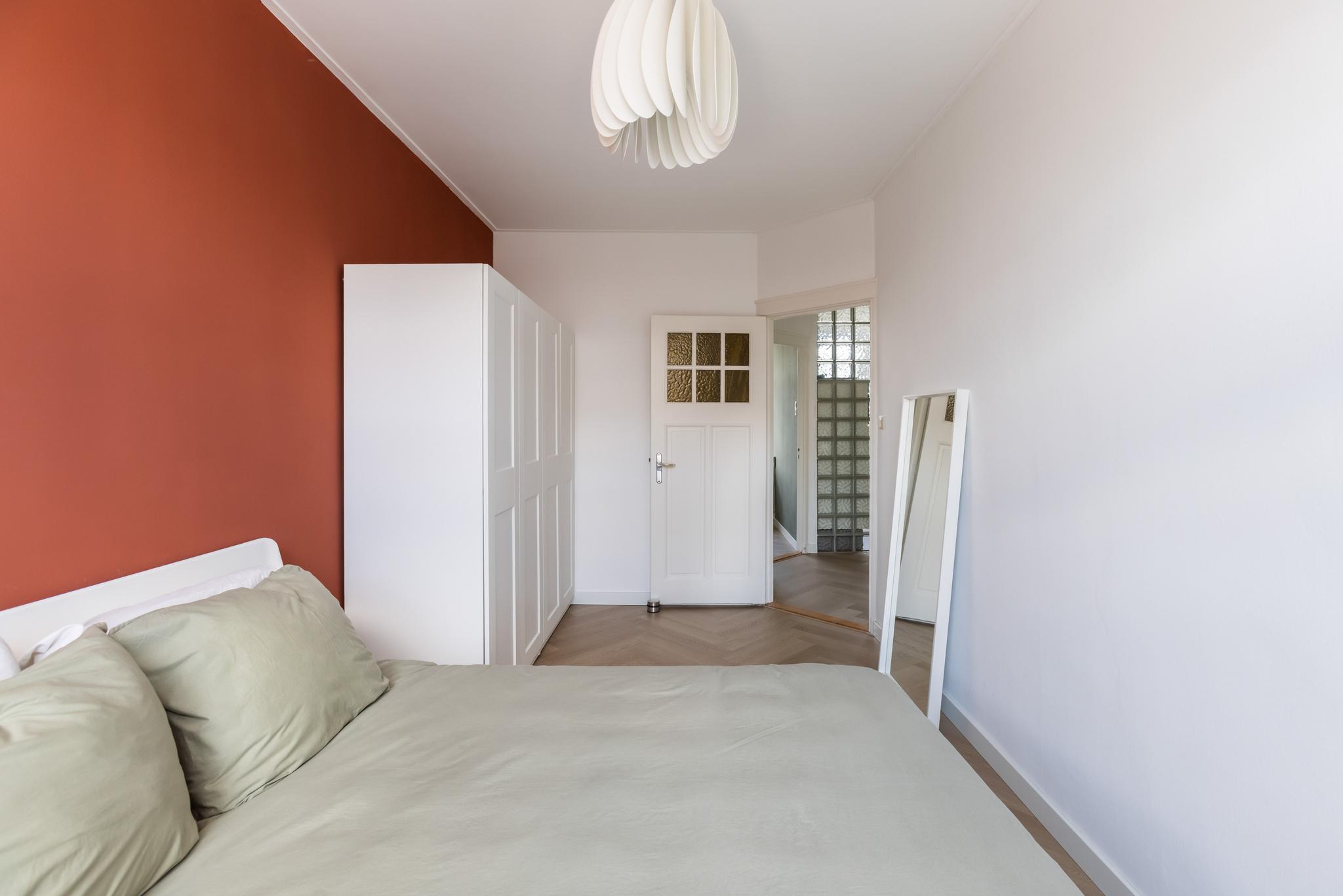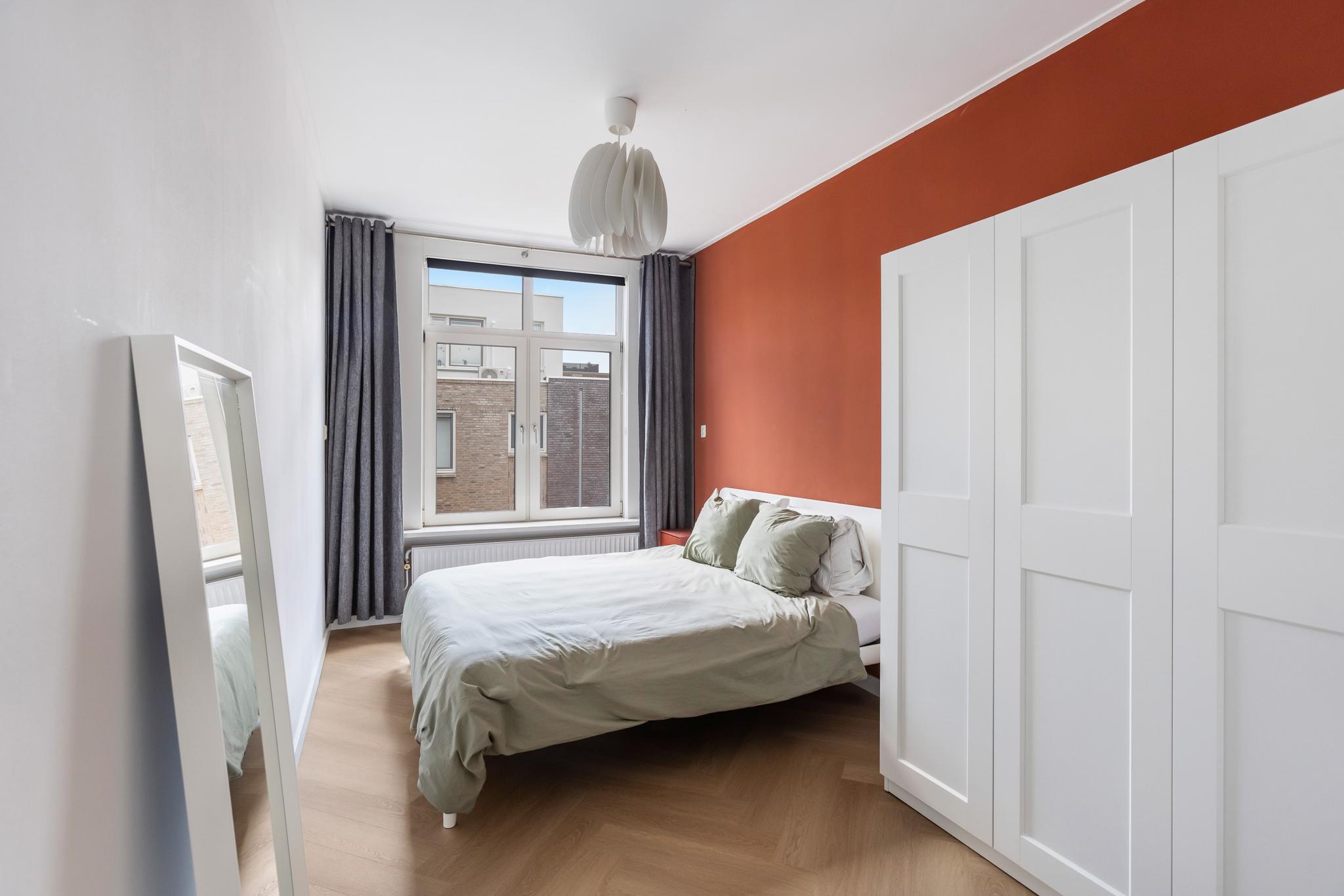 Slaapkamer aan achterzijde met een vaste bergkast en aansluiting wasmachine.