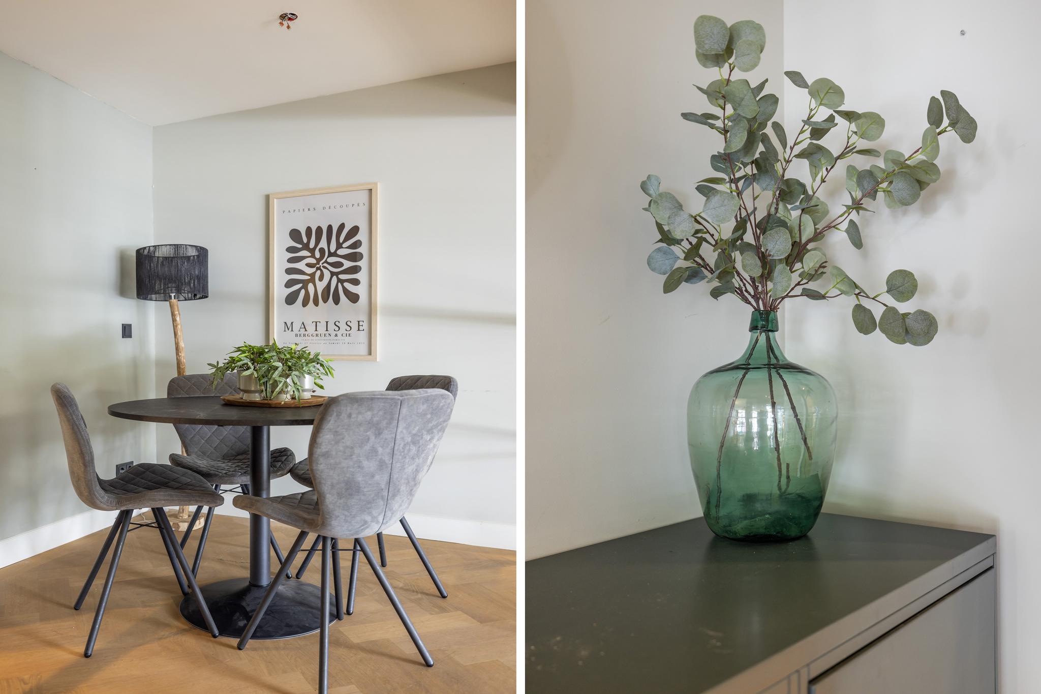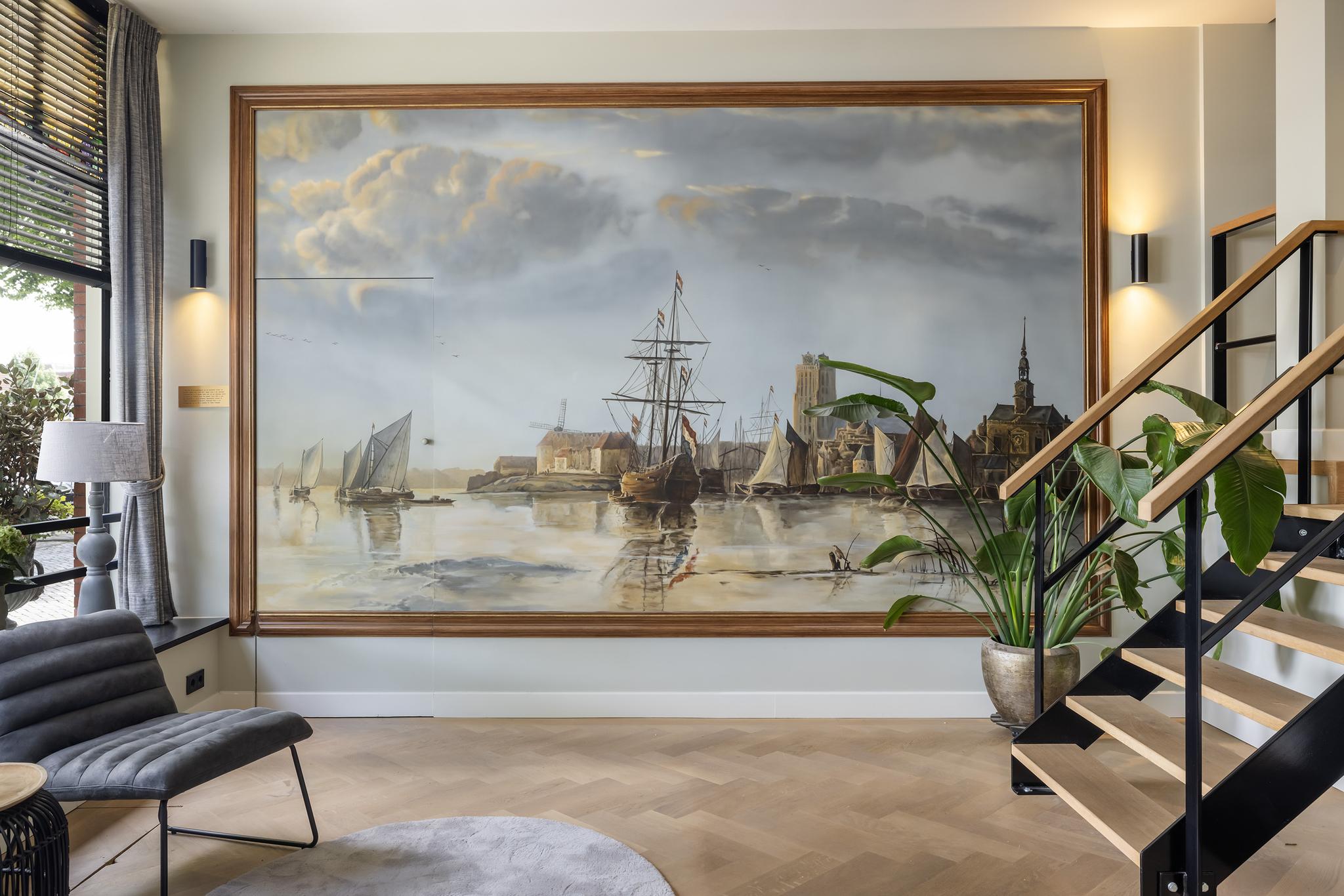 Via een hal met meterkast bereik je de gezellige voorkamer met mooie visgraat-parketvloer, karakteristieke schouw en grote voorpui met glas-in-lood ramen. Maar wat deze ruimte vooral bijzonder maakt, is de grote replica van het bekende schilderij 'Gezicht op Dordrecht' van de schilder Albert Cuyp.