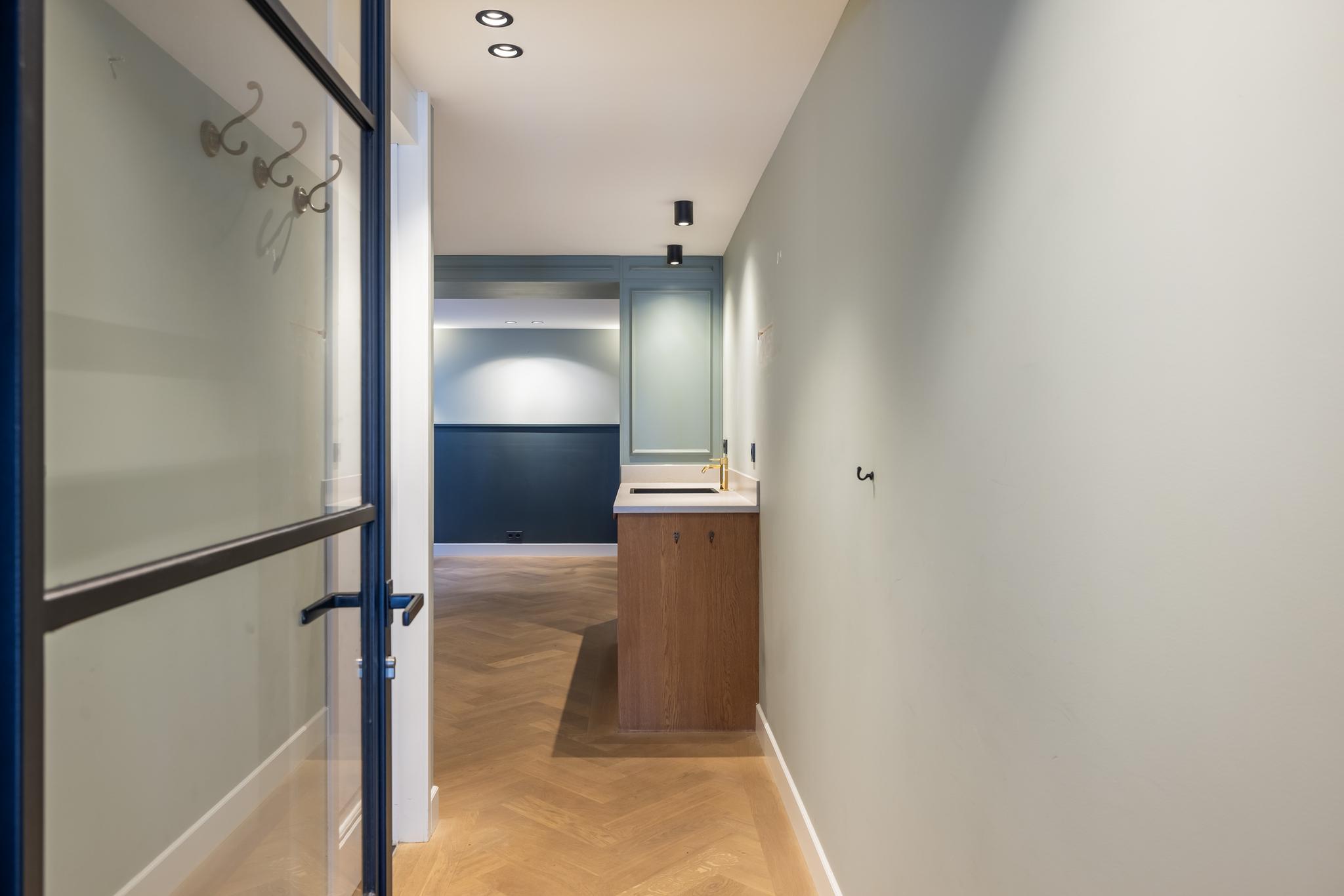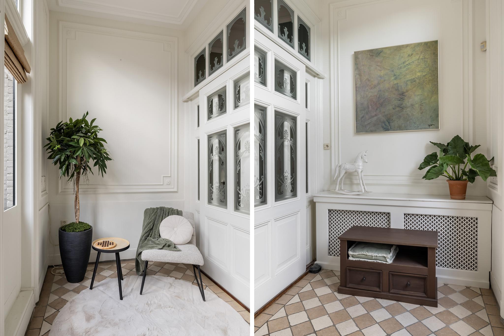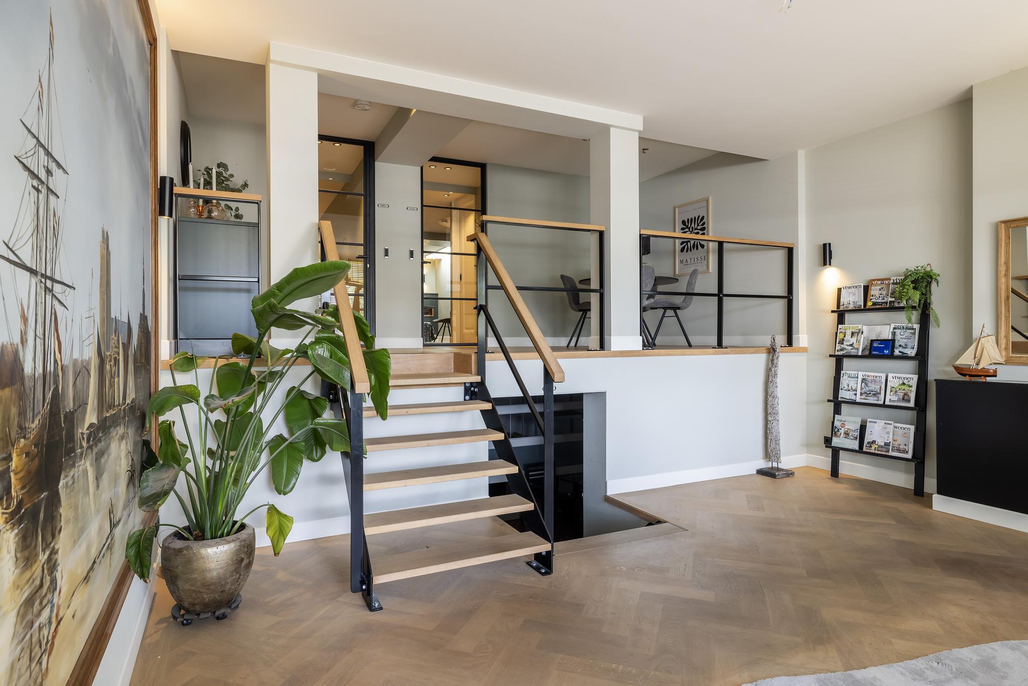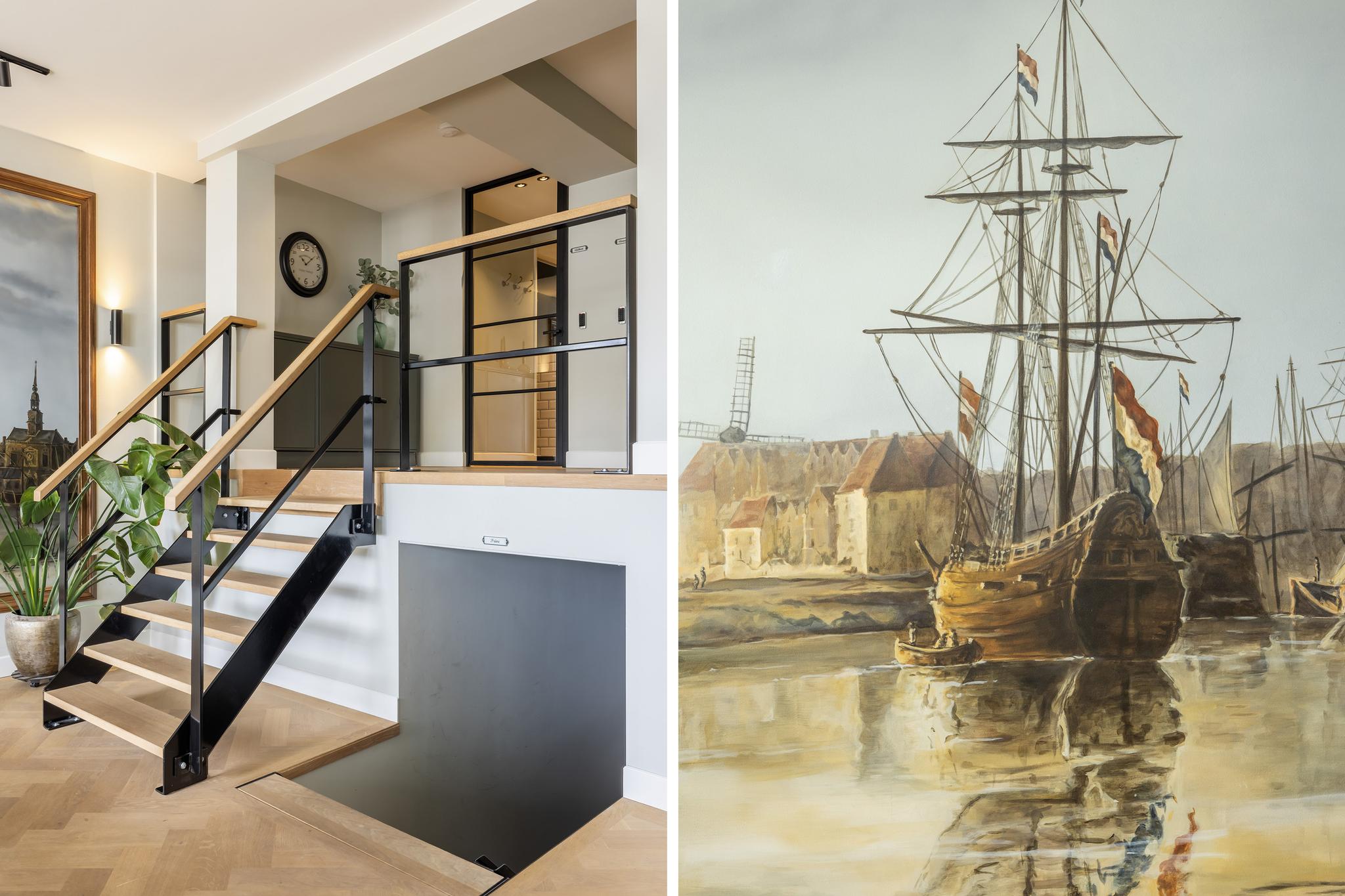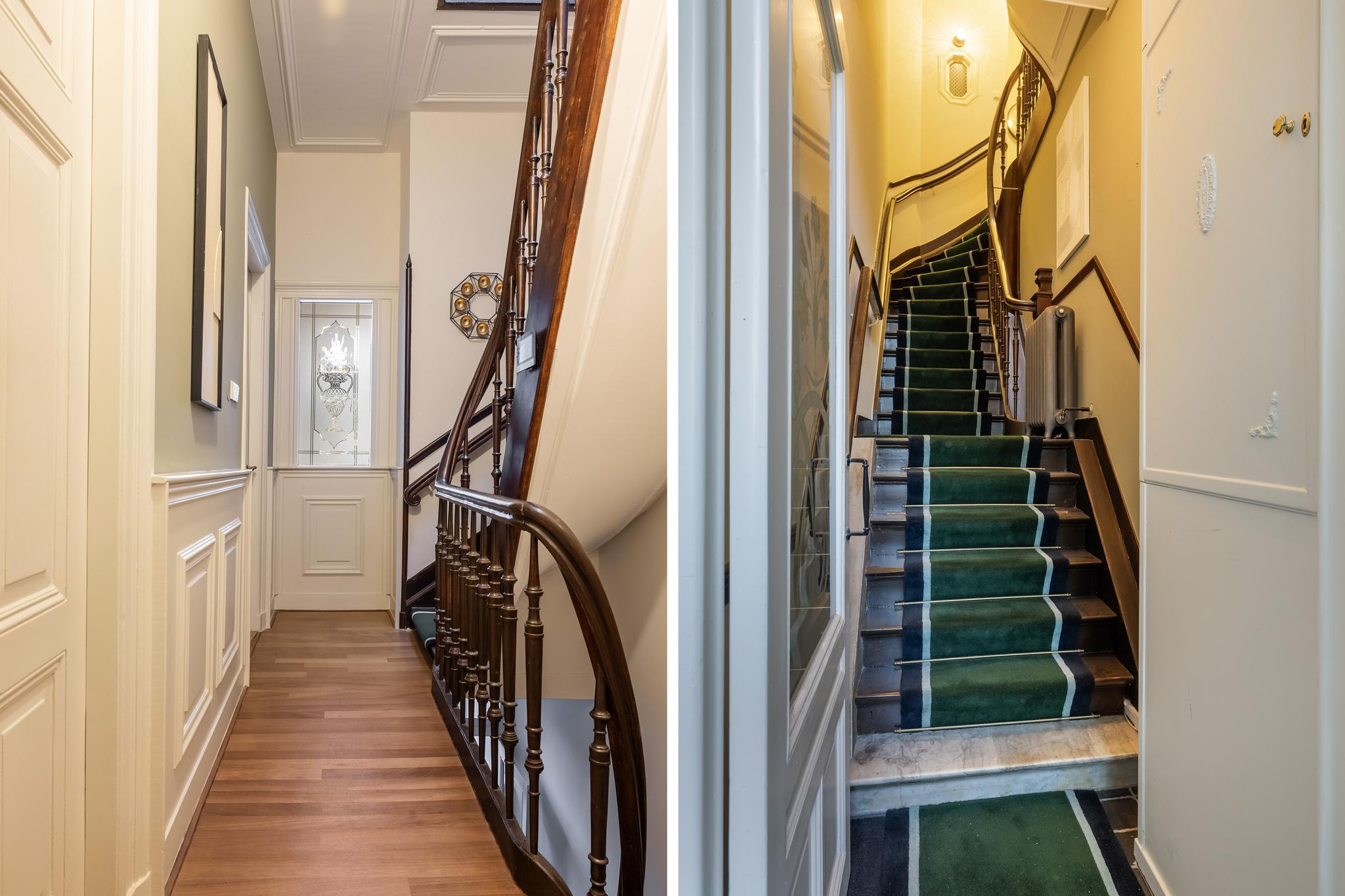 Door naar de bovenwoning, want die is eveneens indrukwekkend te noemen! Via de doorgang in het schilderij bereiken we de hal met trap naar de 1e verdieping. Deze hal is uiteraard ook via de eigen voordeur begaanbaar.