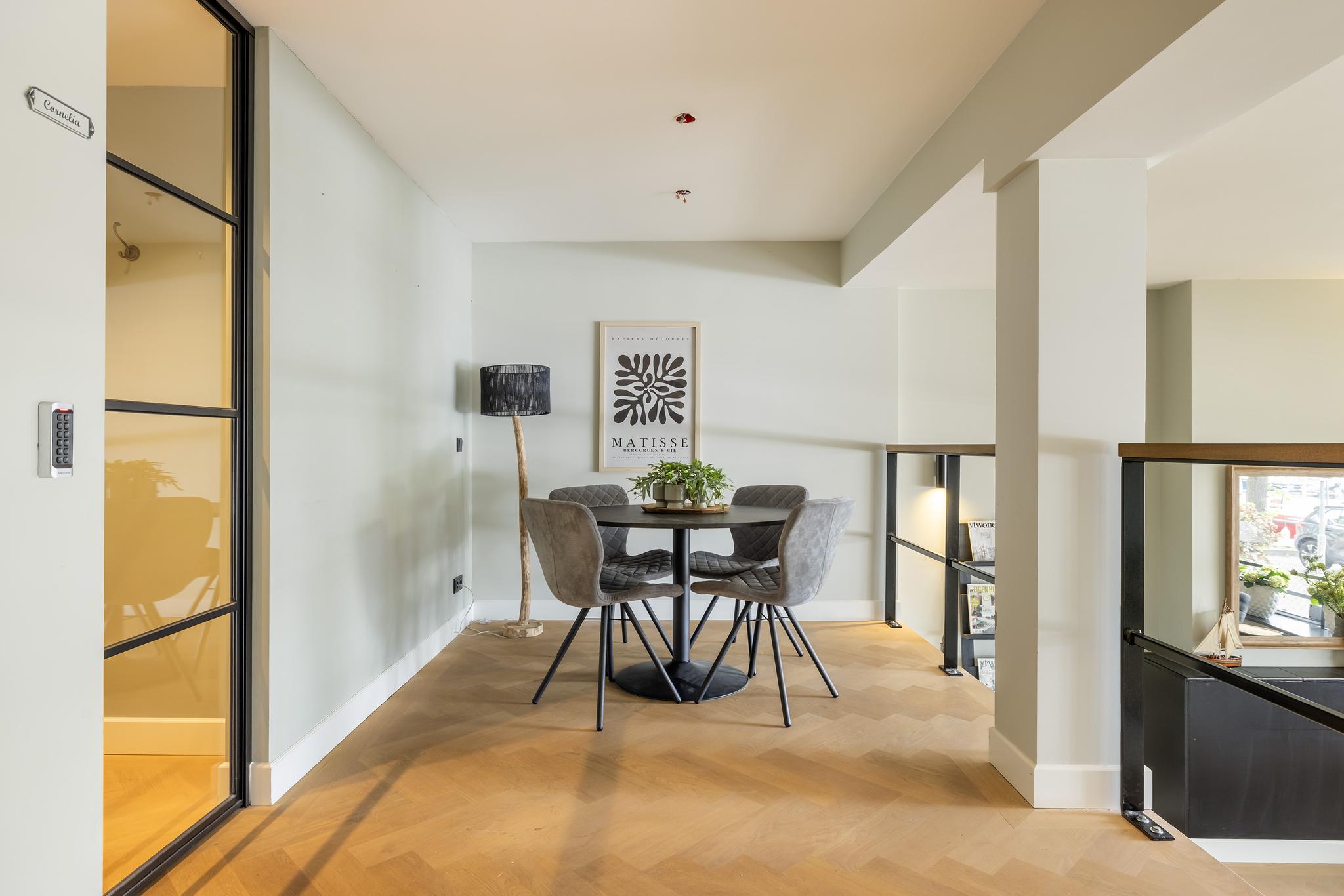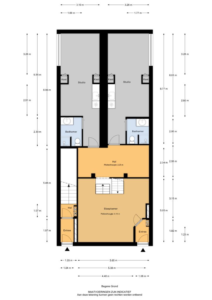Vanuit de voorkamer is via een trapje de split-level verdieping bereikbaar met mooie gemeenschappelijke ruimte en toegang tot de twee moderne studio's. De kamers zijn gespiegeld en vrijwel identiek afgewerkt.