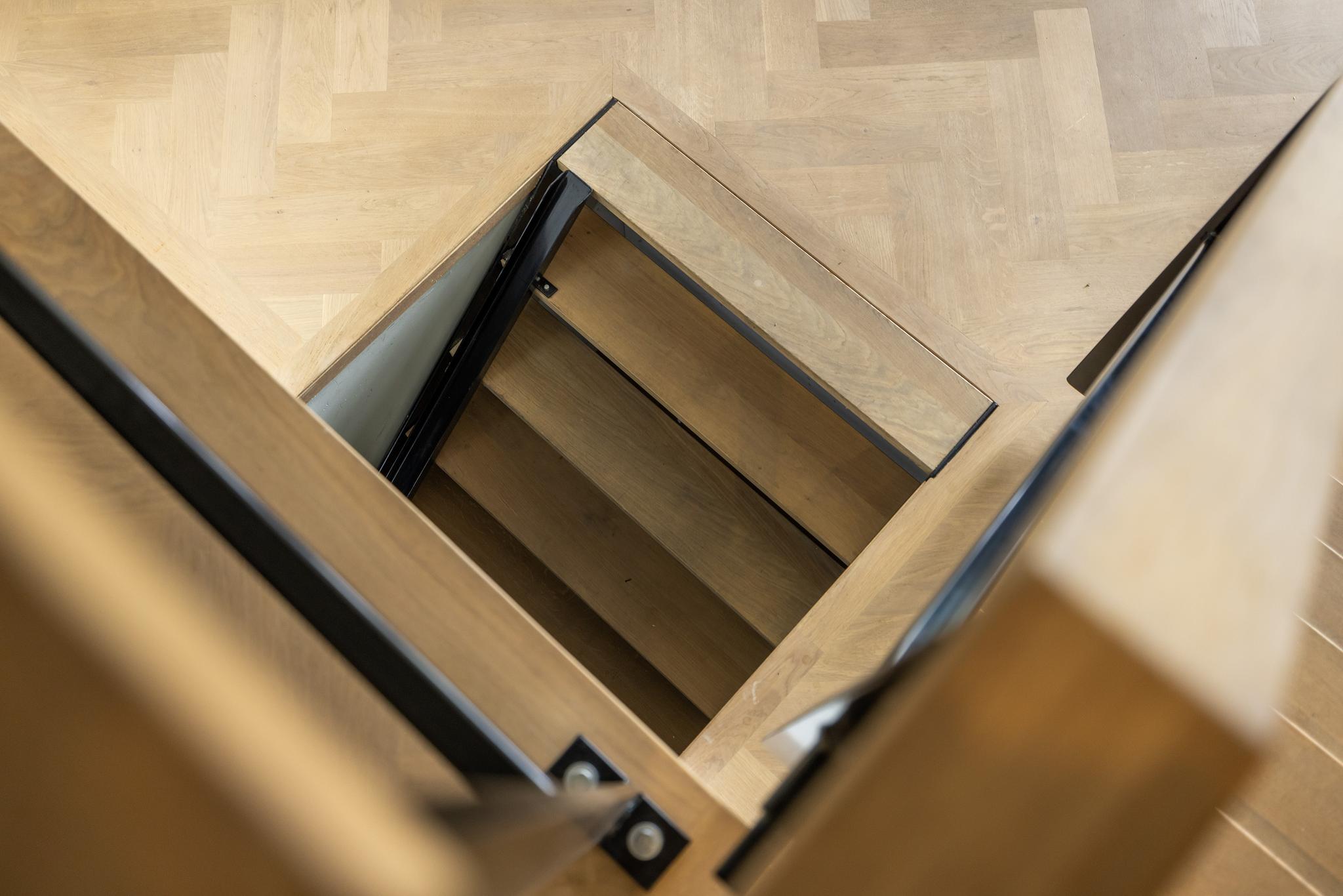 Onder de karakteristieke trap met loper bevindt zich een kleine kelder die bereikbaar is door de trap omhoog te tillen. Verder bevindt zich in de hal de meterkast voor de bovenwoning.