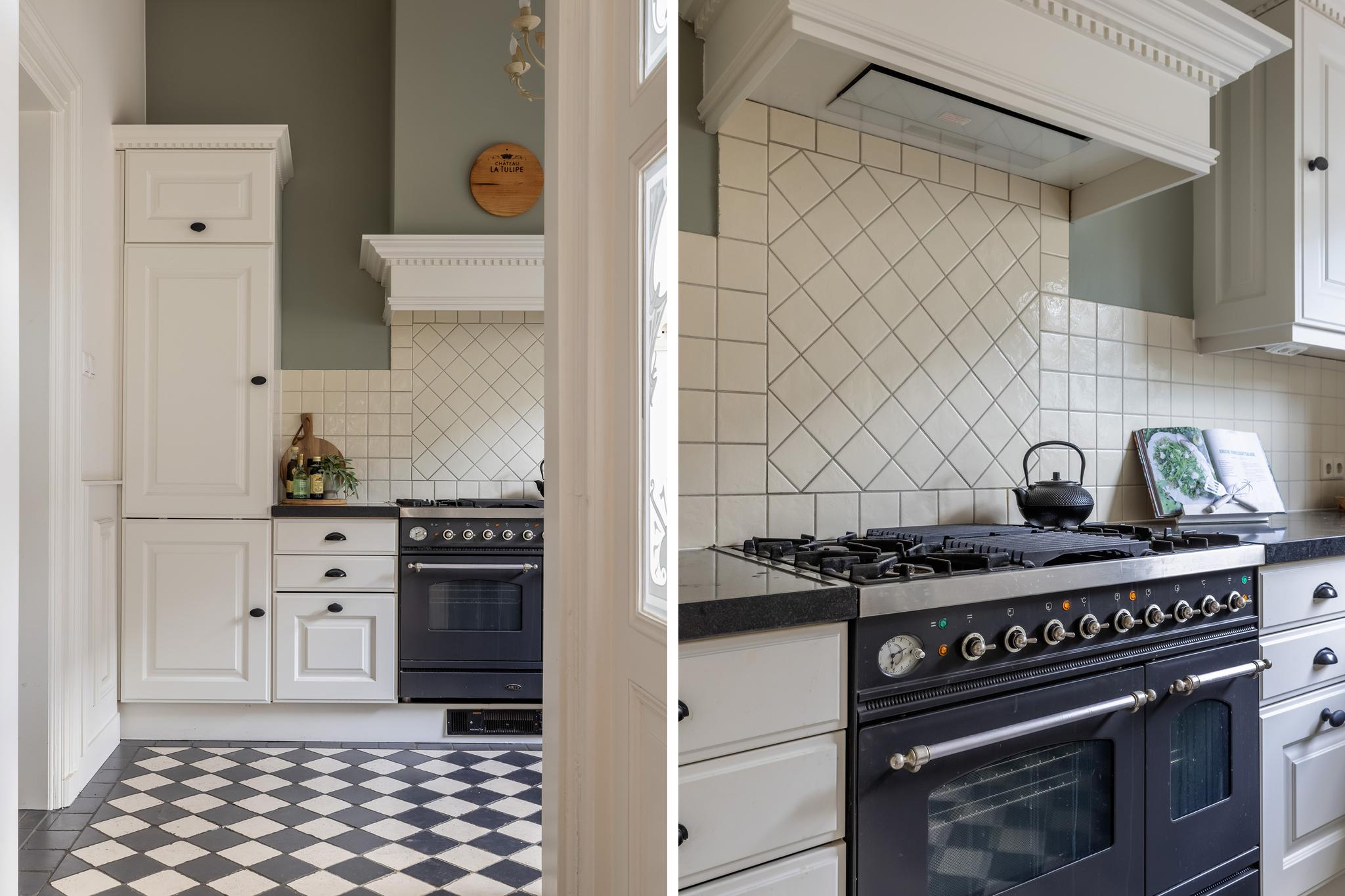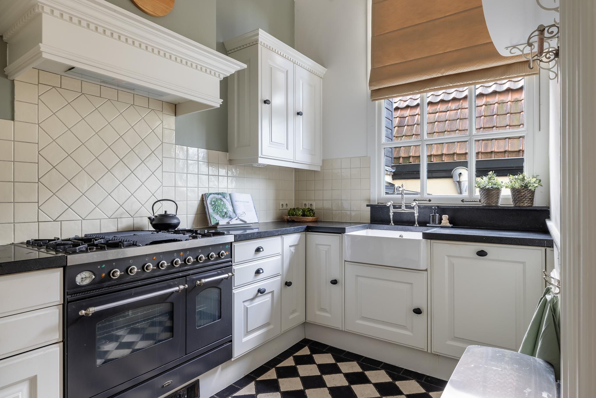 De keuken in L-opstelling is voorzien van houten kasten, een granieten werkblad, Boretti fornuis en oven, afzuigkap, vaatwasser, porseleinen spoelbak, carouselkast en losse koel-vries combinatie in de naastgelegen nis. De keukenruimte is afgewerkt met een tegelvloer in ruitpatroon.