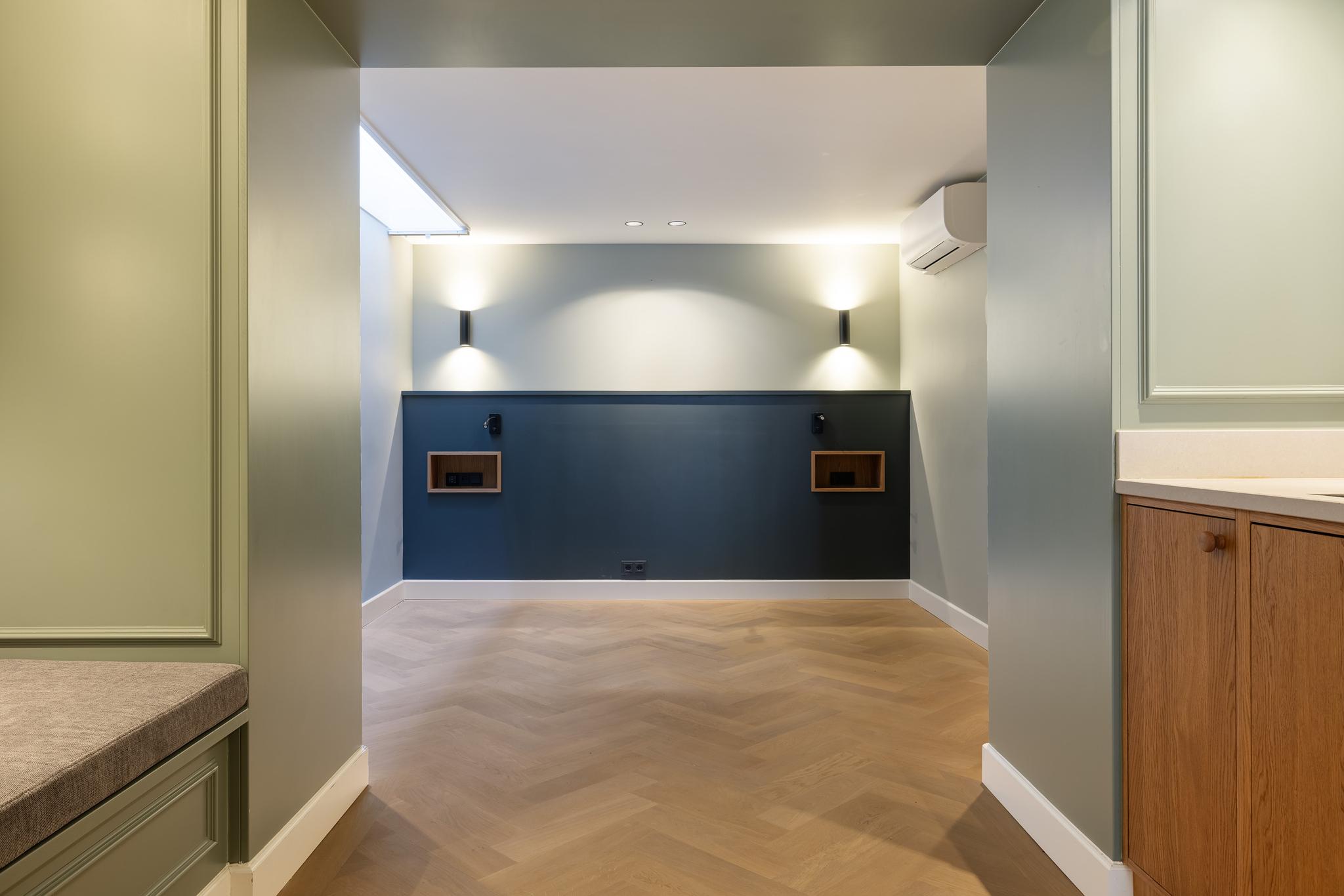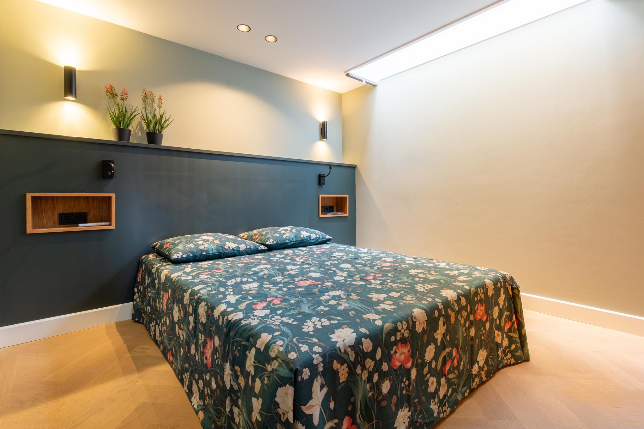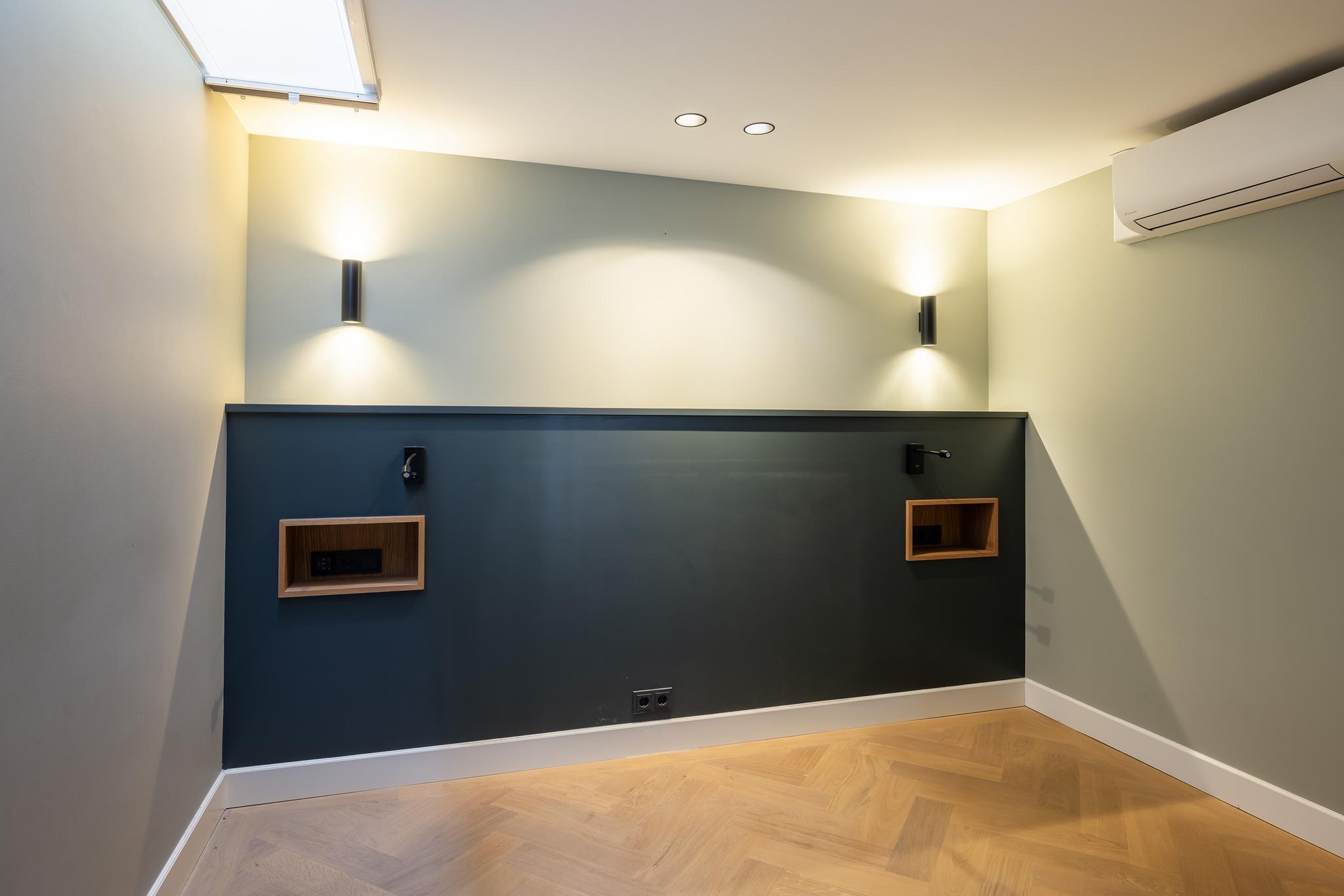 Ruime kamer met wastafelmeubel, hardhouten parketvloer, inbouwspots en dubbele deuren naar het royale dakterras. Deze kamer is multifunctioneel; slaapkamer, hobbyruimte, atelier, voor ieder wat wils!