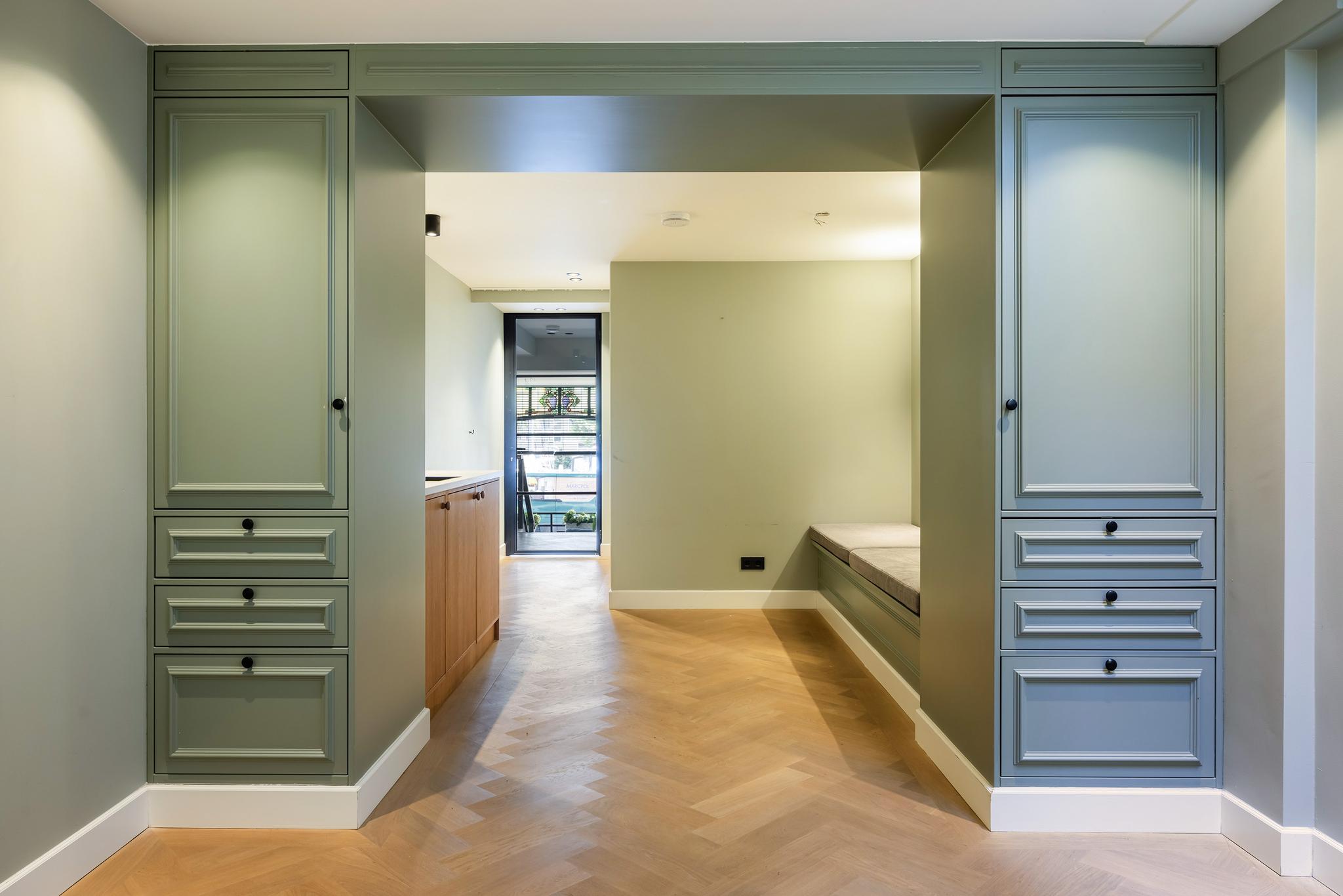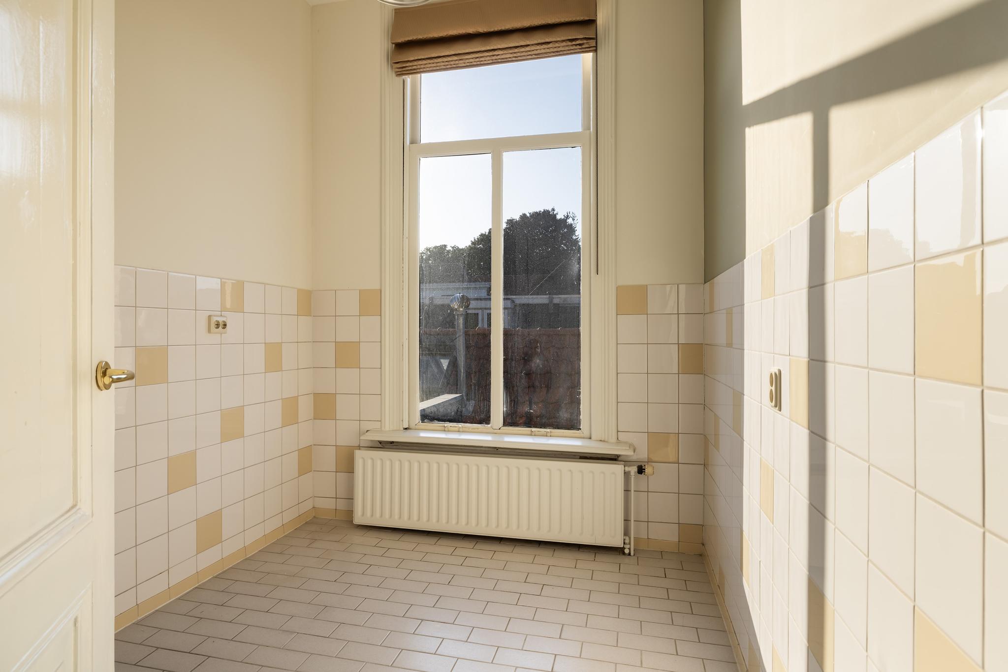 De riante woonkamer is door de hoge ornamenten plafonds, marmeren schouwen, en-suite deuren en de kenmerkende erker met glas-in-lood ramen zeer sfeervol te noemen. De voorkamer beschikt verder over een grote kastenwand, vaste kasten in de en-suite scheiding en een gashaard en is afgewerkt met een parketvloer en lambrisering. Vanuit deze ruimte heb je een fantastisch uitzicht over de Nieuwe Haven, net een levend schilderij!