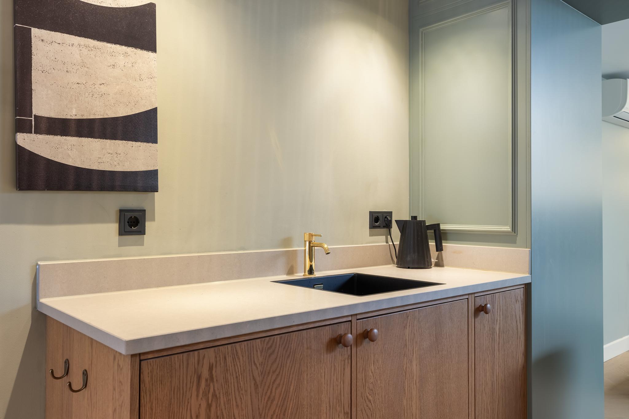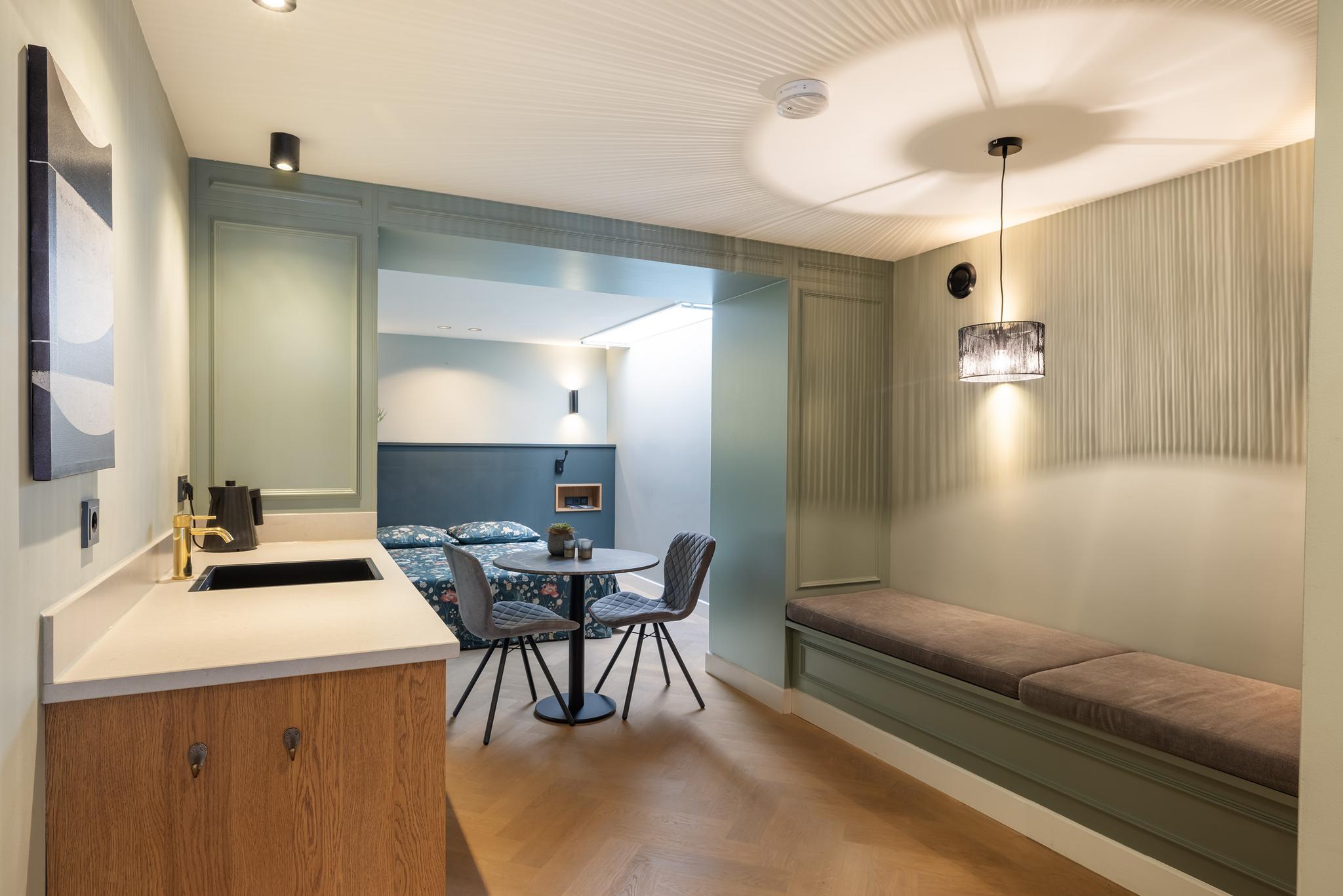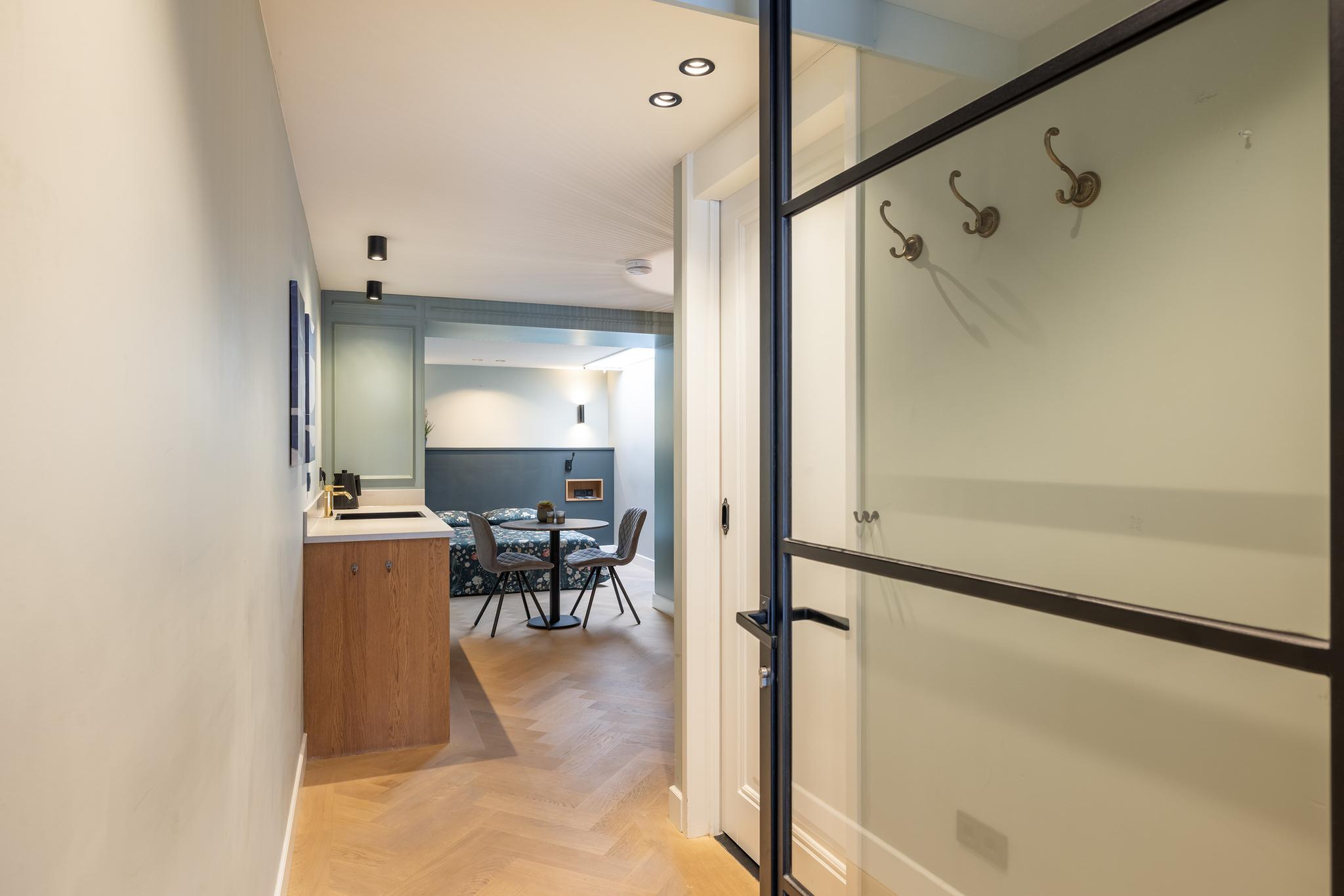 De studio's zijn te betreden middels een stalen deur met glas en beschikken over een keukenblokje met koelkast en spoelbak, een gezellig zithoekje met vaste bank, een slaapruimte en een badkamer en-suite. De kamer is voorzien van een visgraat parketvloer, gestucte wanden en plafond, lichtstraat, airconditioning en vaste kasten met opstelplaats CV-ketel, mechanische ventilatie, kluisje en bergruimte. De badkamer is volledig betegeld en beschikt over een wasmeubel met kom, douche met thermostaatkraan en toilet.