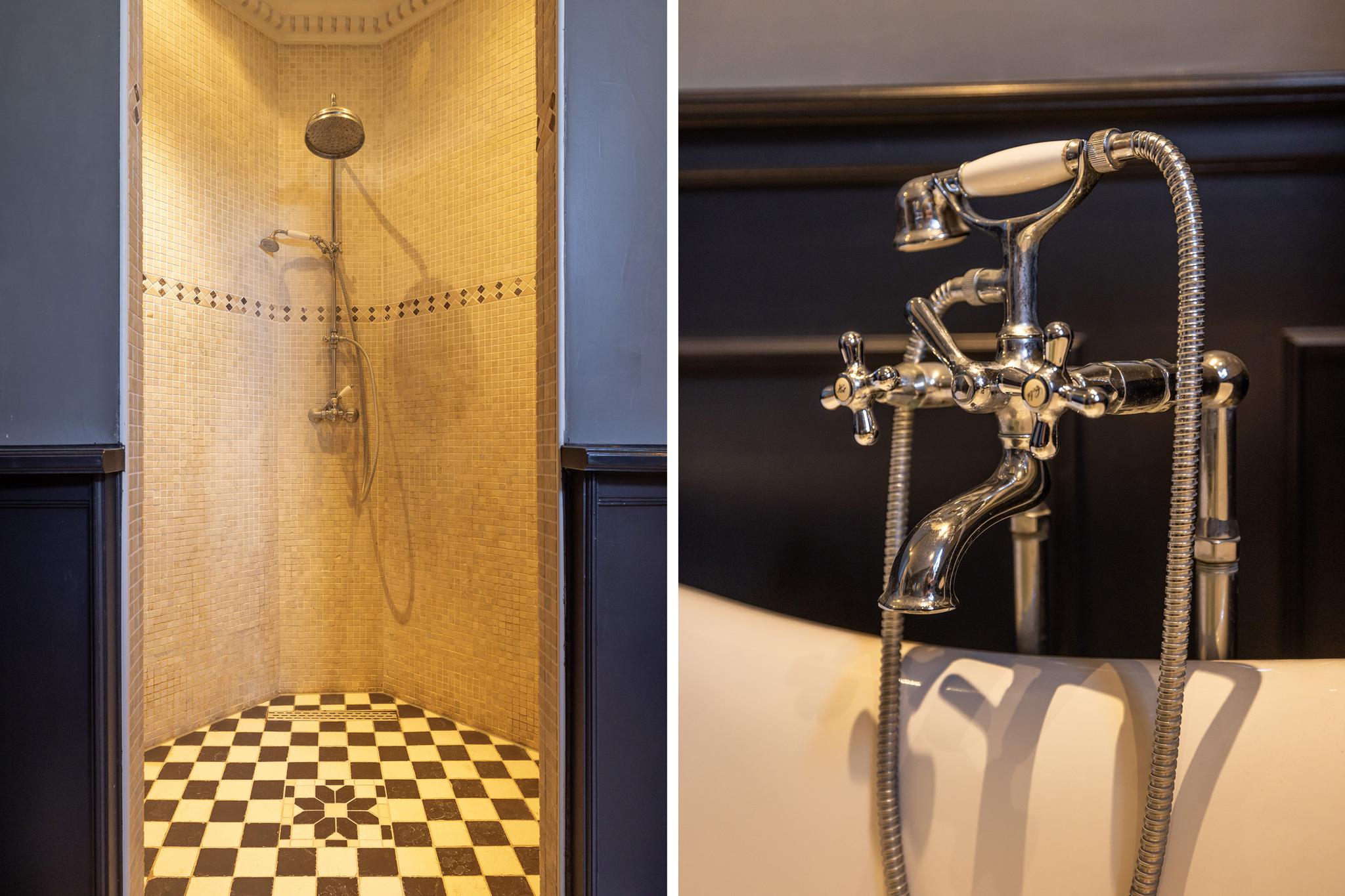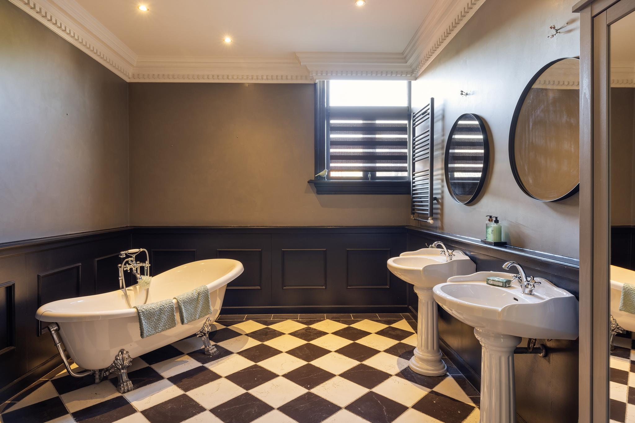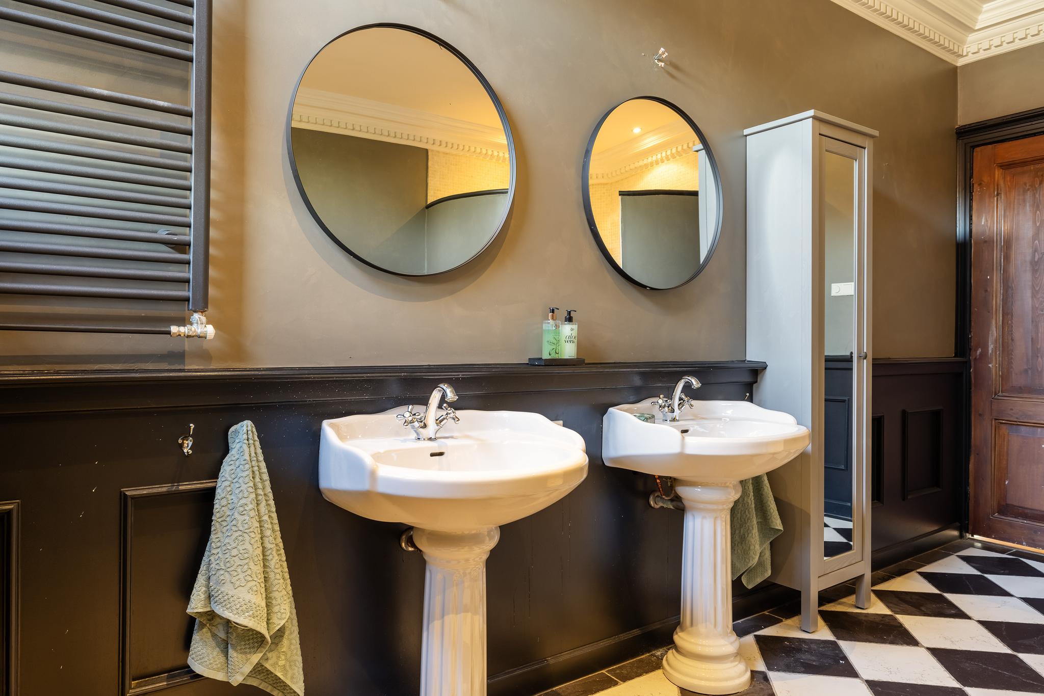 Grote badkamer met vrijstaand ligbad, dubbele wastafel met zuil, ronde inloopdouche, designradiator, lambrisering en inbouwspots.