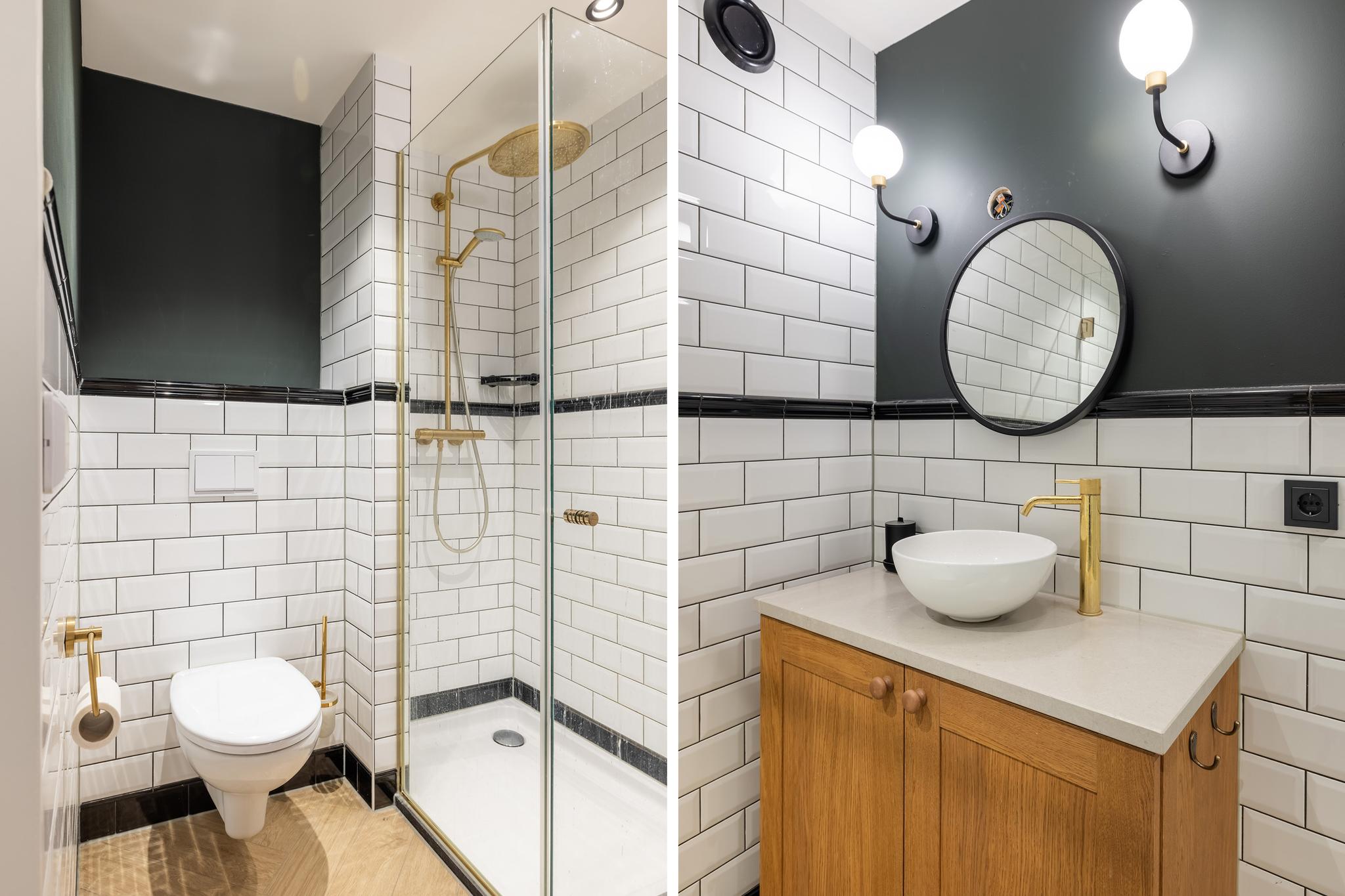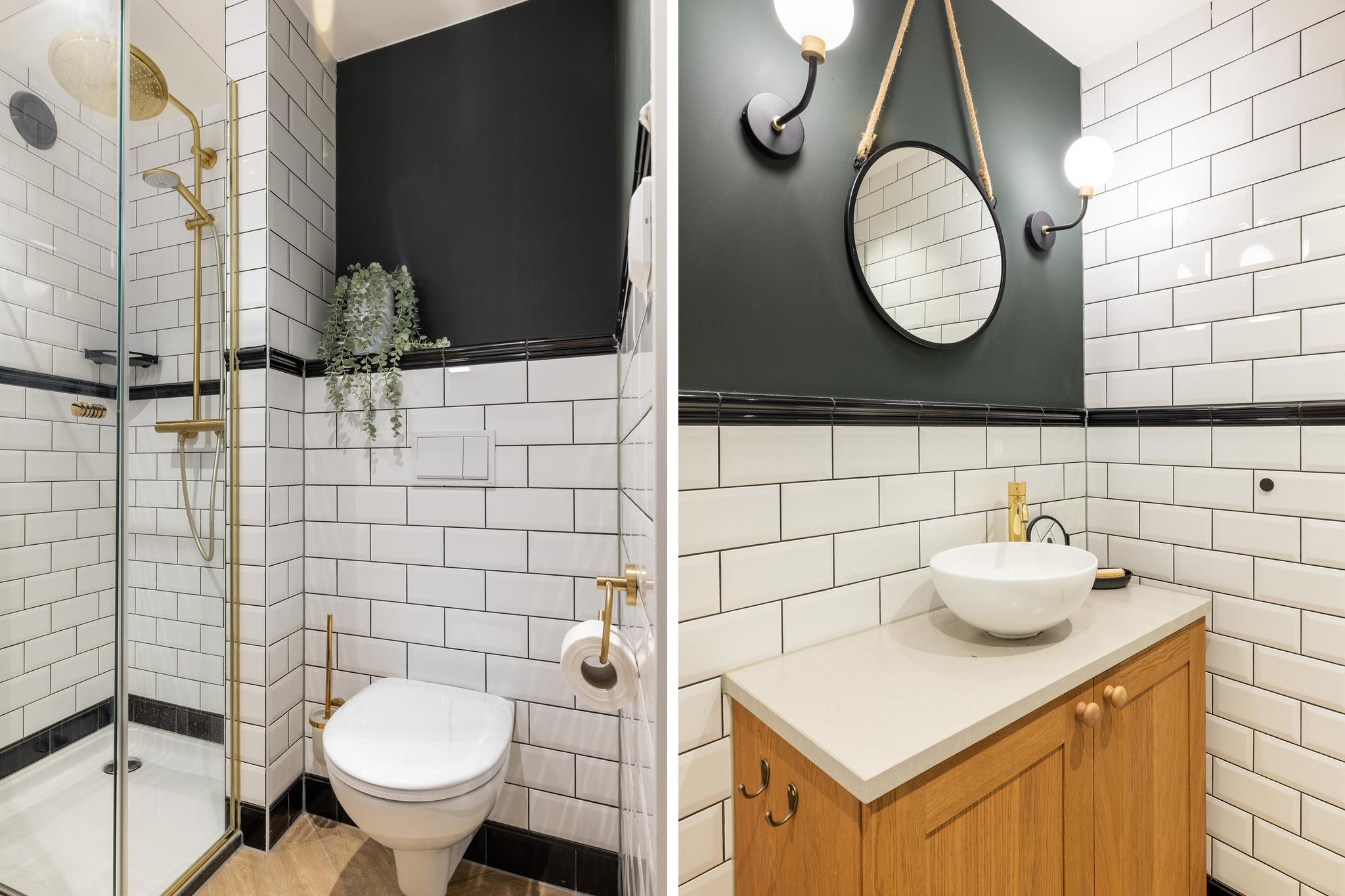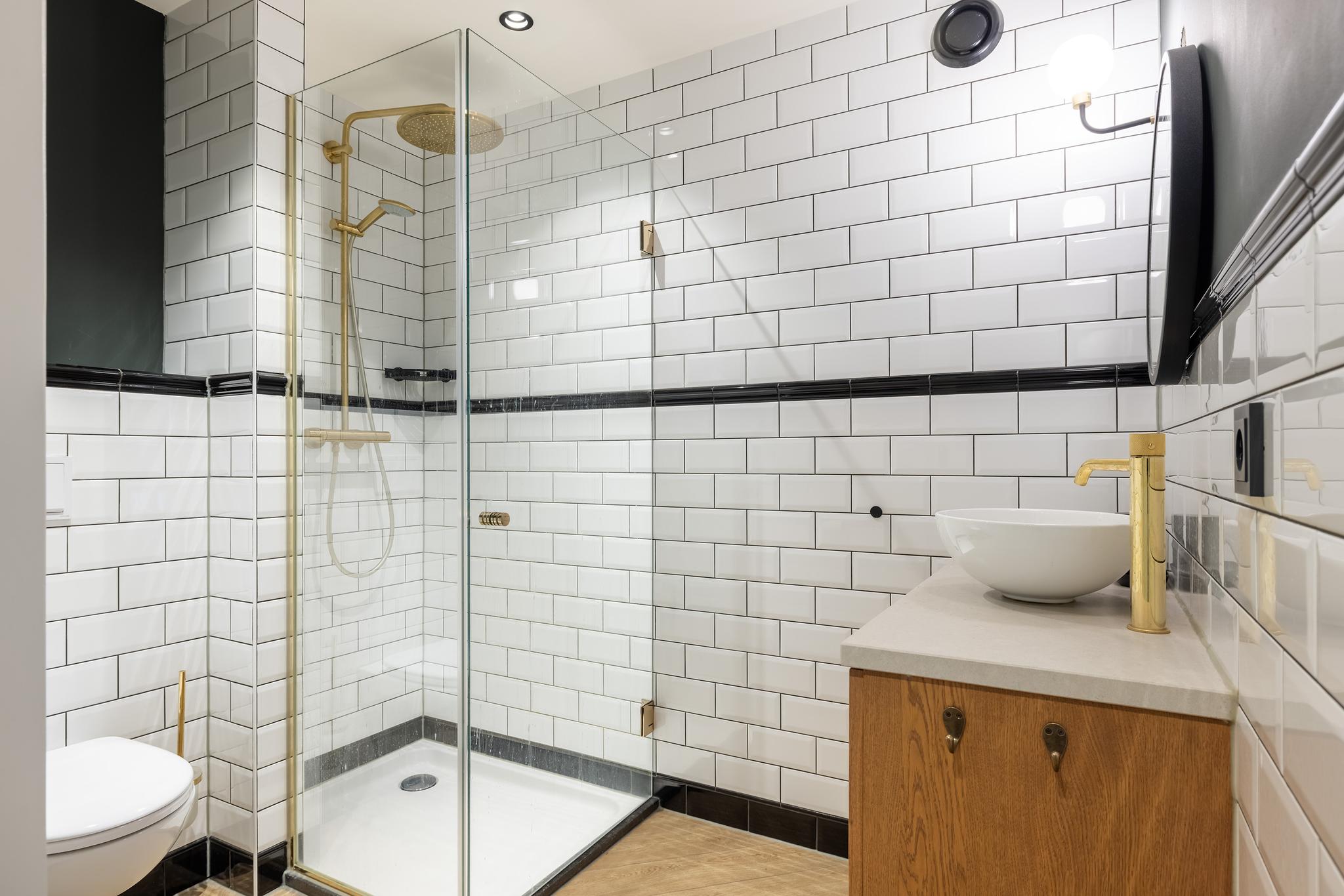 Grote badkamer met vrijstaand ligbad, dubbele wastafel met zuil, ronde inloopdouche, designradiator, lambrisering en inbouwspots.