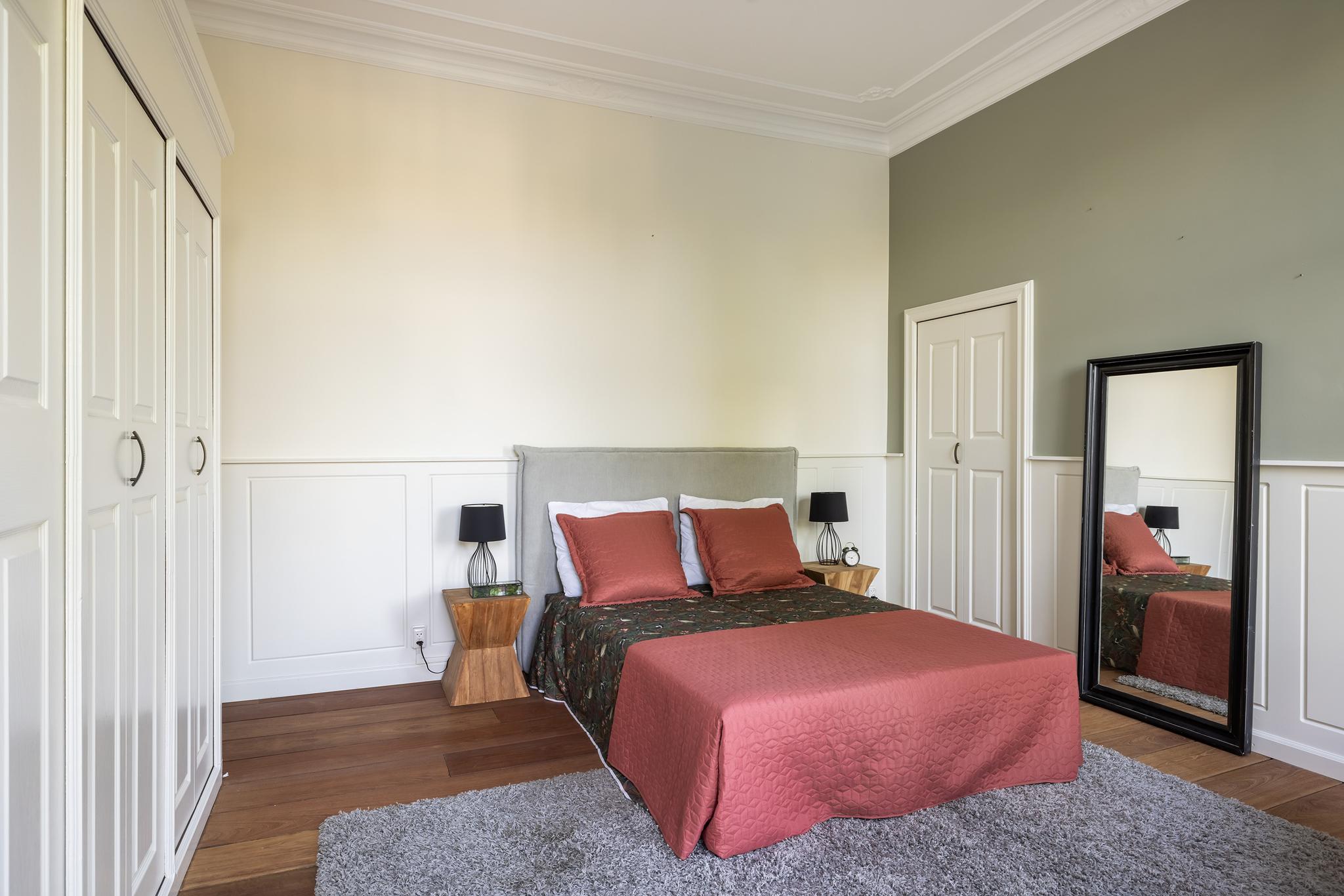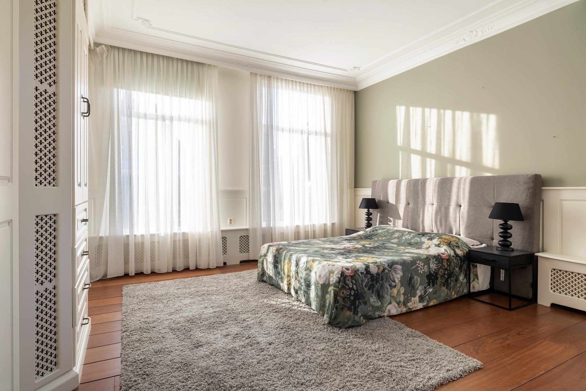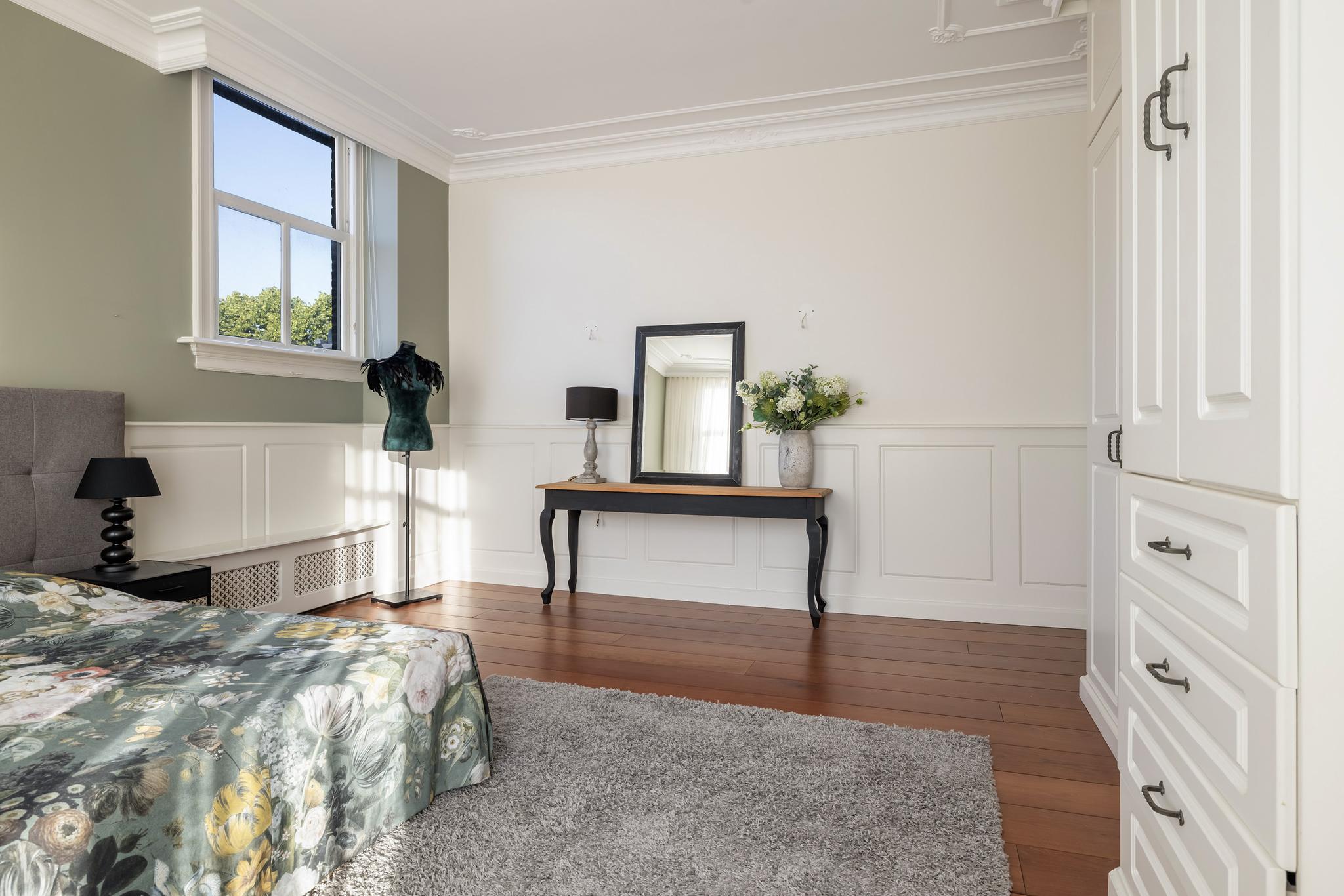 Ruime slaapkamer aan achterzijde, met grote kastenwand en hardhouten parketvloer.