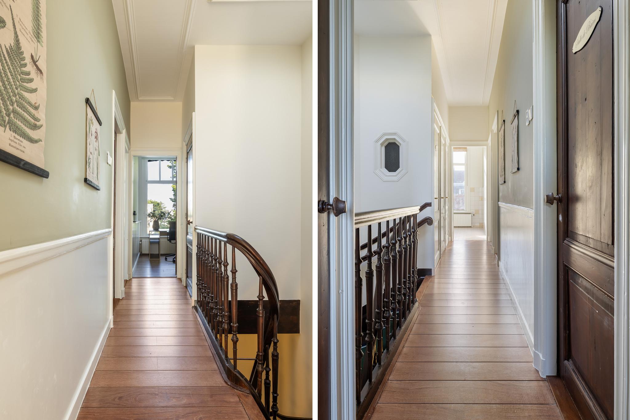 Lange overloop met toegang tot de voor- en achterkamer, toilet en garderobekast.