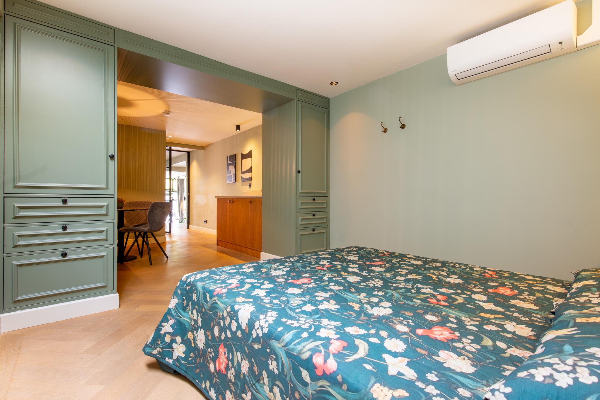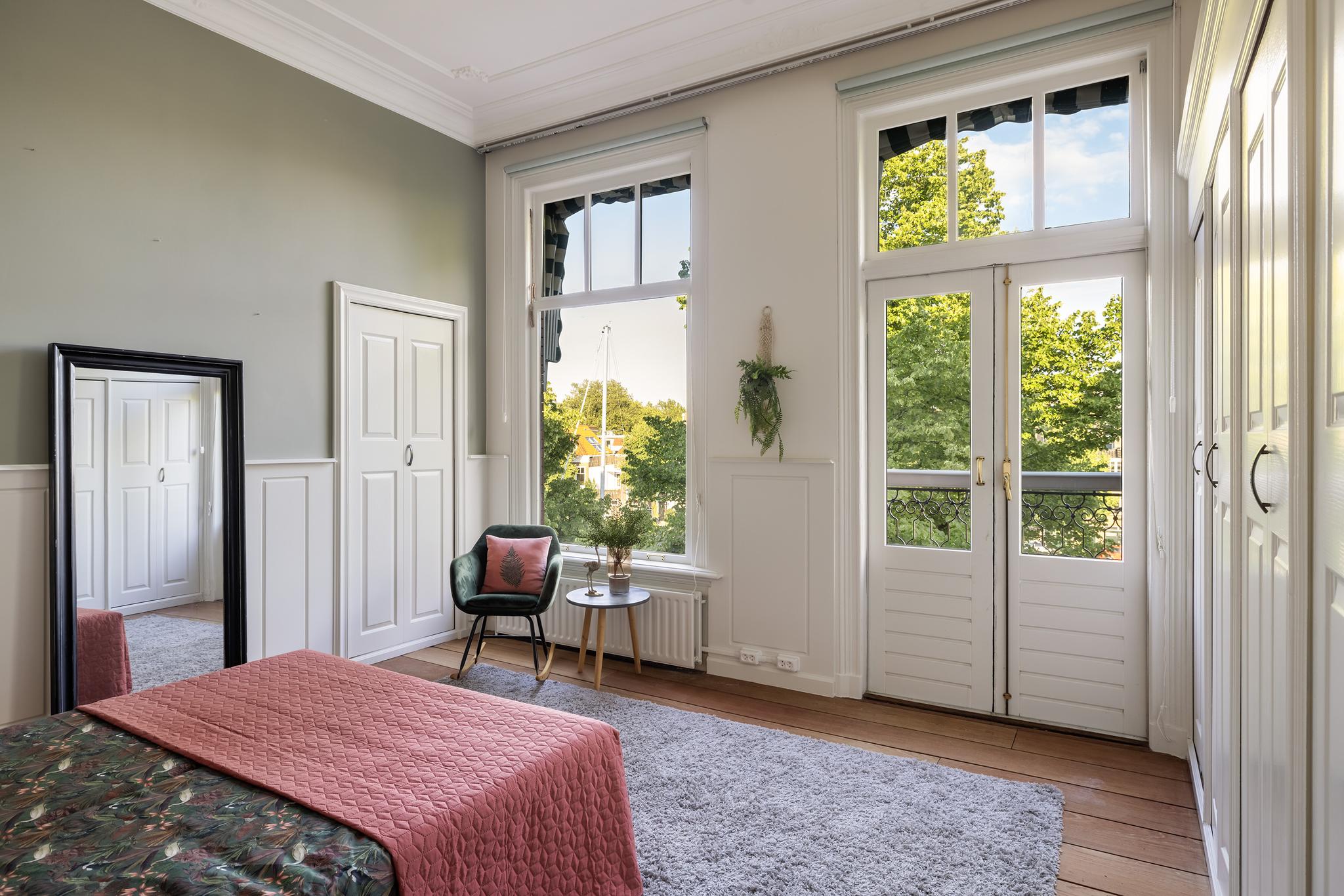 Slaapkamer aan voorzijde, met grote kastenwand en vaste kasten, hardhouten parketvloer en dubbele deuren naar het knusse balkon aan voorzijde. Om 's ochtends wakker te worden met zo'n uitzicht is werkelijk een droom.