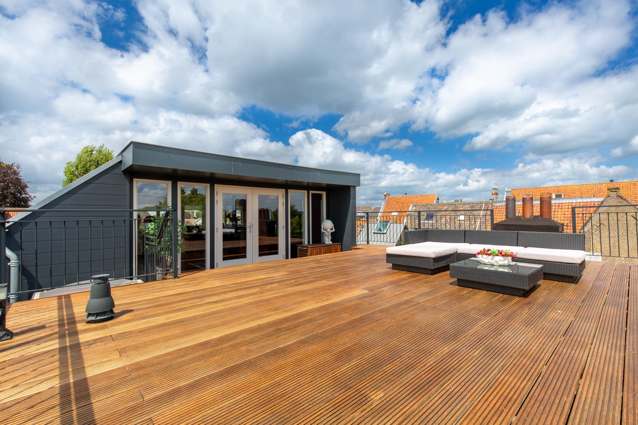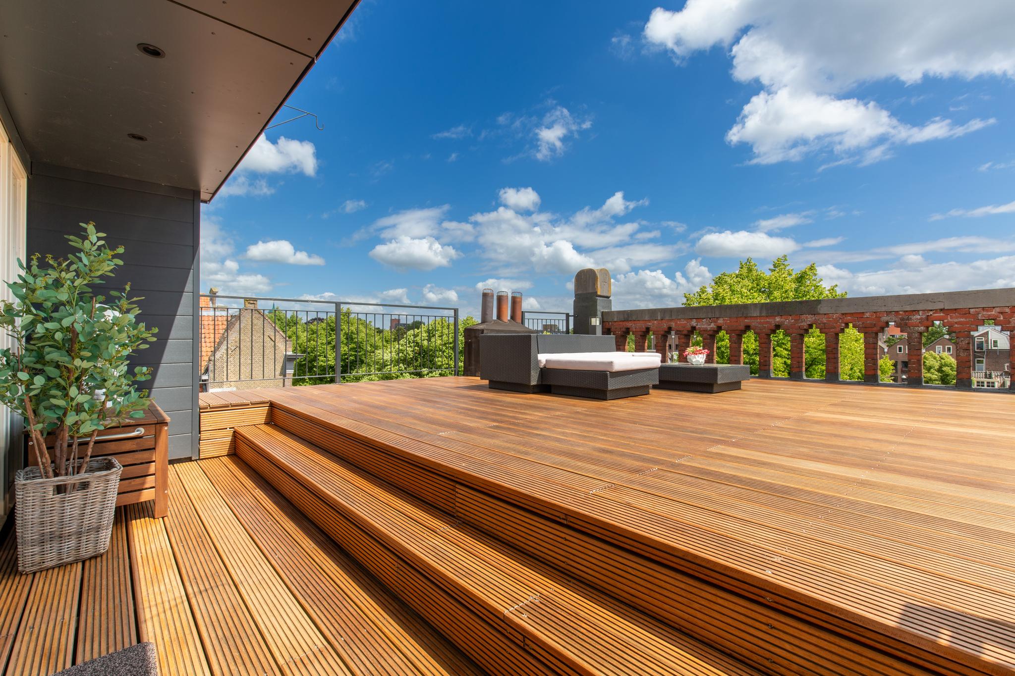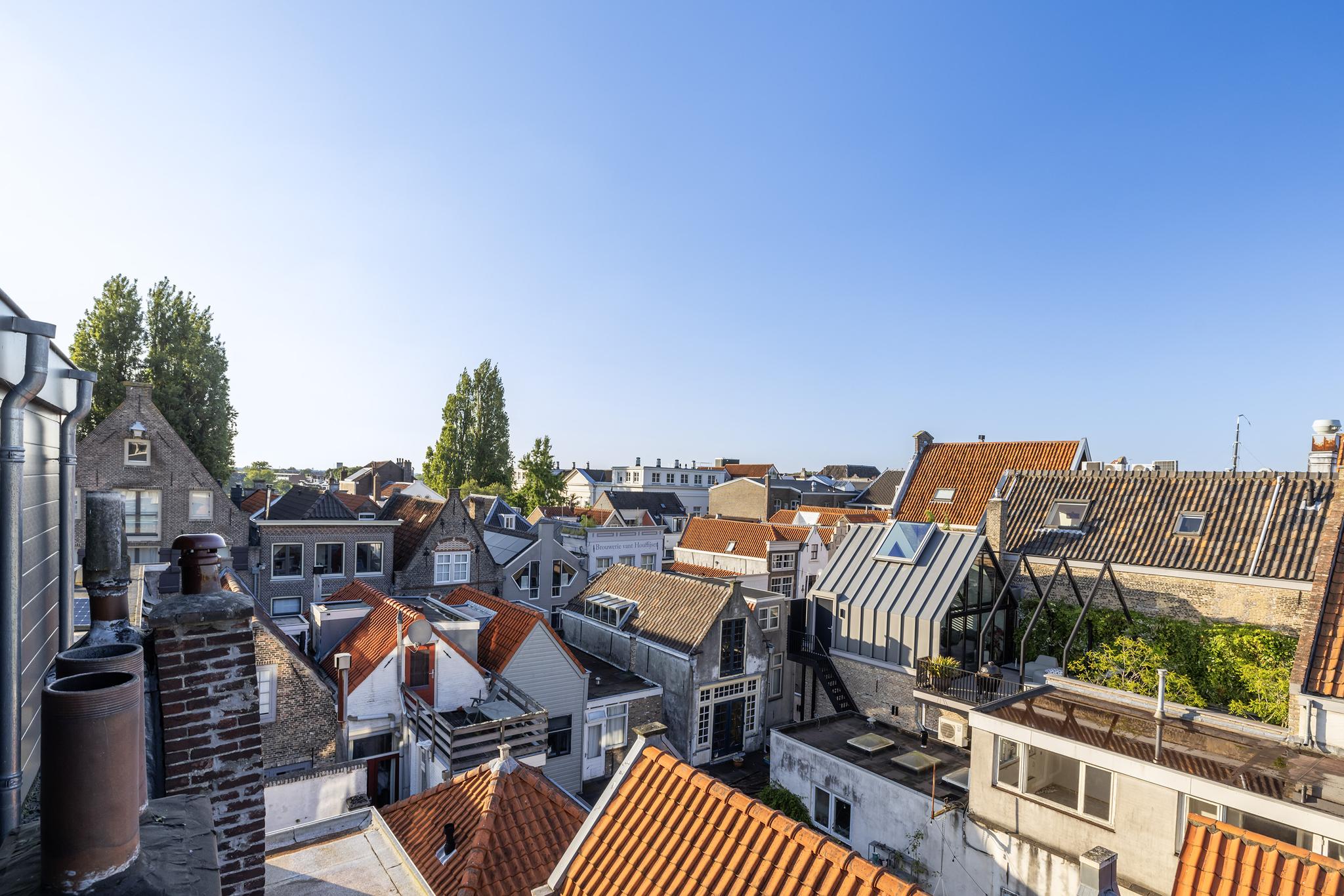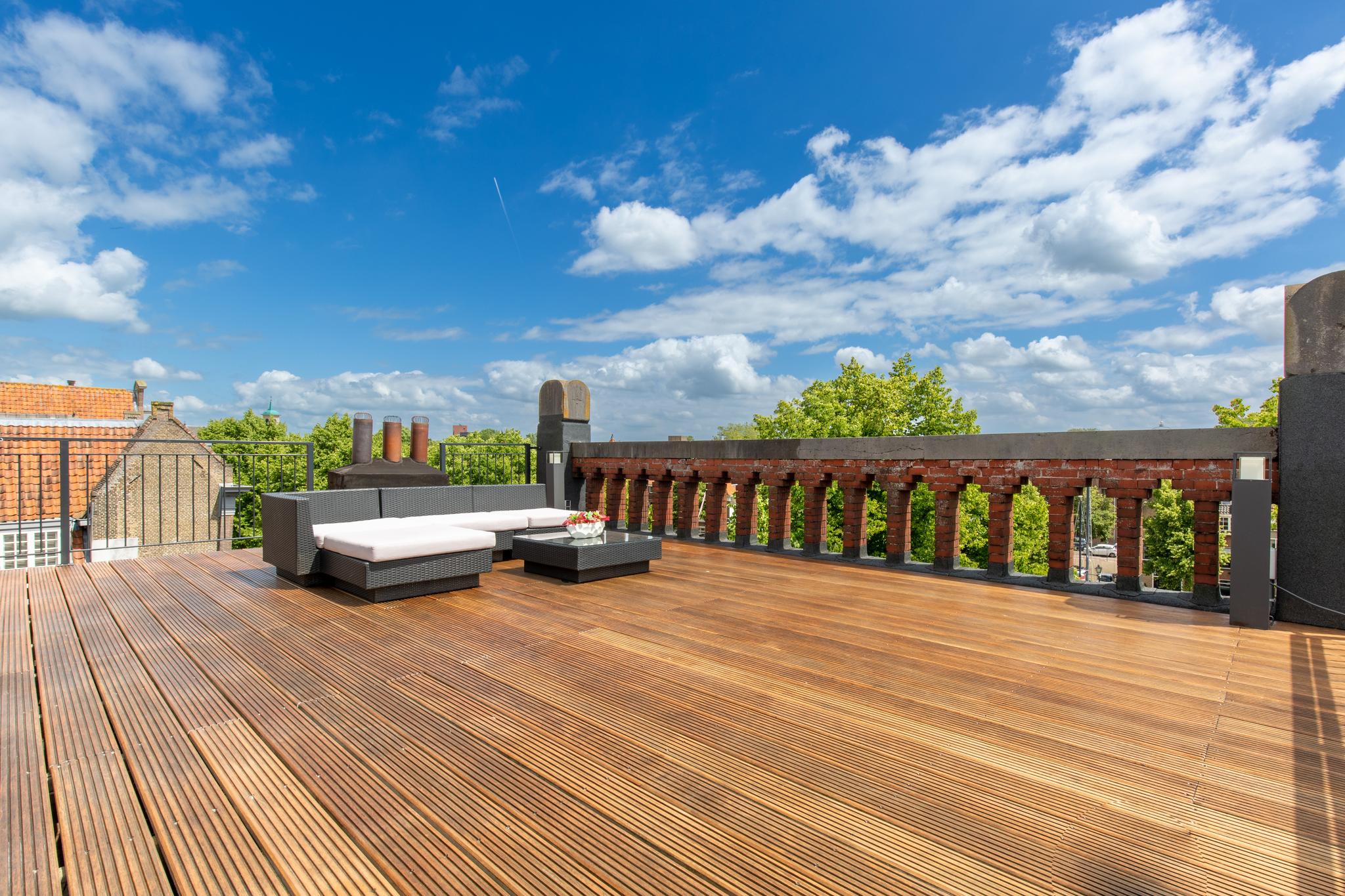 Deze woning heeft zoveel hoogtepunten, maar als er eentje bovenuit steekt, dan is het het heerlijke dakterras aan de voorzijde. Vanaf dit terras van zo'n 50 m² heb je een panoramisch uitzicht over de historische binnenstad van Dordrecht, zoiets zie je zelden. Daarnaast is het door de hoge ligging heerlijk beschut gelegen, waardoor je hier geniet van zon, rust en privacy. Het dakterras is afgewerkt met hardhouten vloerdelen.